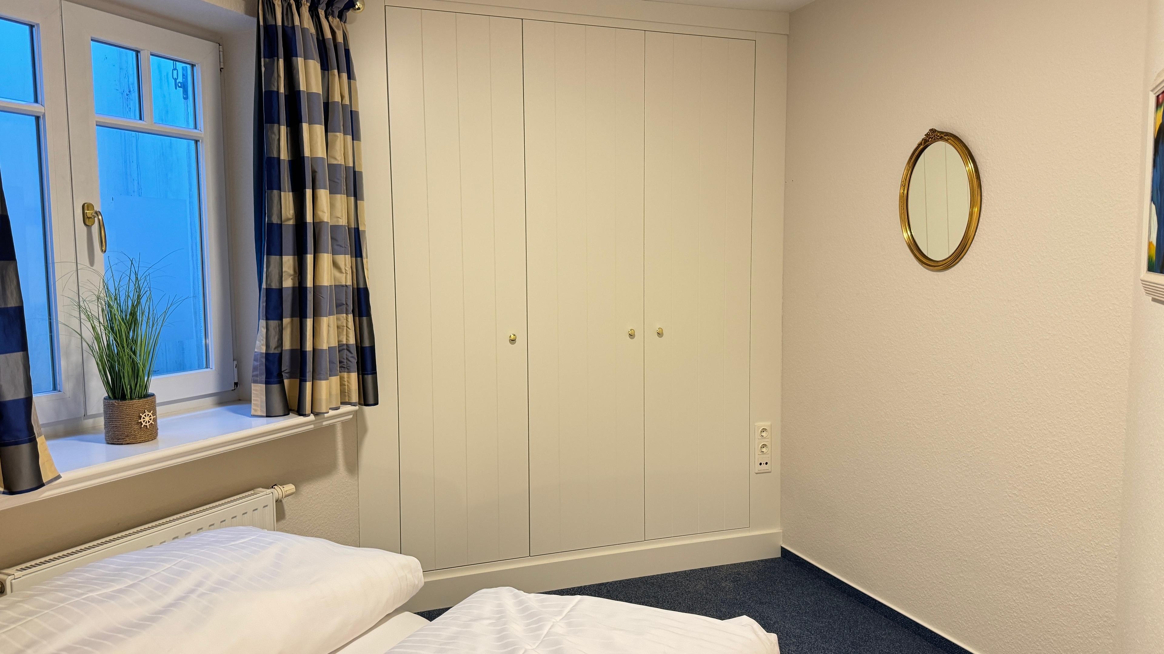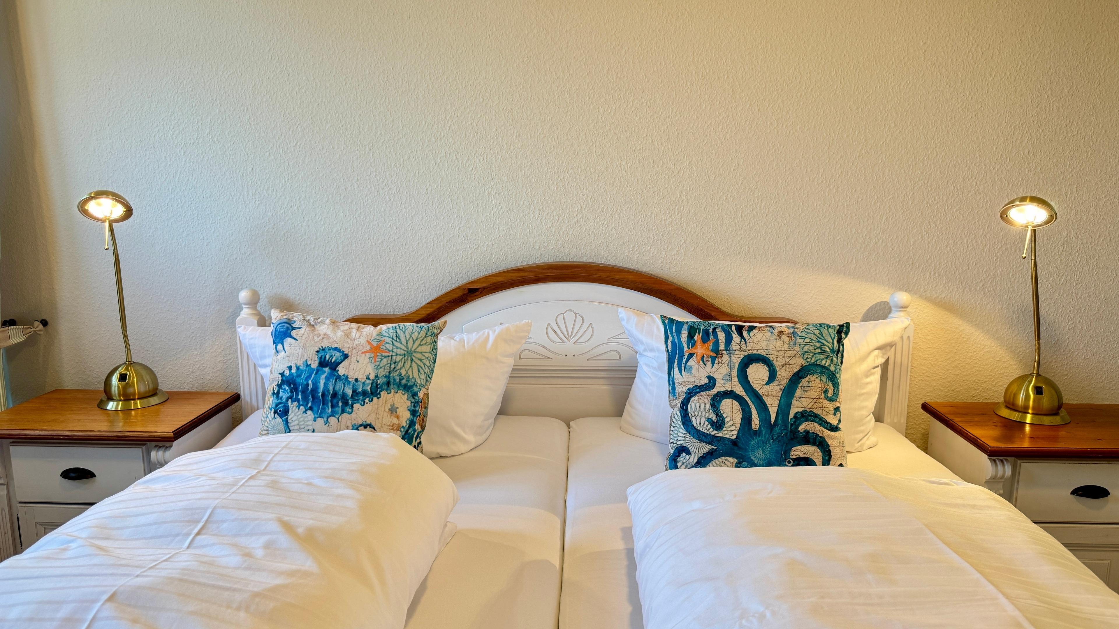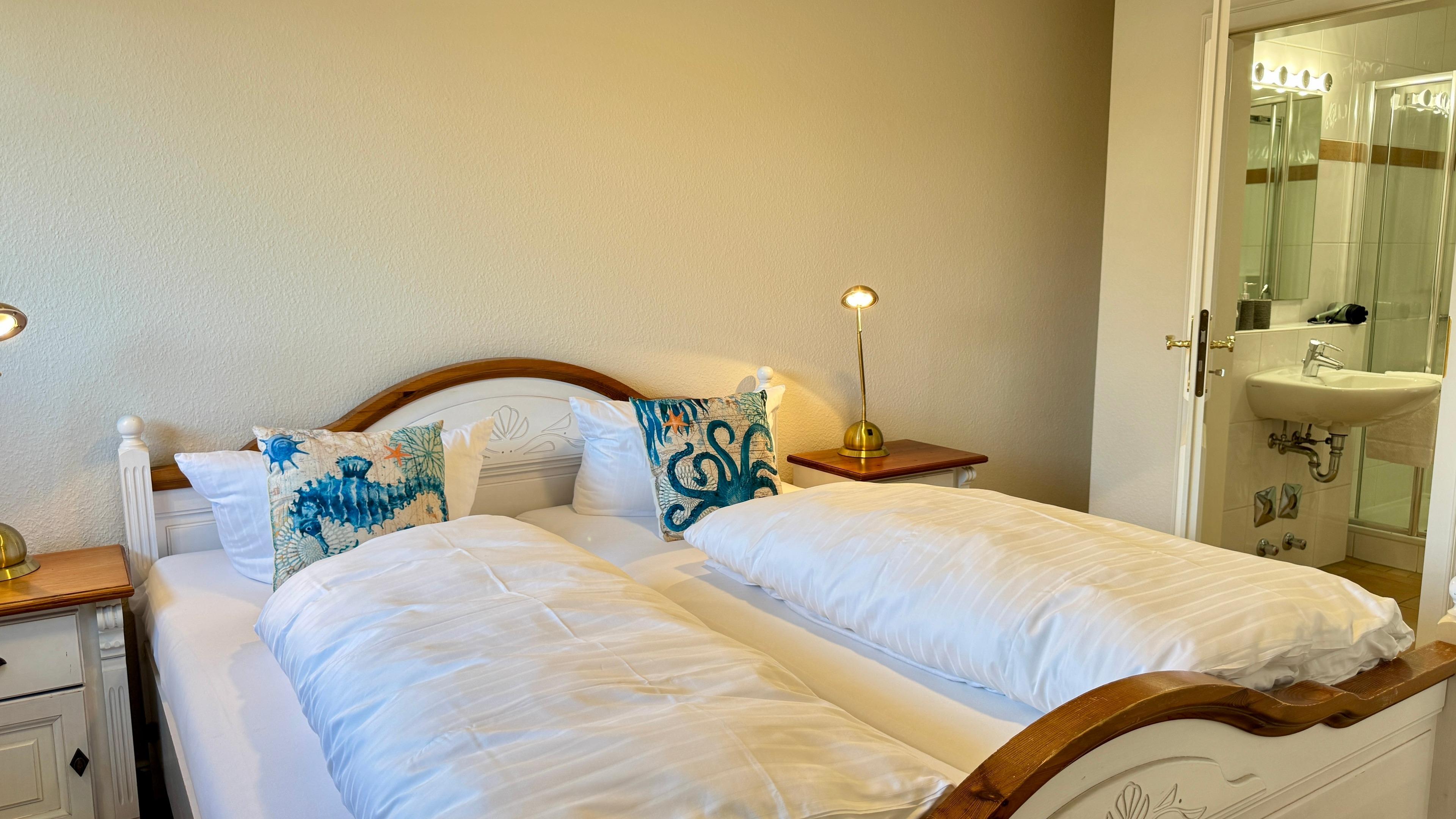 Im Erdgeschoss befinden sich der Wohnraum mit gemütlicher Sitz- und Essecke (im Erker), eine offene Küche, ein Schlafzimmer mit Doppelbett, ein Duschbad/WC sowie eine Südwest-Terrasse mit Strandkorb (April–Oktober). Im Untergeschoss erwarten Sie zwei weitere Schlafzimmer – eines mit Doppelbett, eines mit französischem Doppelbett – sowie ein Vollbad/WC mit Waschmaschine und Trockner.