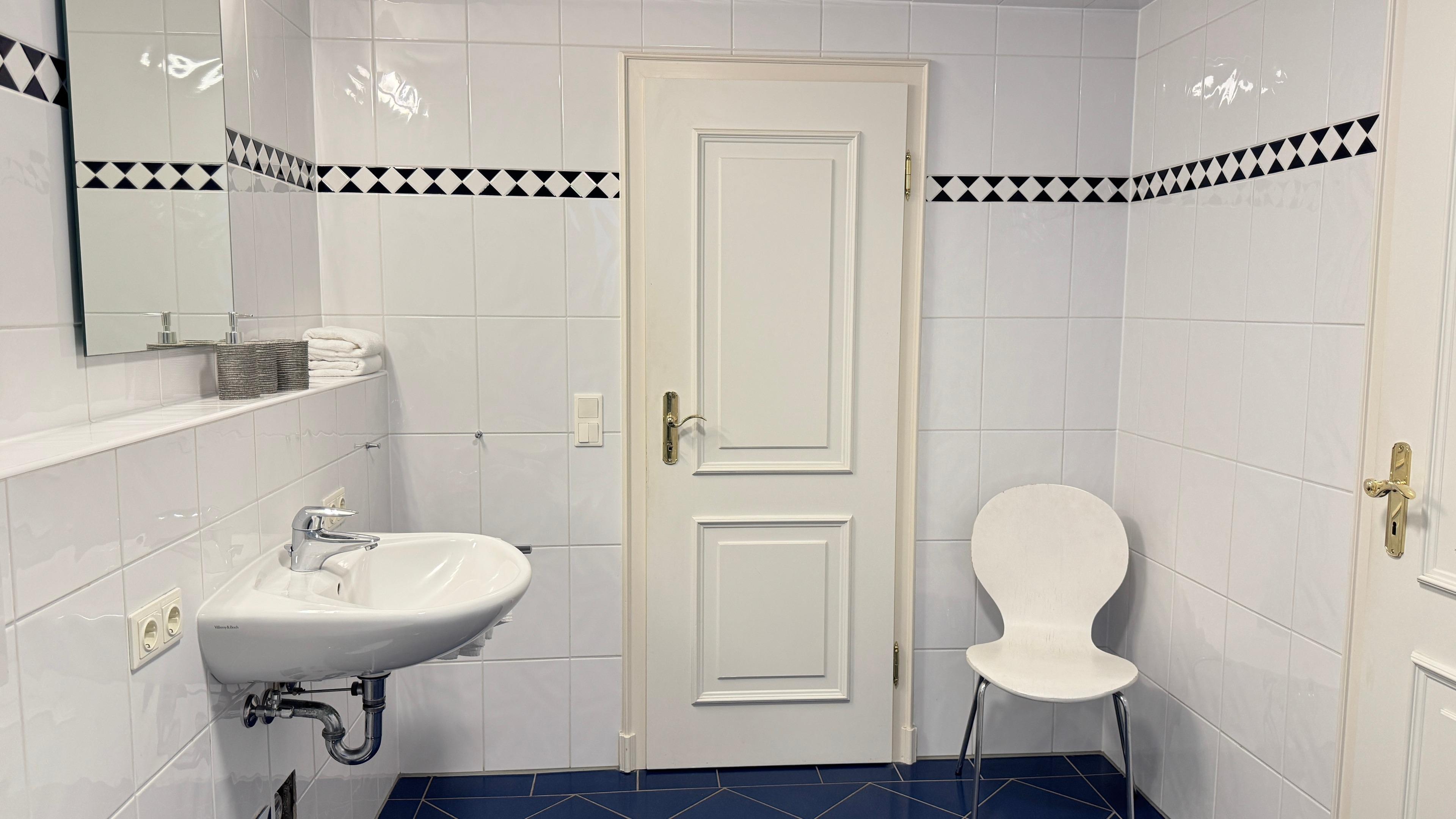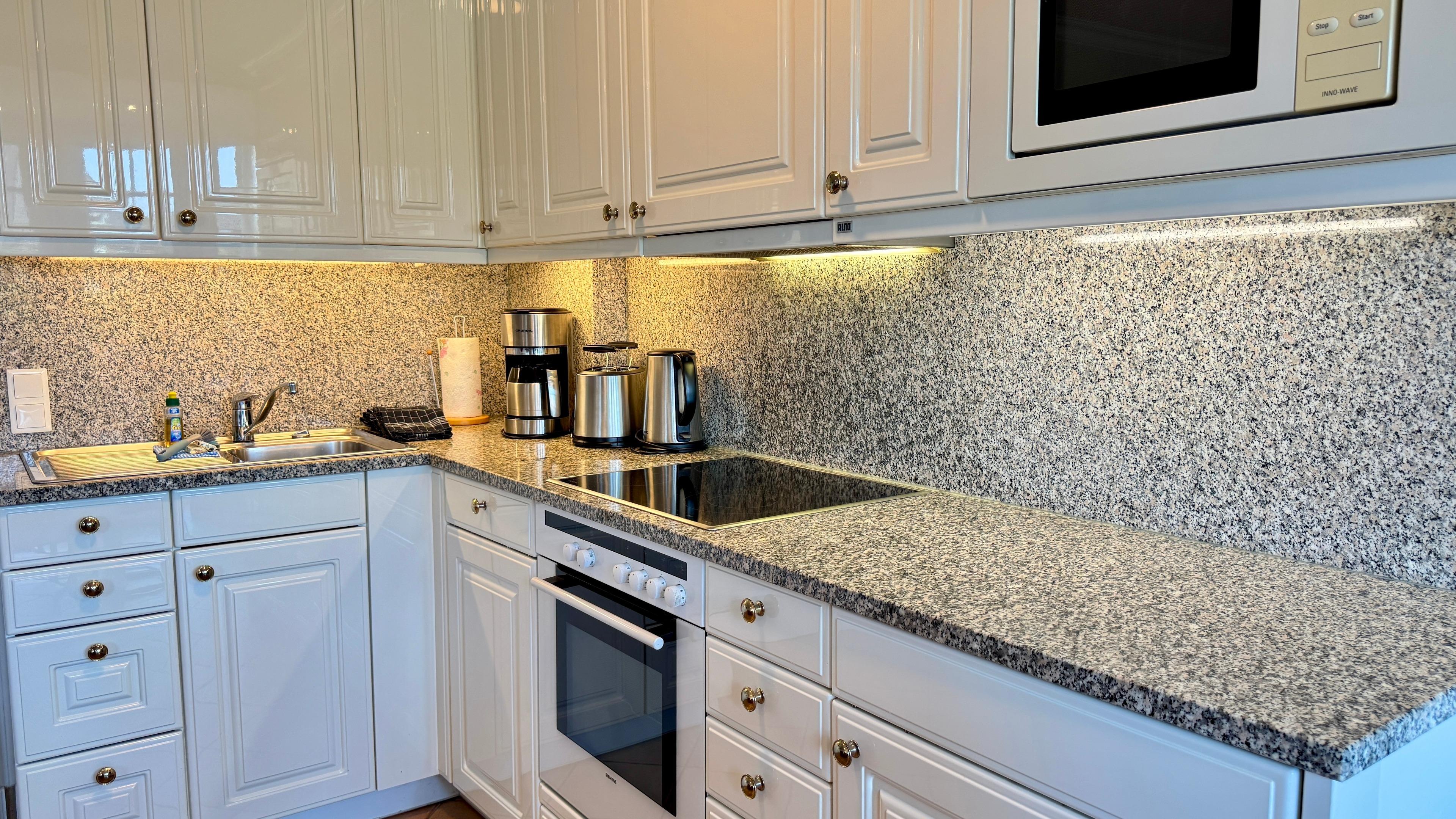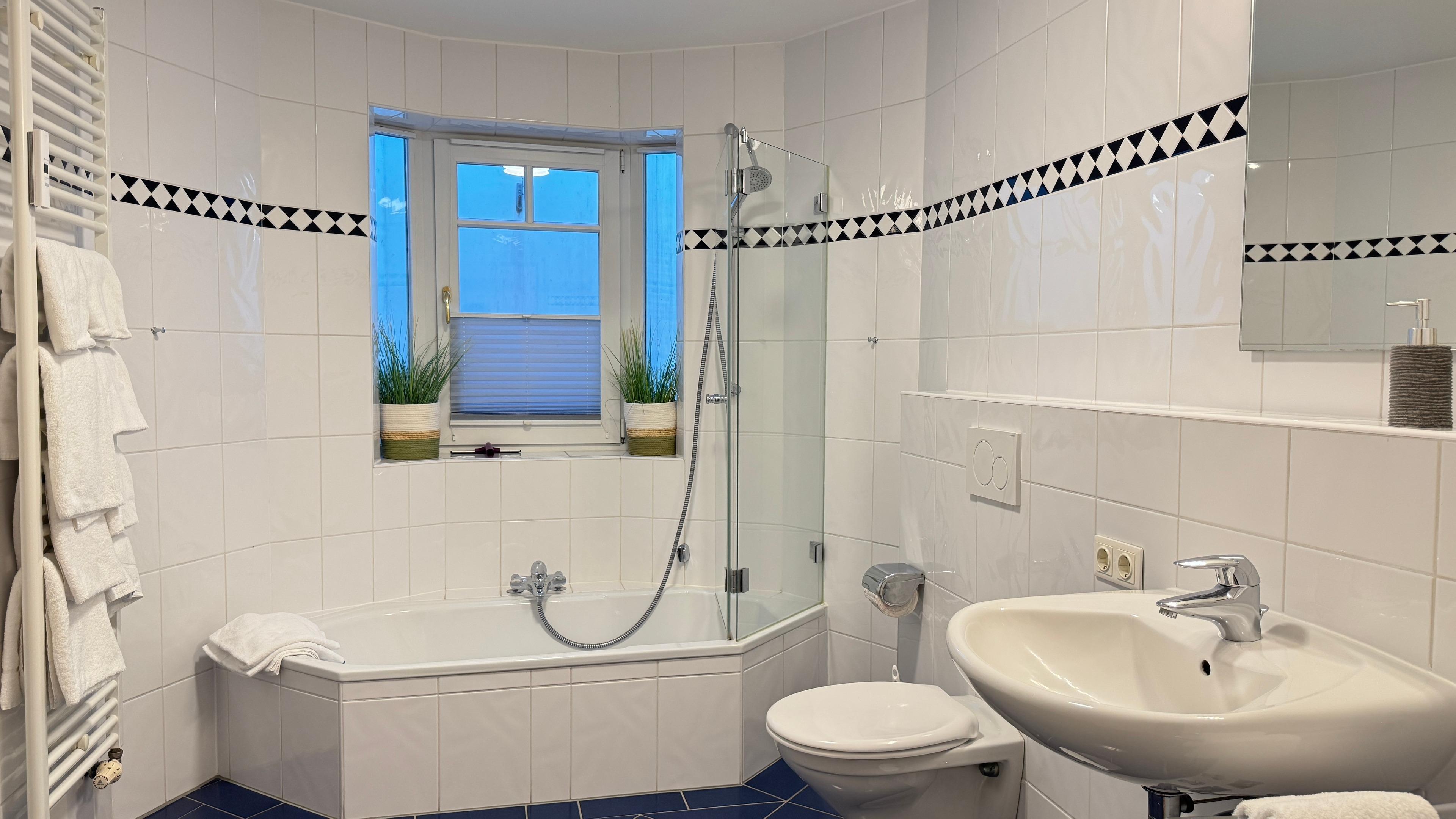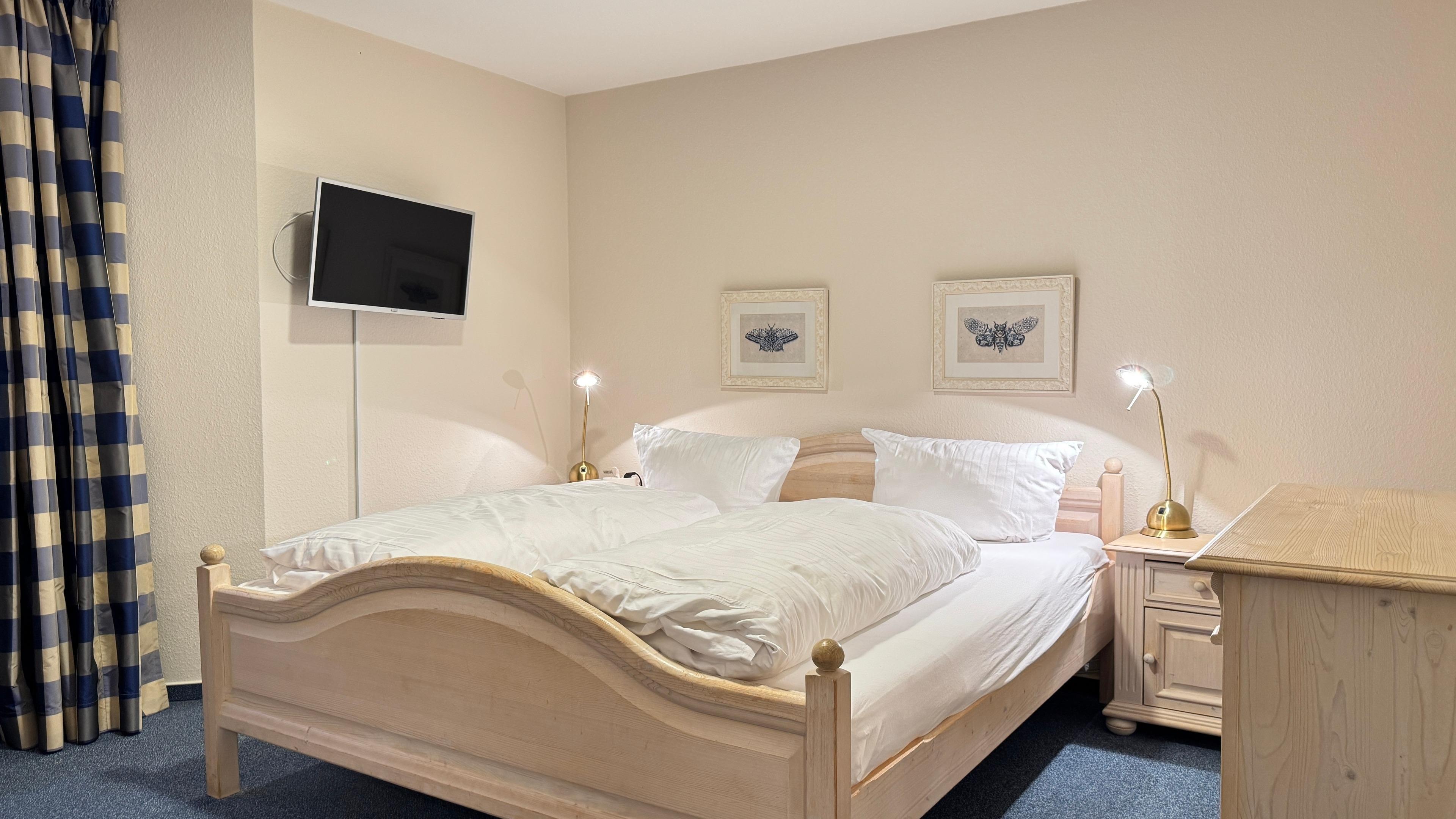 Im Erdgeschoss befinden sich der Wohnraum mit gemütlicher Sitz- und Essecke (im Erker), eine offene Küche, ein Schlafzimmer mit Doppelbett, ein Duschbad/WC sowie eine Südwest-Terrasse mit Strandkorb (April–Oktober). Im Untergeschoss erwarten Sie zwei weitere Schlafzimmer – eines mit Doppelbett, eines mit französischem Doppelbett – sowie ein Vollbad/WC mit Waschmaschine und Trockner.