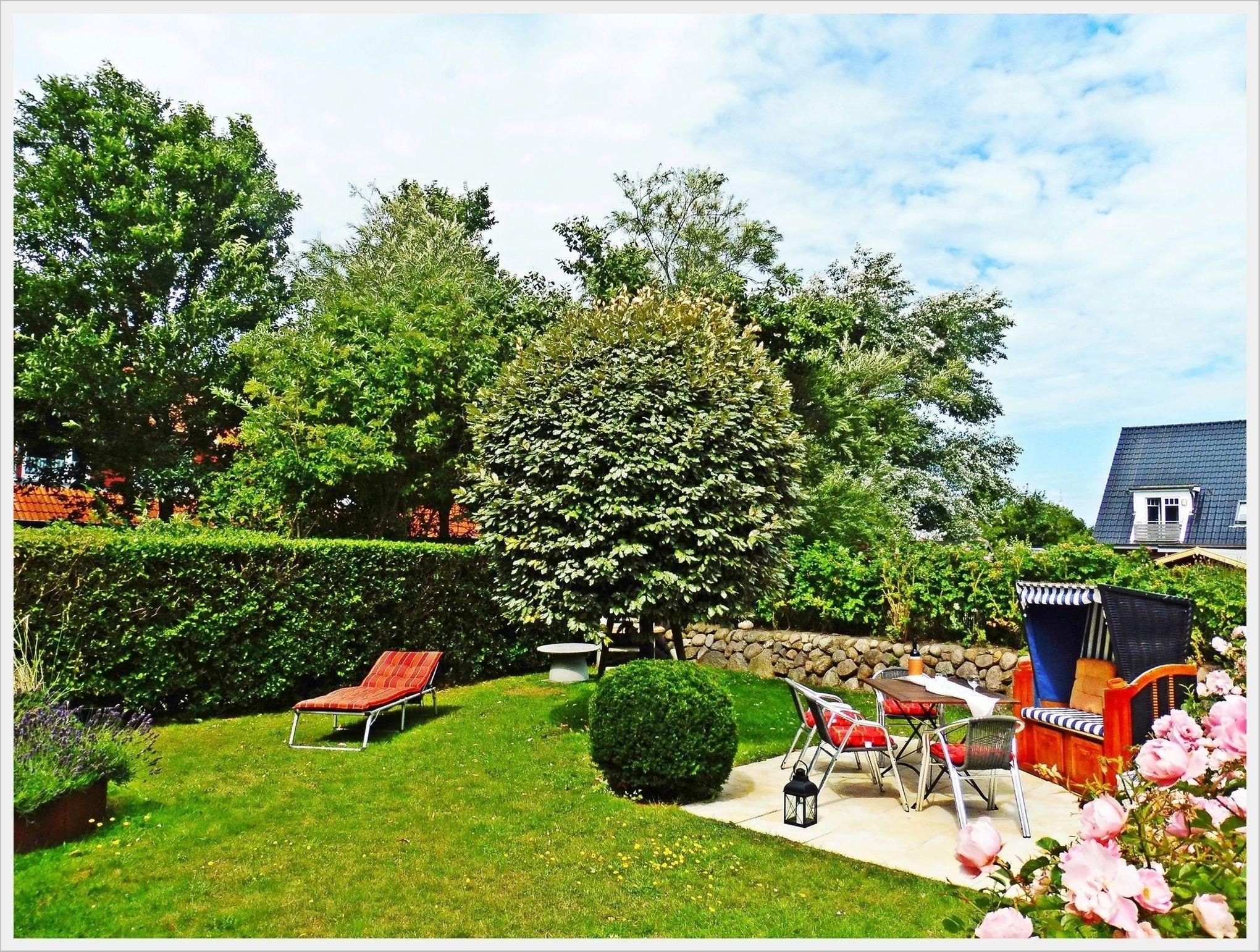 Großer umzäunter Rosengarten mit Sichtschutzhecken mit eigener Terrasse( nur hier ist das Rauchen gestattet. Gartenmöbel, Strandkorb, Liegewiese und Grill vorhanden. Kostenfreier Parkplatz auf dem Grundstück.