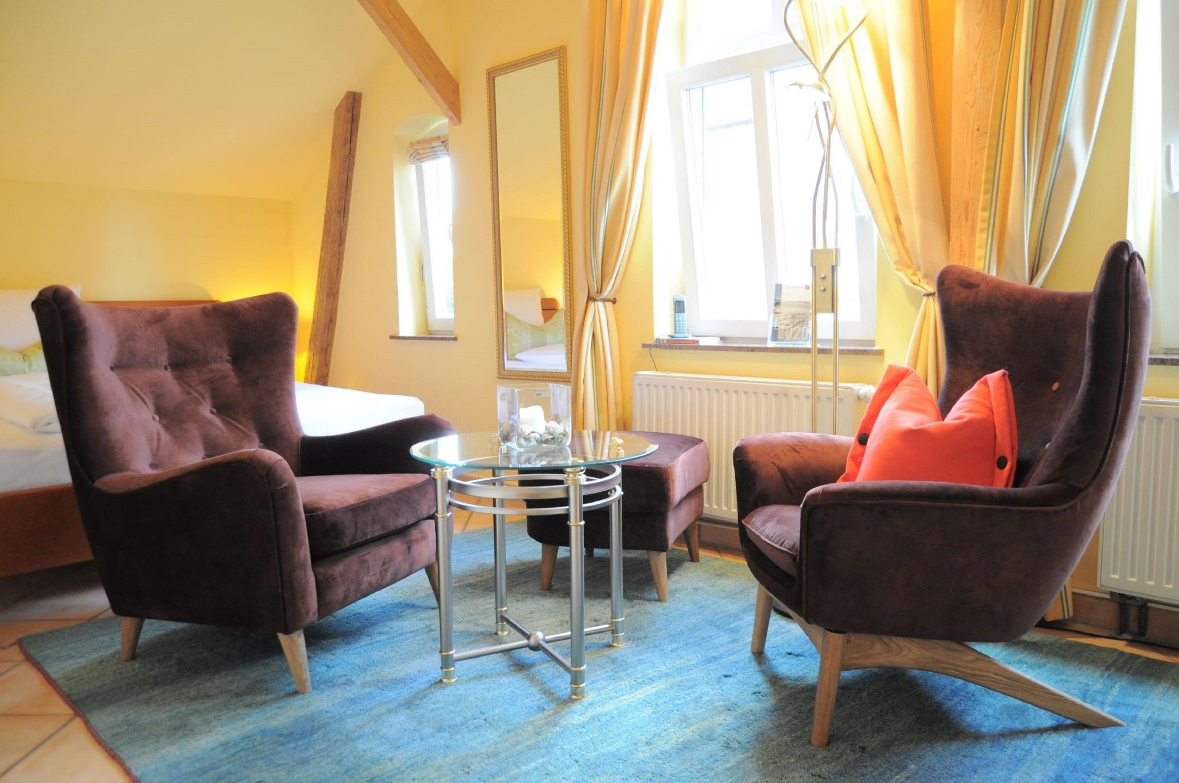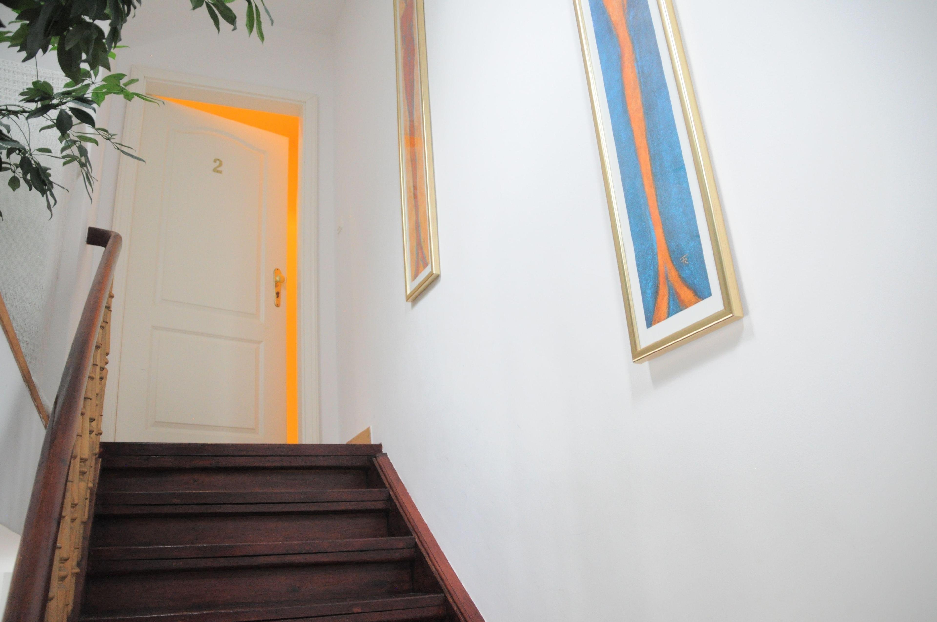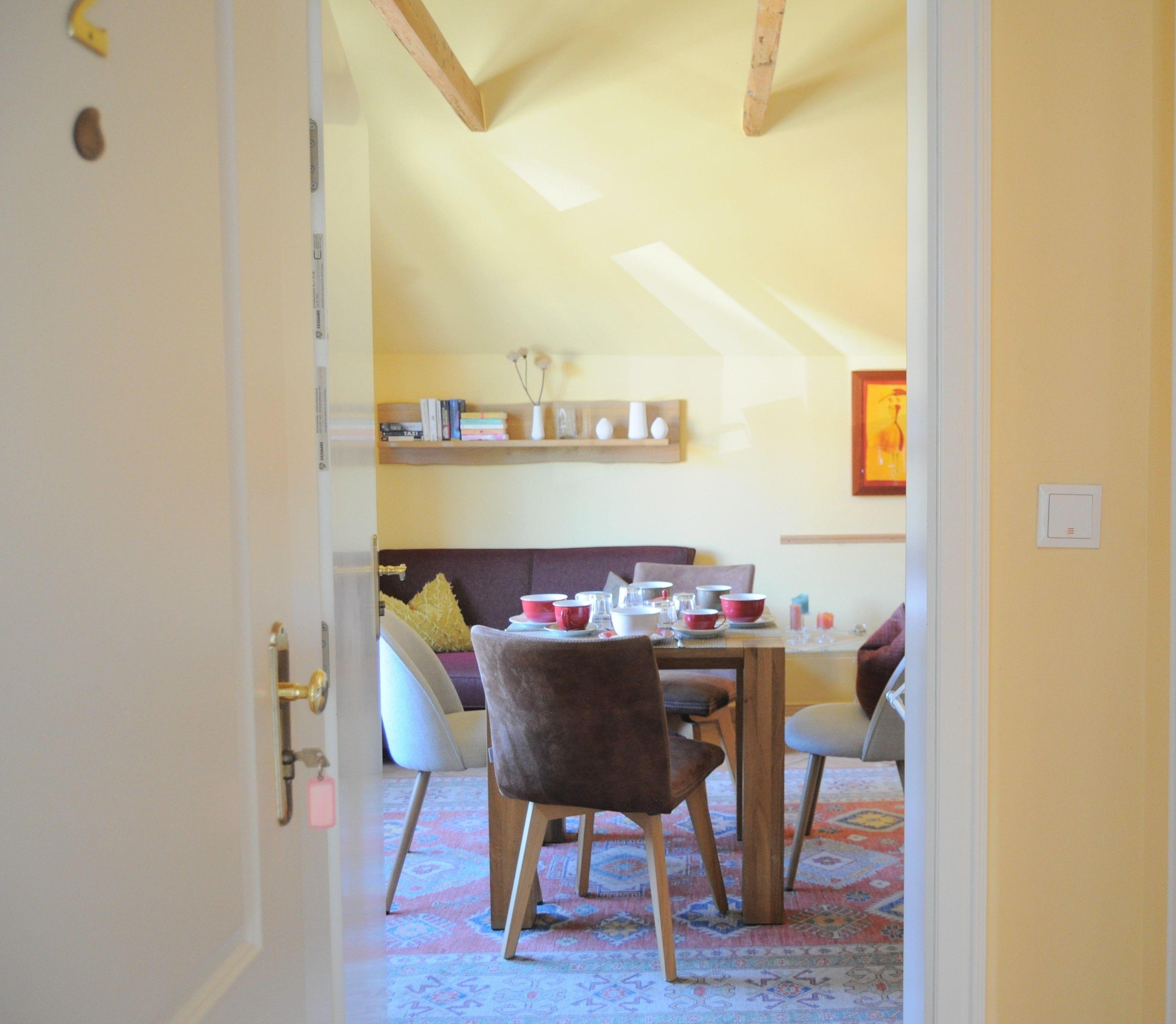 Das Appartement verfügt über einen Wohn-/Eßzimmer mit integrierter Küchenzeile, 2 Schlafzimmer mit komfortablen Doppelbetten (separate Matratzen) und 2 Duschbäder jeweils an die Schlafzimmer anschließend. Durch die im Altbau üblichen hohen Decken und den ausgebauten Dachstuhl mit sichtbaren Originalholzbalken sowie eine moderne, gemütliche Möblierung in kräftigen Farben mit klaren Formen ist der großzügige und wohnliche Charakter des Appartements entstanden.