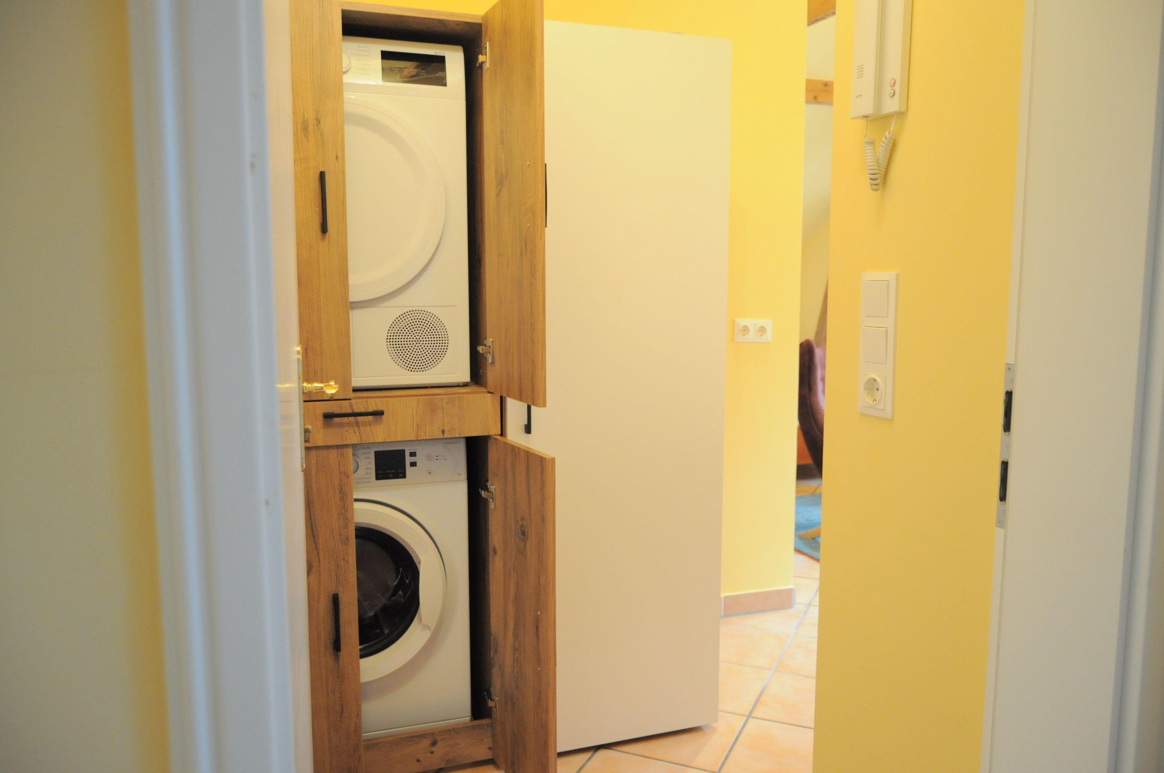 Die Küchenzeile verfügt über Geschirrspüler, Mikrowelle, 4-Platten-Cerankochfeld, Kühlschrank, Kaffeemaschine, Senseo und was sonst noch benötigt wird. Waschmaschine und Trockner sind ebenfalls vorhanden.