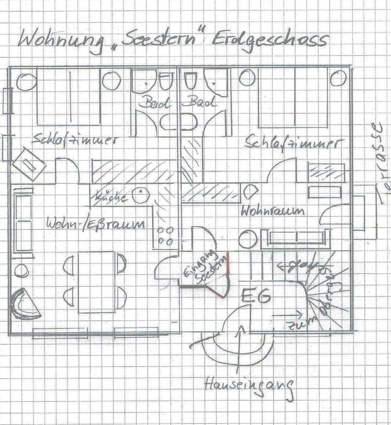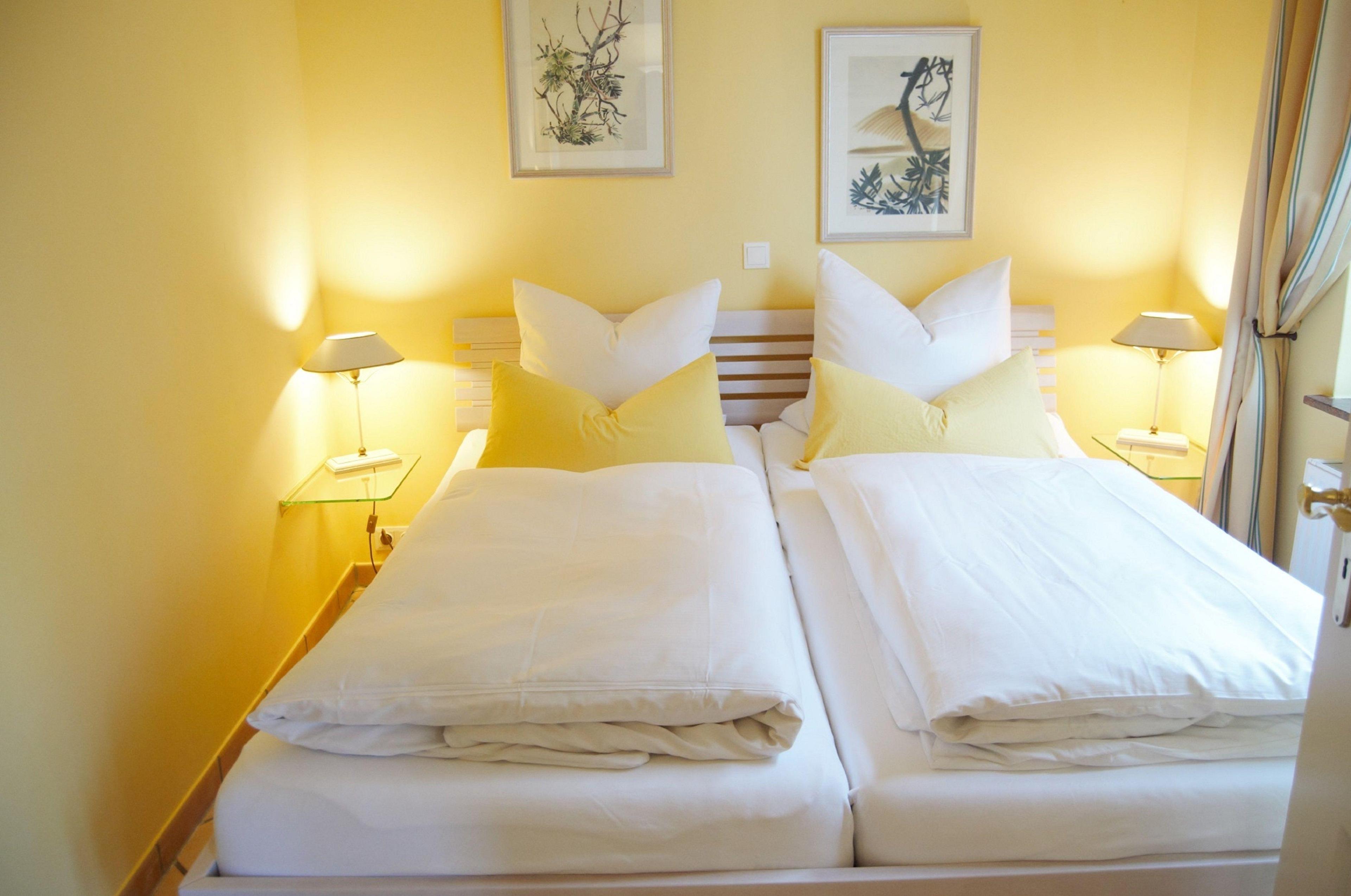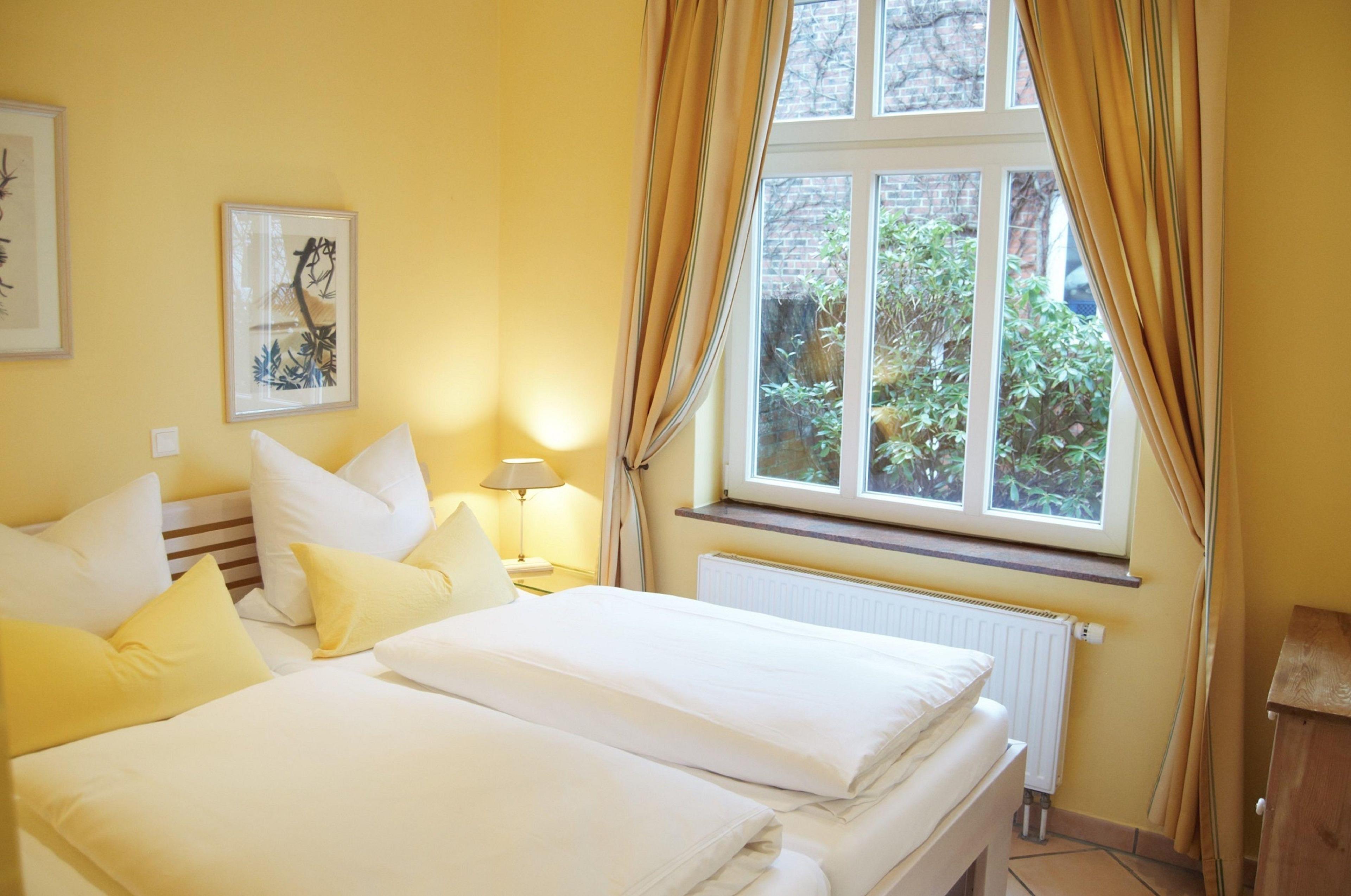 Das Appartement Seestern verfügt über ein Wohn-/Eßzimmer mit Küchenzeile, 2 Schlafzimmer mit Doppelbetten (separate Matratzen jeweils 90x200cm) 2 Duschbäder sowie einem kleineren, gemütlichen Wohnraum mit Schlafcouch und Ausgang zur Terrasse. Durch die im Altbau üblichen hohen Decken sowie die hochwertige Möblierung in hellen, kräftigen Farben mit klaren, modernen Formen ist der großzügige und wohnliche Charakter des Appartements entstanden.