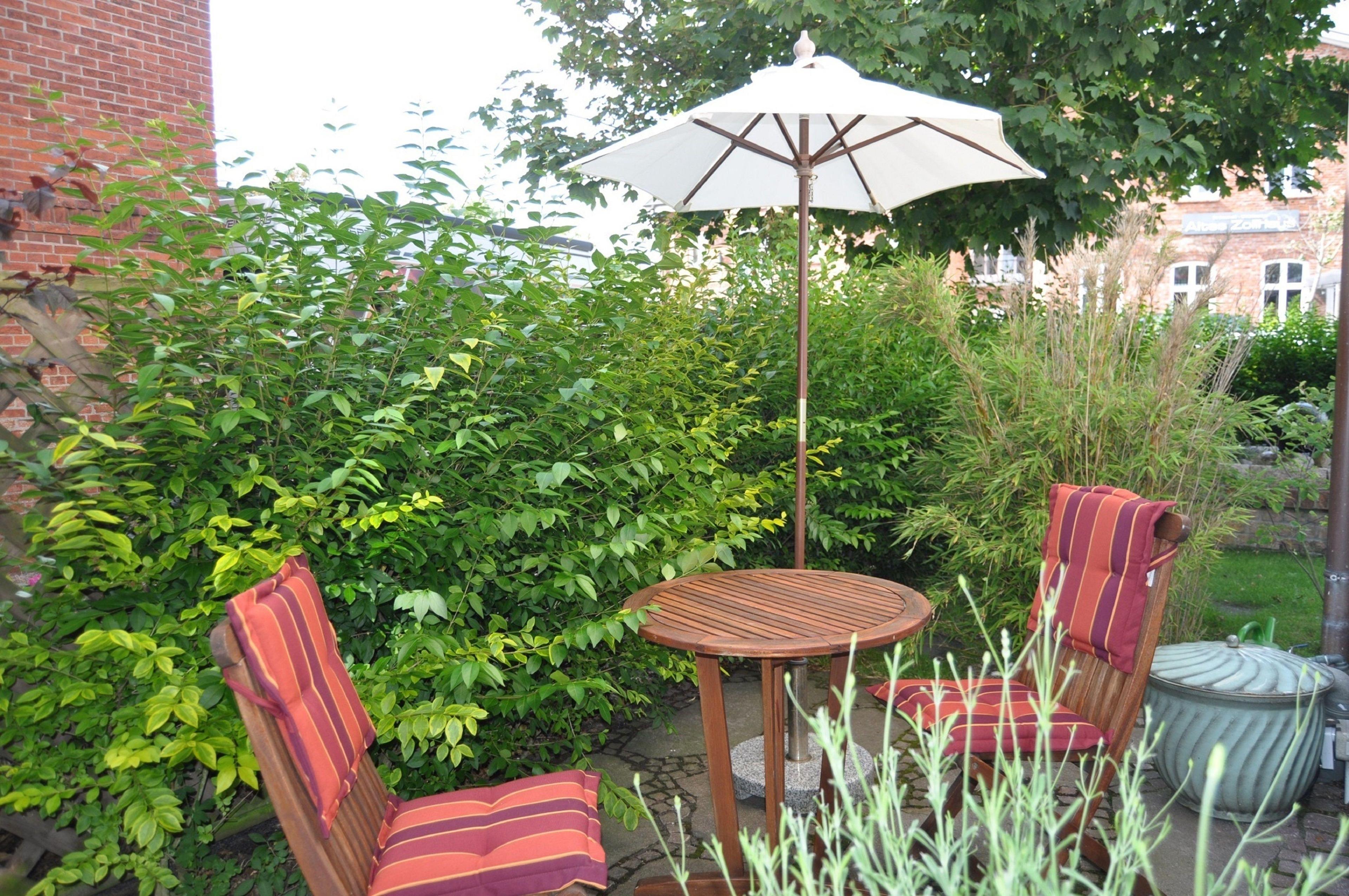 Die kleine Terrasse Richtung Westen ist mit Holzmöbeln ausgestattet.