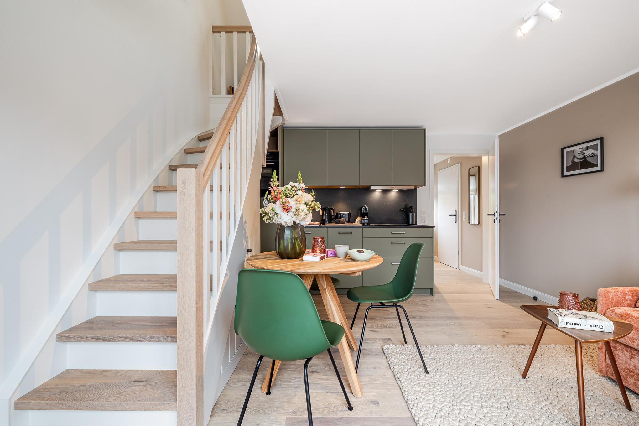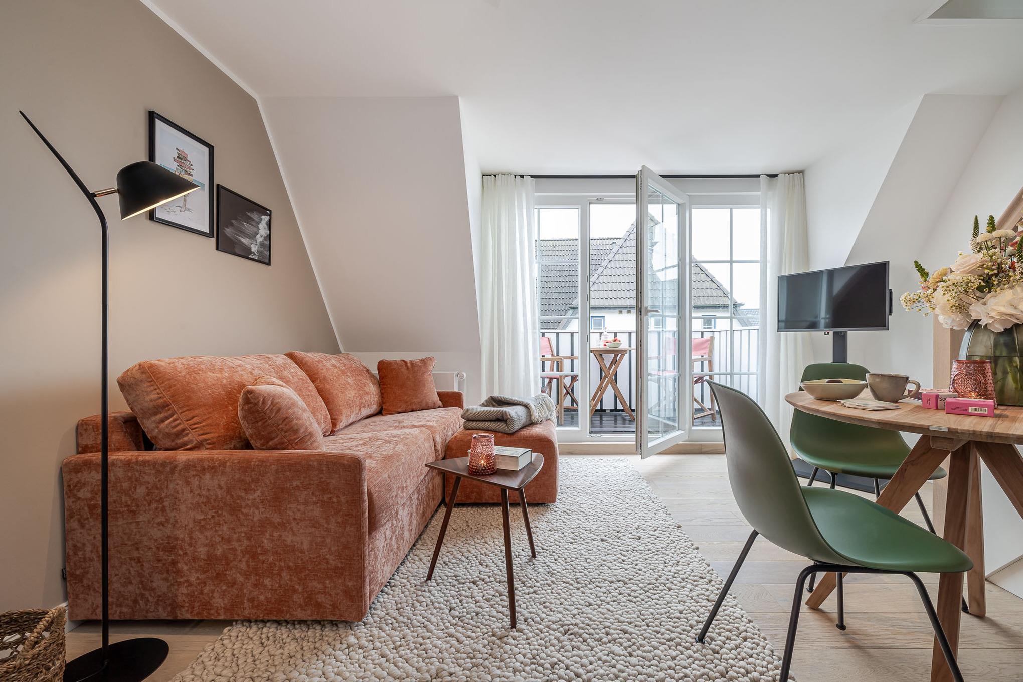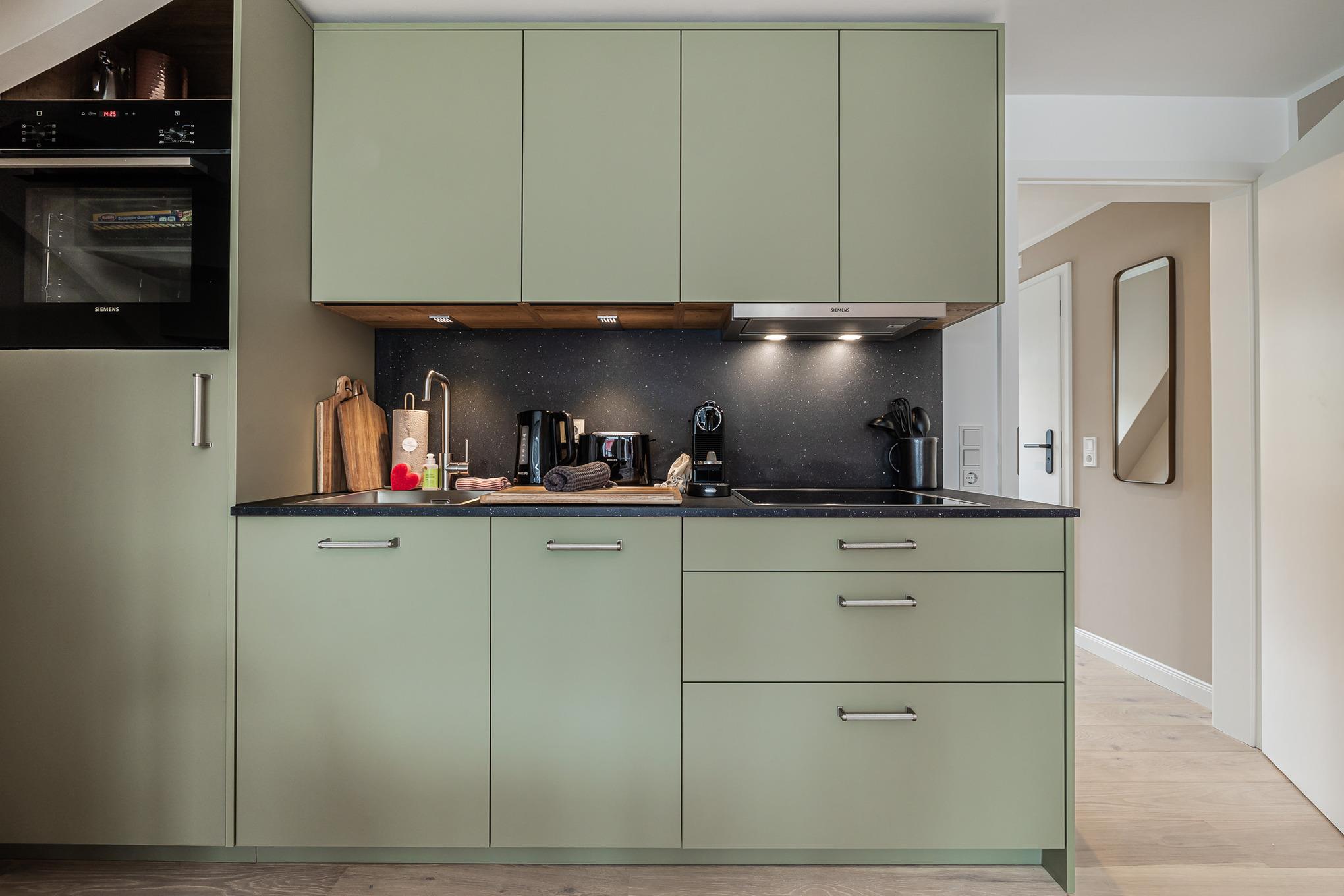 Die kompakte Küche beweist: Tiny but shiny. Sie ist mit Geräten namhafter Hersteller wie Siemens ausgestattet und bietet alles, was es für die Zubereitung köstlicher Mahlzeiten braucht. Von Mai bis Oktober genießen Sie diese am liebsten auf dem möblierten Balkon – umgeben von frischer Nordseeluft, zu jeder Tageszeit.