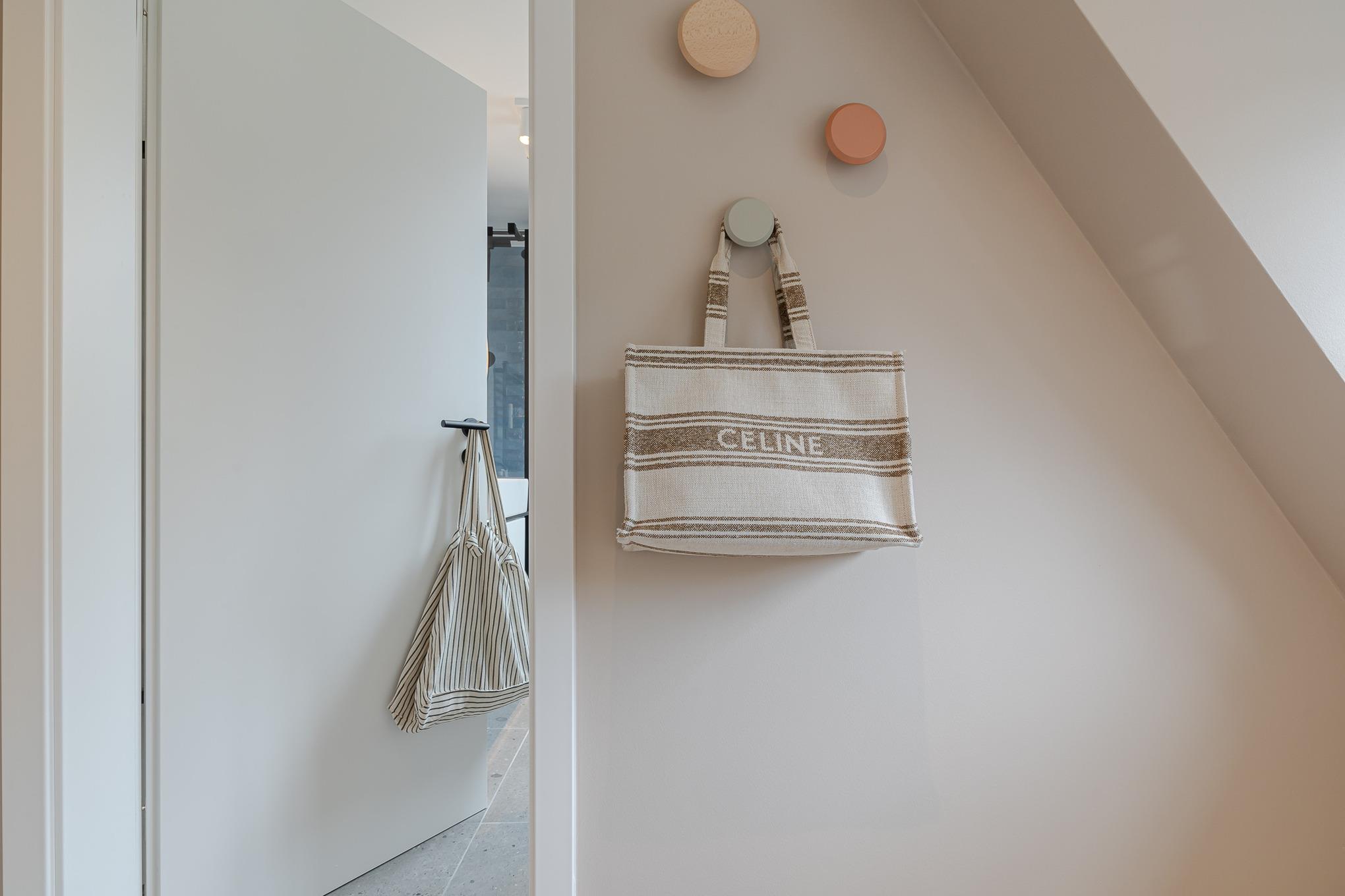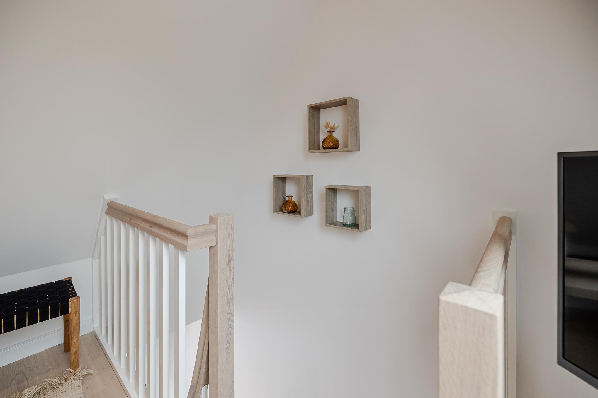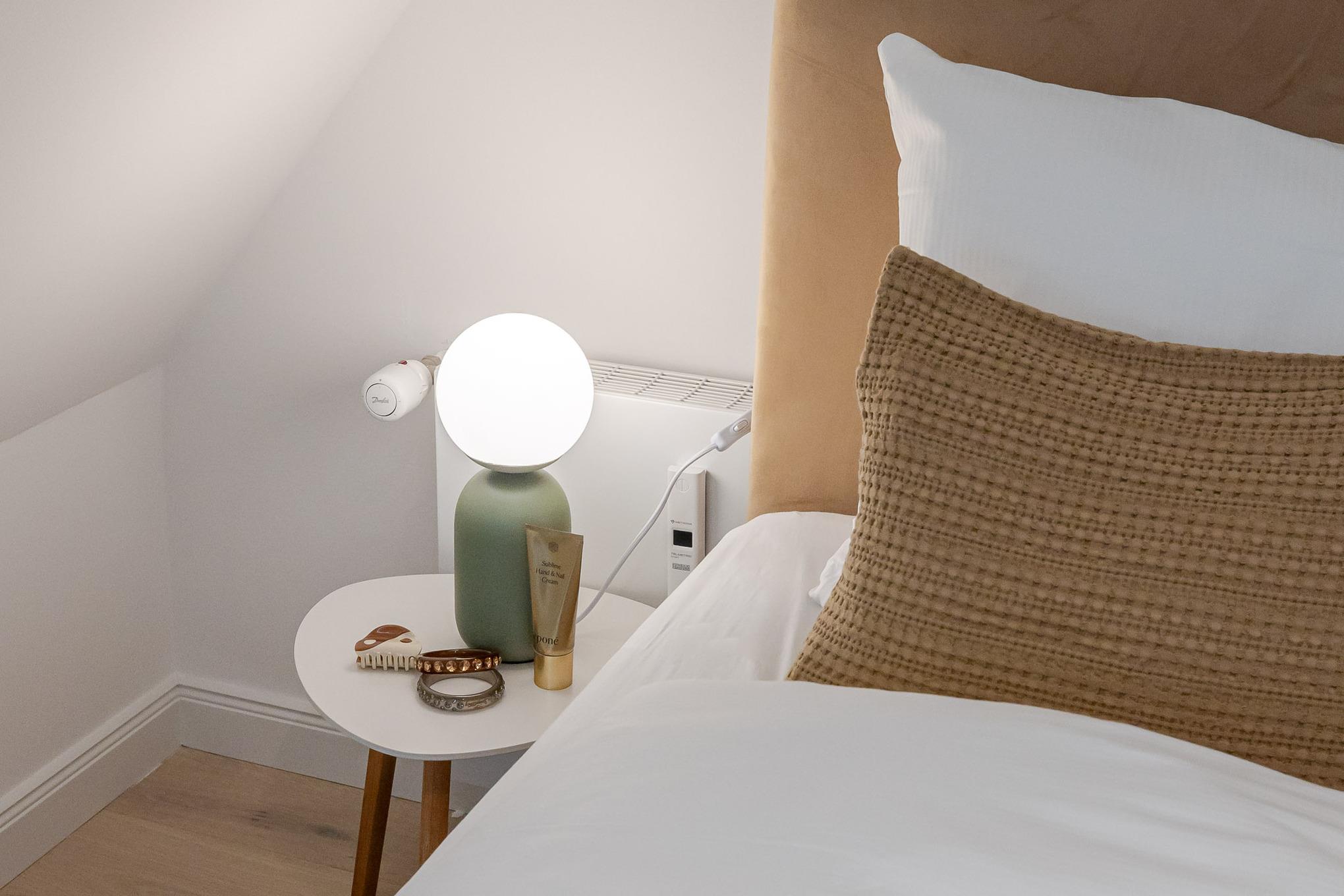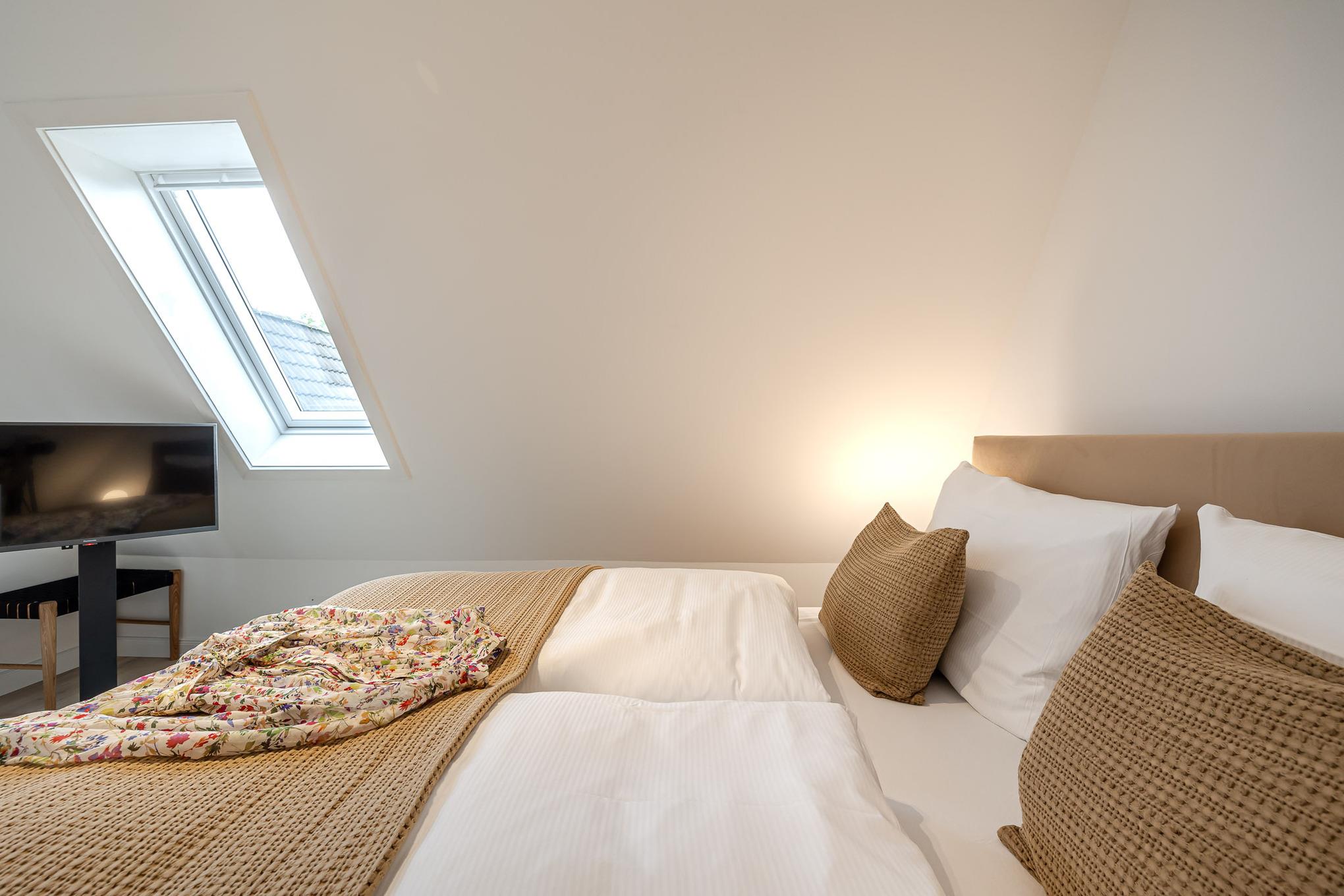 Über eine Treppe erreichen Sie das gemütliche Schlafzimmer. Dort erwartet Sie ein hochwertiges Boxspringbett der Marke Schramm, das erholsame Nächte und süße Träume verspricht.