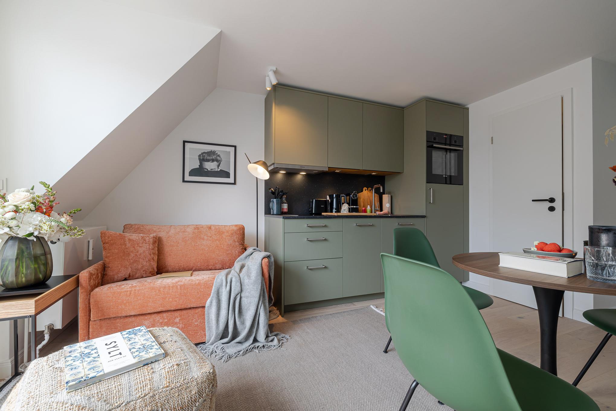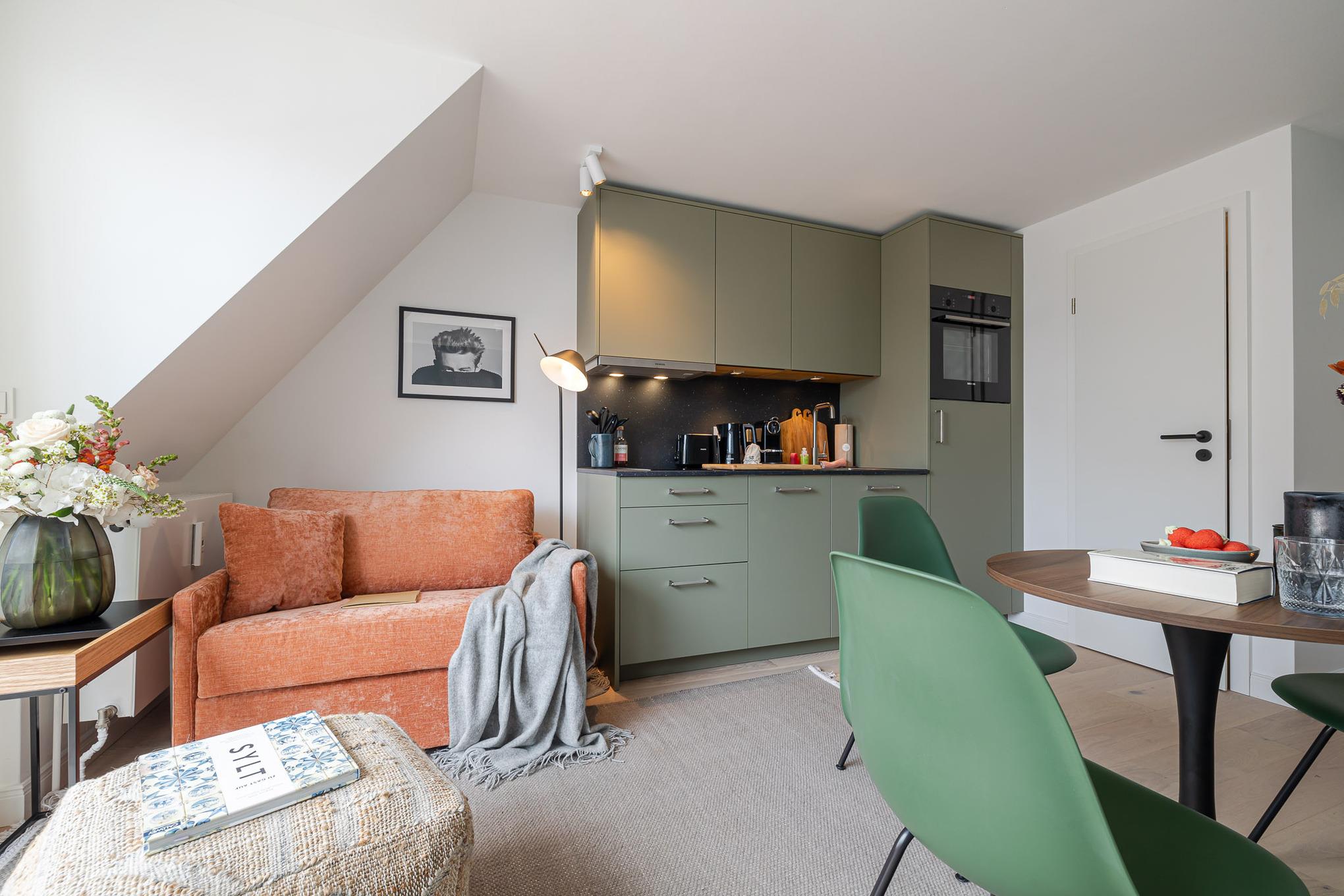 Willkommen in Ihrem persönlichen Place to be auf Sylt: Unsere frisch renovierte Kajüte #13 im CPTN Nicolai Resort in Westerland verbindet stilvolles Design mit perfekter Lage. Die charmante 31 m² große 2-Zimmer-Ferienwohnung liegt im Obergeschoss in Dock 6a, nur wenige Schritte von Strand, Zentrum und Bahnhof entfernt – ideal für alle, die Sylt mitten im Leben erleben möchten. Schon beim Eintreten empfängt Sie eine helle, moderne Atmosphäre. Lichtdurchflutete Räume, edles Sylter Eichenparkett und eine harmonisch abgestimmte Einrichtung schaffen ein echtes Wohlfühlambiente. Der Wohn- und Essbereich lädt zum Entspannen, Lesen oder gemütlichen Beisammensein ein. Ein bequemer Schlafsessel lässt sich bei Bedarf in eine zusätzliche Schlafgelegenheit verwandeln.