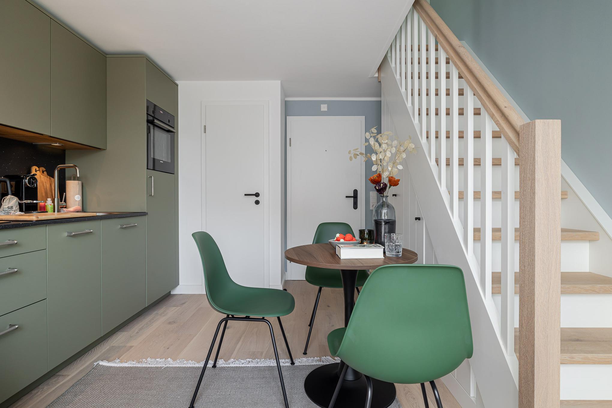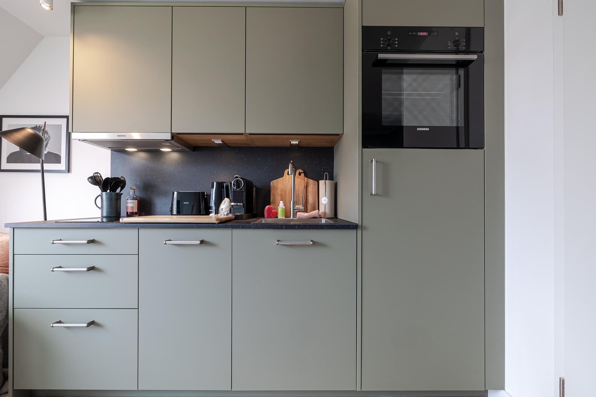 Die offene Küche ist mit hochwertigen Markengeräten von Siemens ausgestattet und bietet alles, was Sie für Frühstück, kleine Köstlichkeiten oder ein entspanntes Abendessen benötigen.