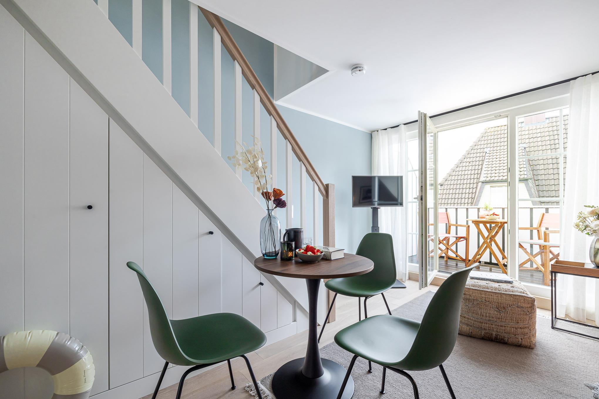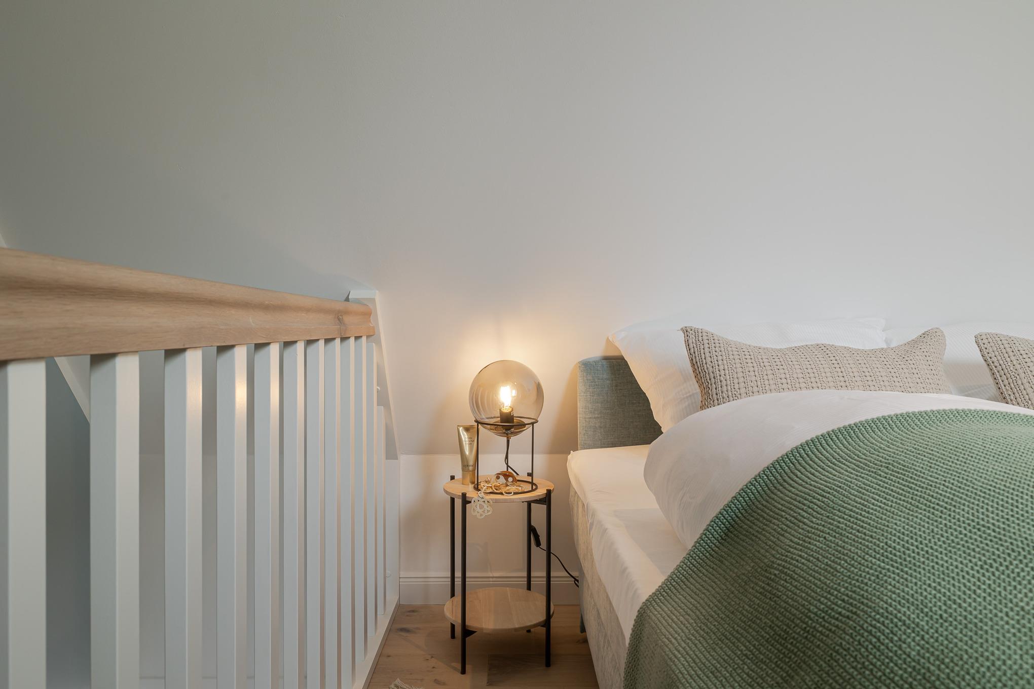 Über eine Treppe gelangen Sie auf das Oberdeck, wo ein komfortables Schramm-Boxspringbett für ruhige, erholsame Nächte sorgt. Ein weiteres Highlight ist der Balkon, der von Mai bis Oktober mit bequemen Möbeln ausgestattet ist – ideal für ein Frühstück in der Sonne oder ein Glas Wein am Abend.