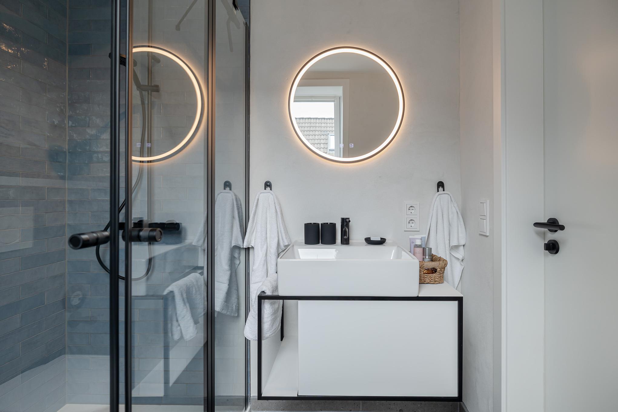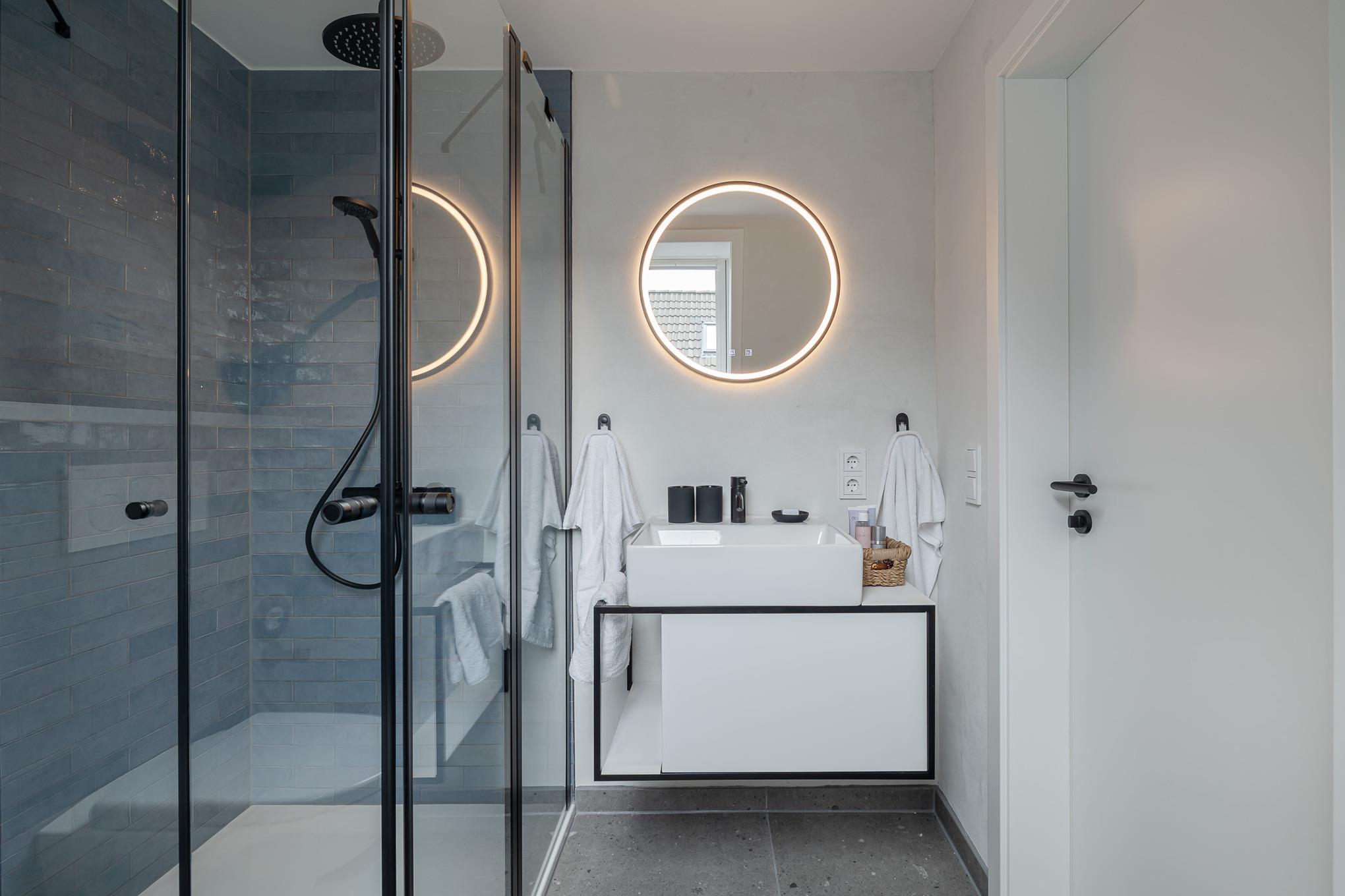 Im stilvollen Badezimmer in Meerblau- und Sandtönen erwartet Sie eine großzügige Regendusche, ergänzt durch Fußbodenheizung und Handtuchwärmer – Ihre kleine private Wellnessoase.