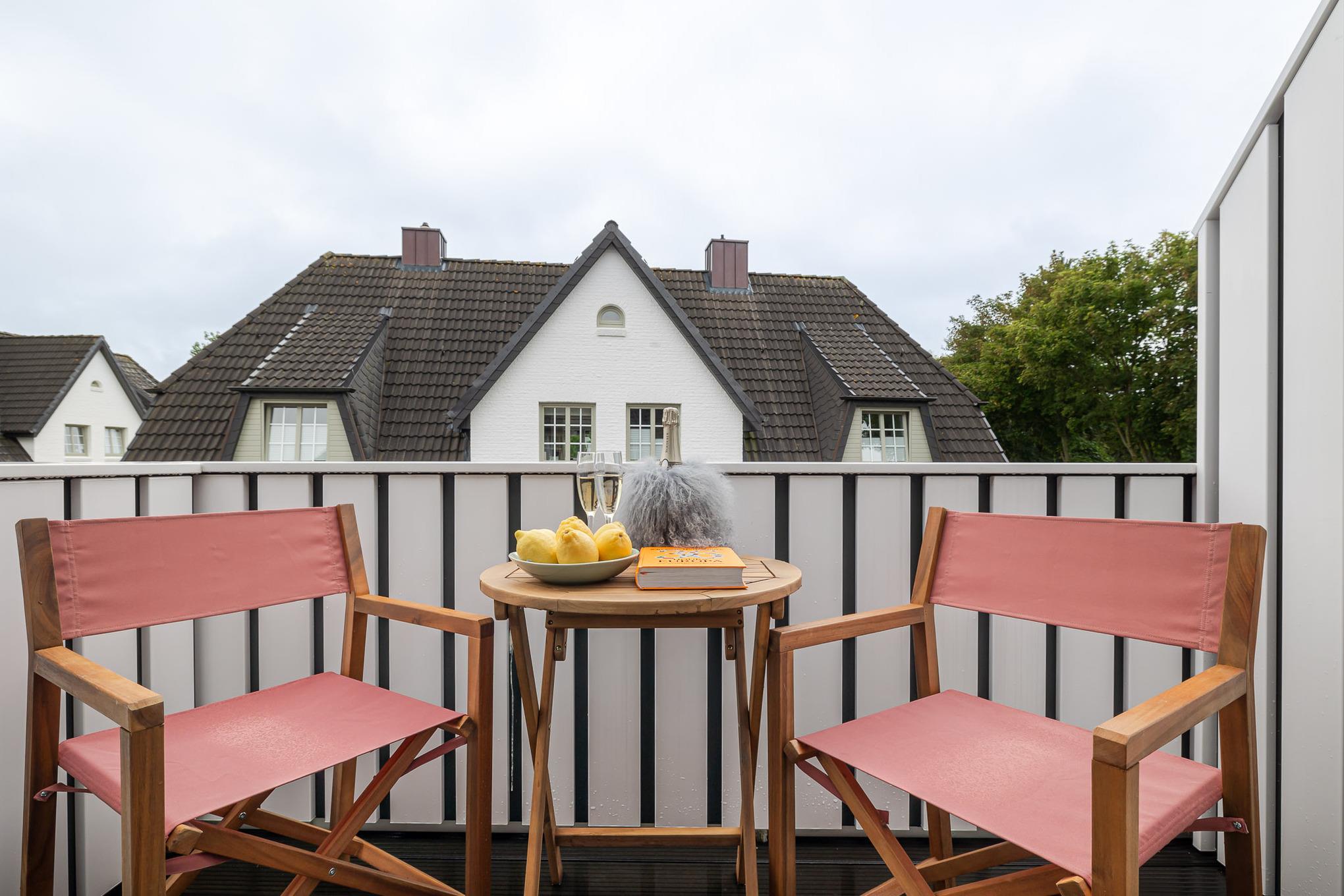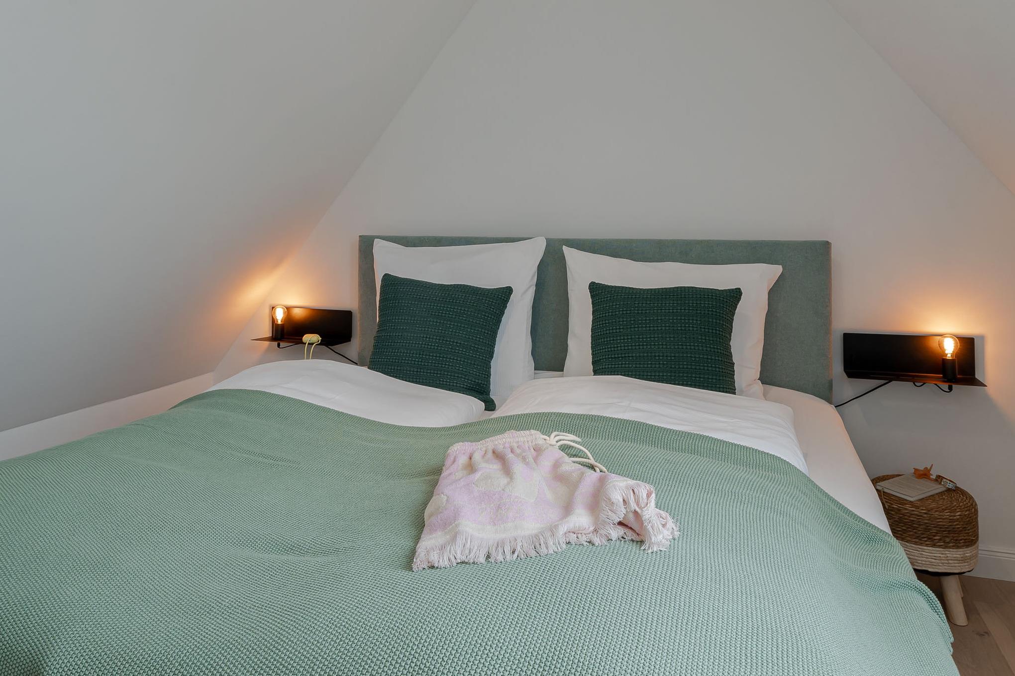 Über eine Treppe gelangen Sie in den Schlafbereich auf dem Oberdeck. Ein komfortables Schramm-Boxspringbett und maßgefertigte Einbauschränke sorgen hier für ruhige Nächte und viel Stauraum. Ein echtes Highlight ist der Balkon, auf dem von Mai bis Oktober bequeme Möbel bereitstehen – perfekt, um die frische Nordseeluft zu genießen oder den Tag bei einem Glas Wein ausklingen zu lassen. Als Gast nutzen Sie kostenfrei den 200 m² großen Pool- und Saunabereich im Dock 6d mit 12 × 4 m Pool, moderner Sauna und Fitnessbereich (Laufband, Bike, Rudergerät, Gewichte).