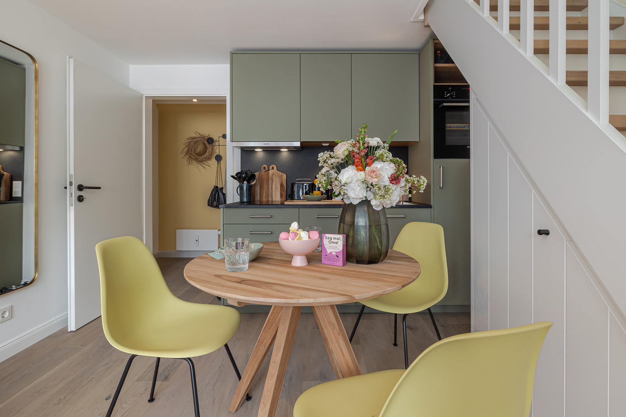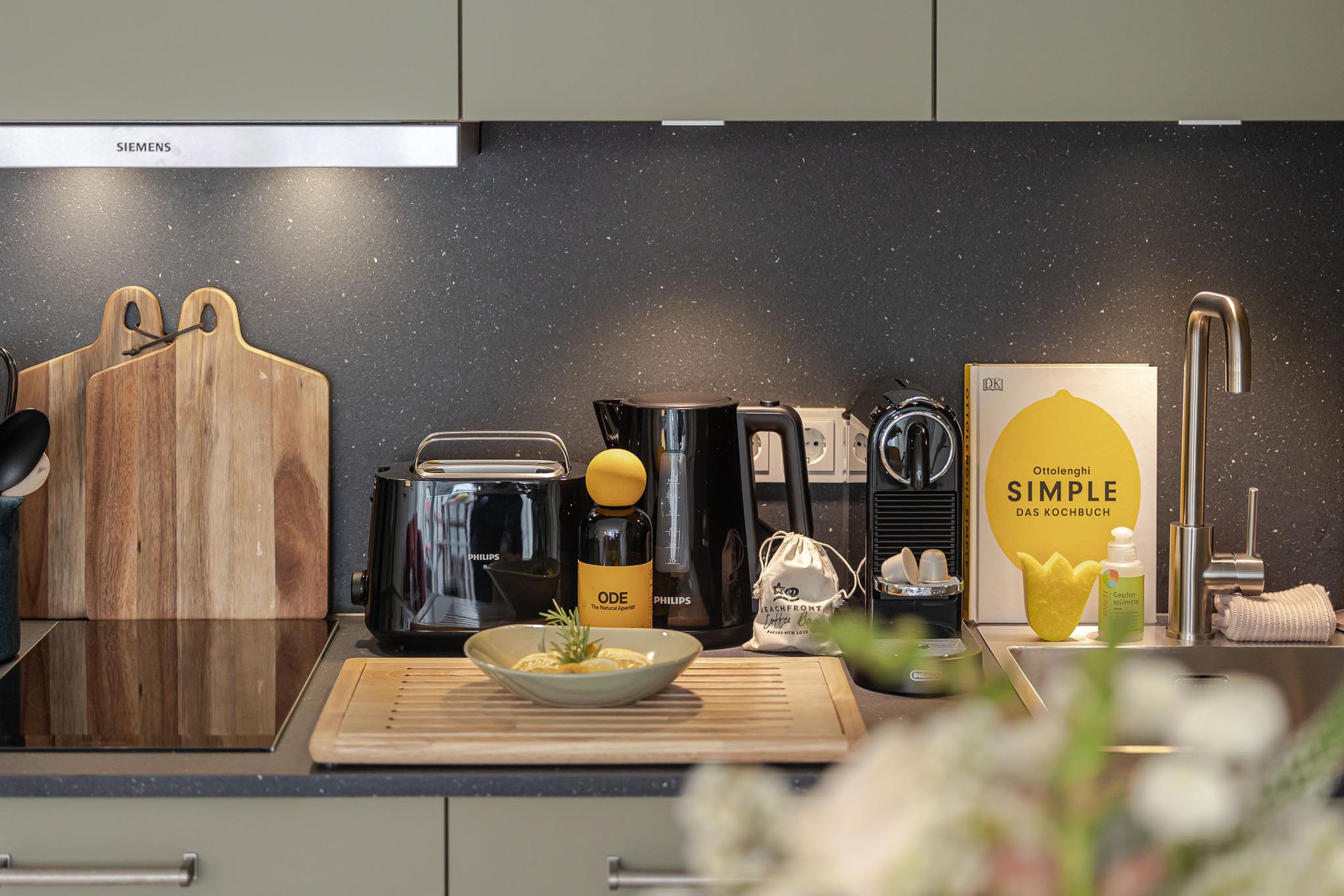 Schon beim Ankommen spüren Sie die besondere Atmosphäre: hohe, helle Räume, edles Sylter Eichenparkett und eine moderne, harmonisch abgestimmte Einrichtung sorgen für einen rundum entspannten Start in den Urlaub. Der Wohn- und Essbereich lädt zum Lesen, Entspannen oder gemütlichen Zusammensitzen ein. Das bequeme Sofa lässt sich bei Bedarf in eine komfortable zusätzliche Schlafgelegenheit verwandeln. Die offene Küche ist hochwertig ausgestattet und mit Markengeräten von Siemens bestückt. Hier finden Sie alles, was Sie für Frühstück, kleine Gerichte oder ein entspanntes Abendessen benötigen.
