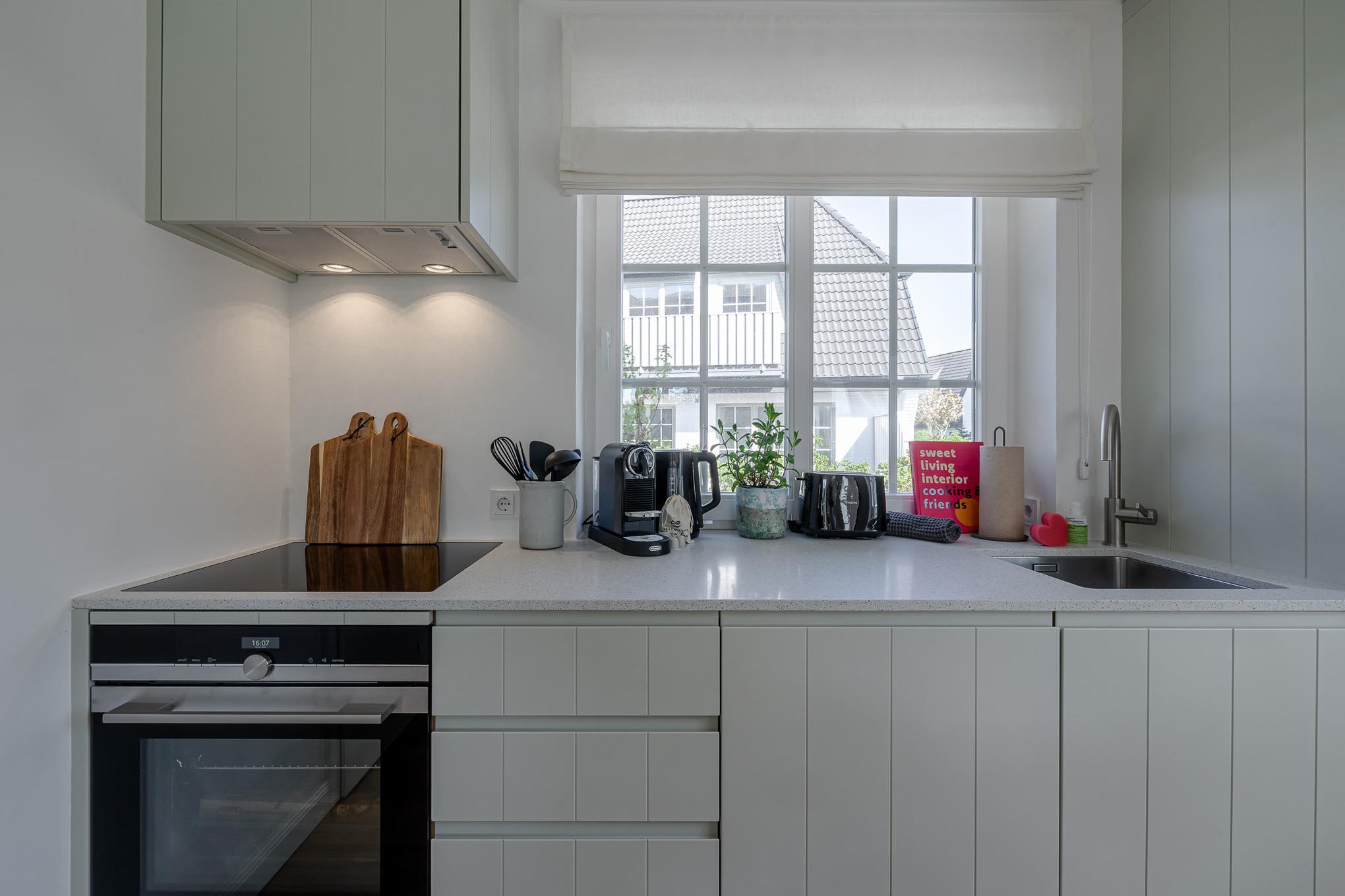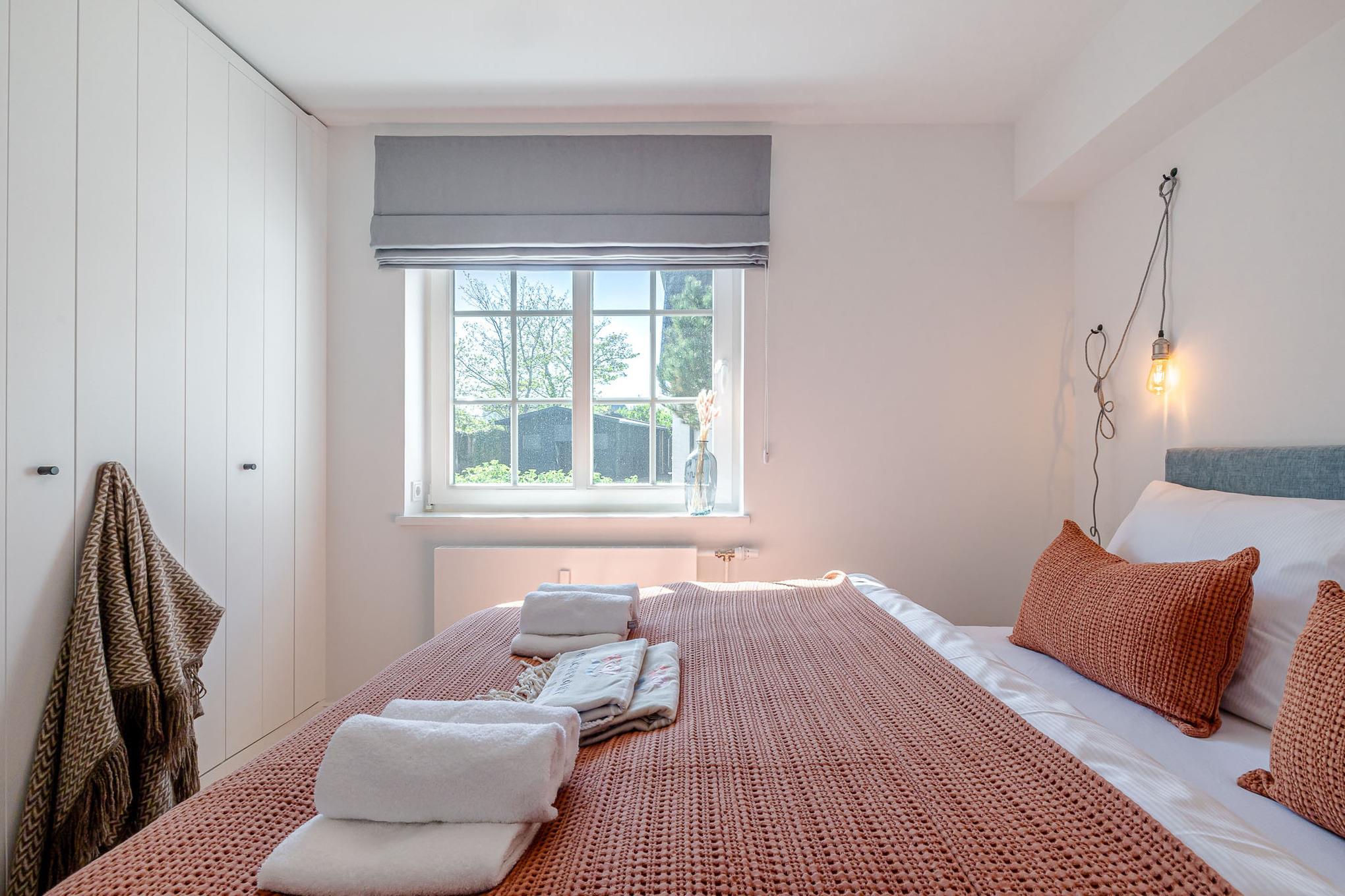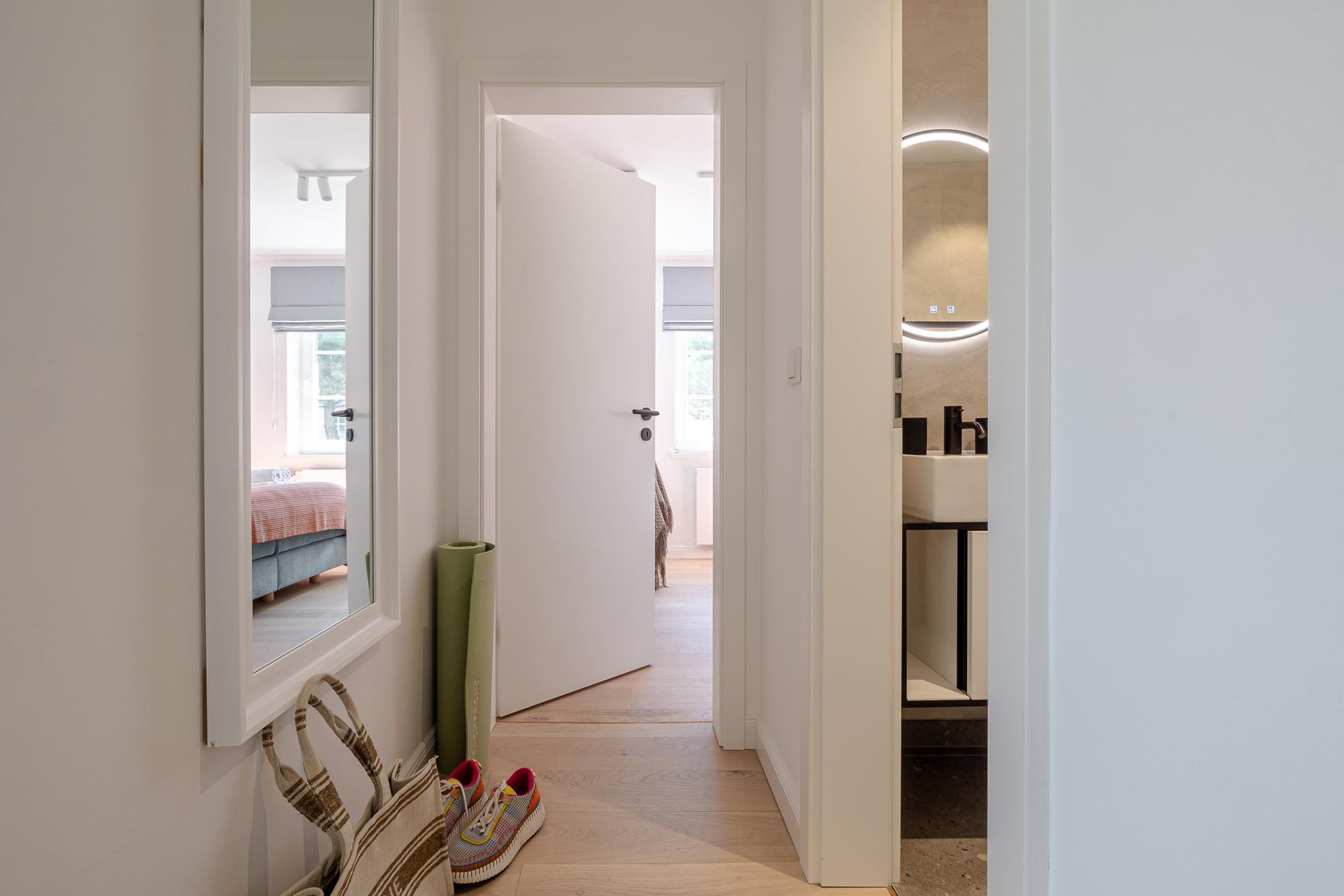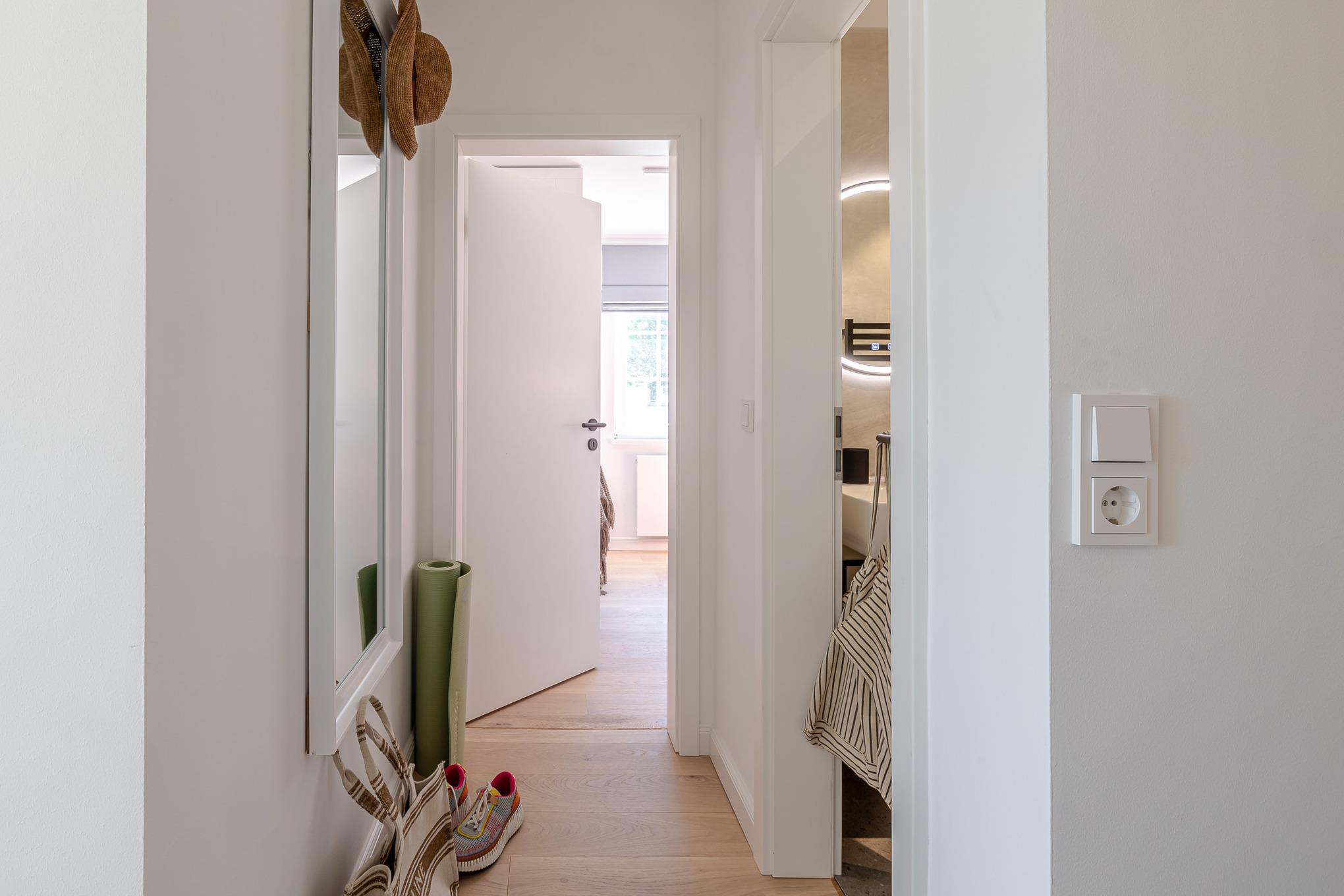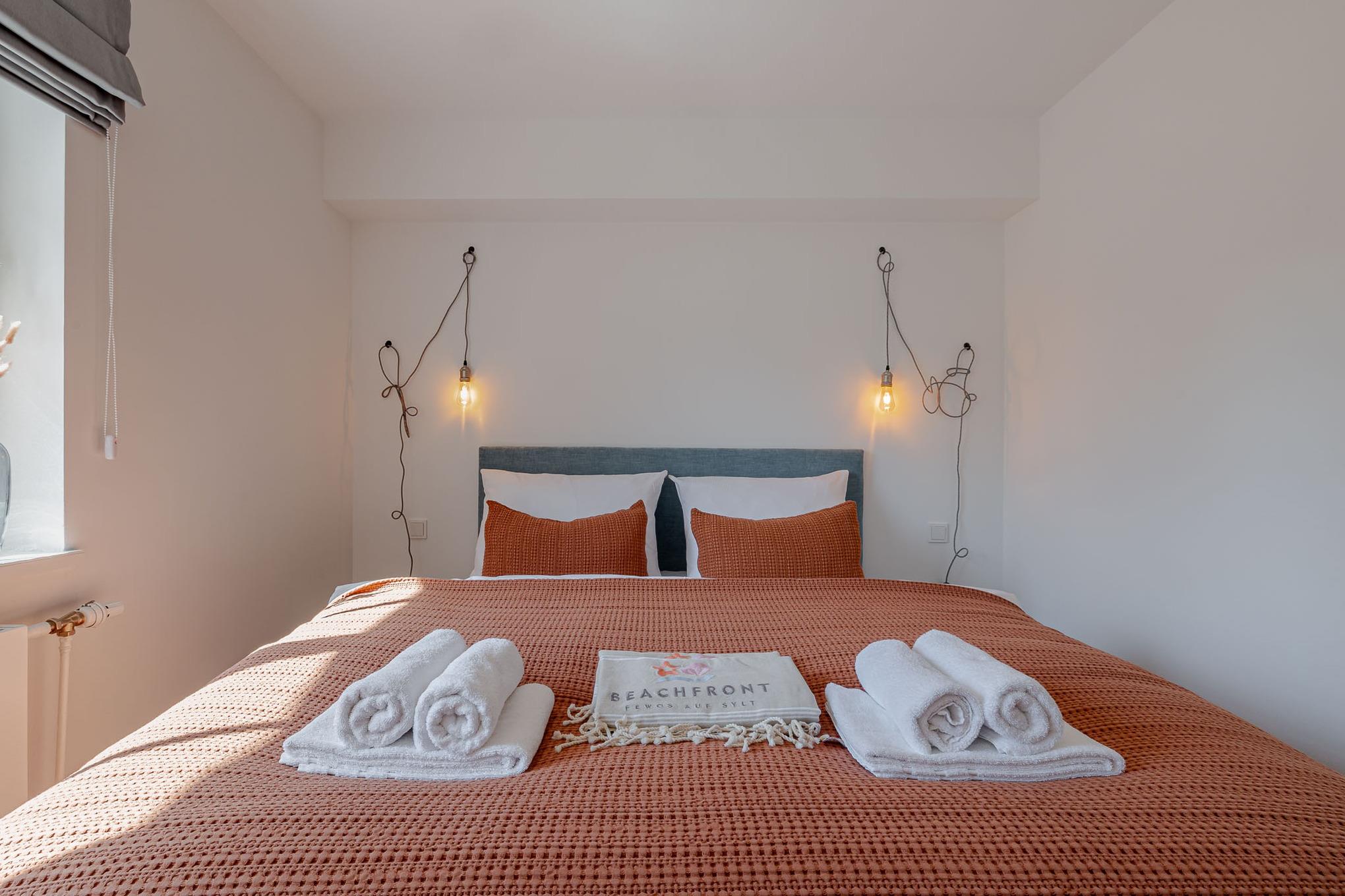 Die Wohnung überzeugt mit Eichenparkett, hoher Decken, viel Licht und einer modernen, inseltypischen Einrichtung. Das separate Schlafzimmer ist mit einem hochwertigen Schramm-Boxspringbett ausgestattet. Direkt angrenzend befindet sich das moderne Bad mit großer Regendusche und Fußbodenheizung.