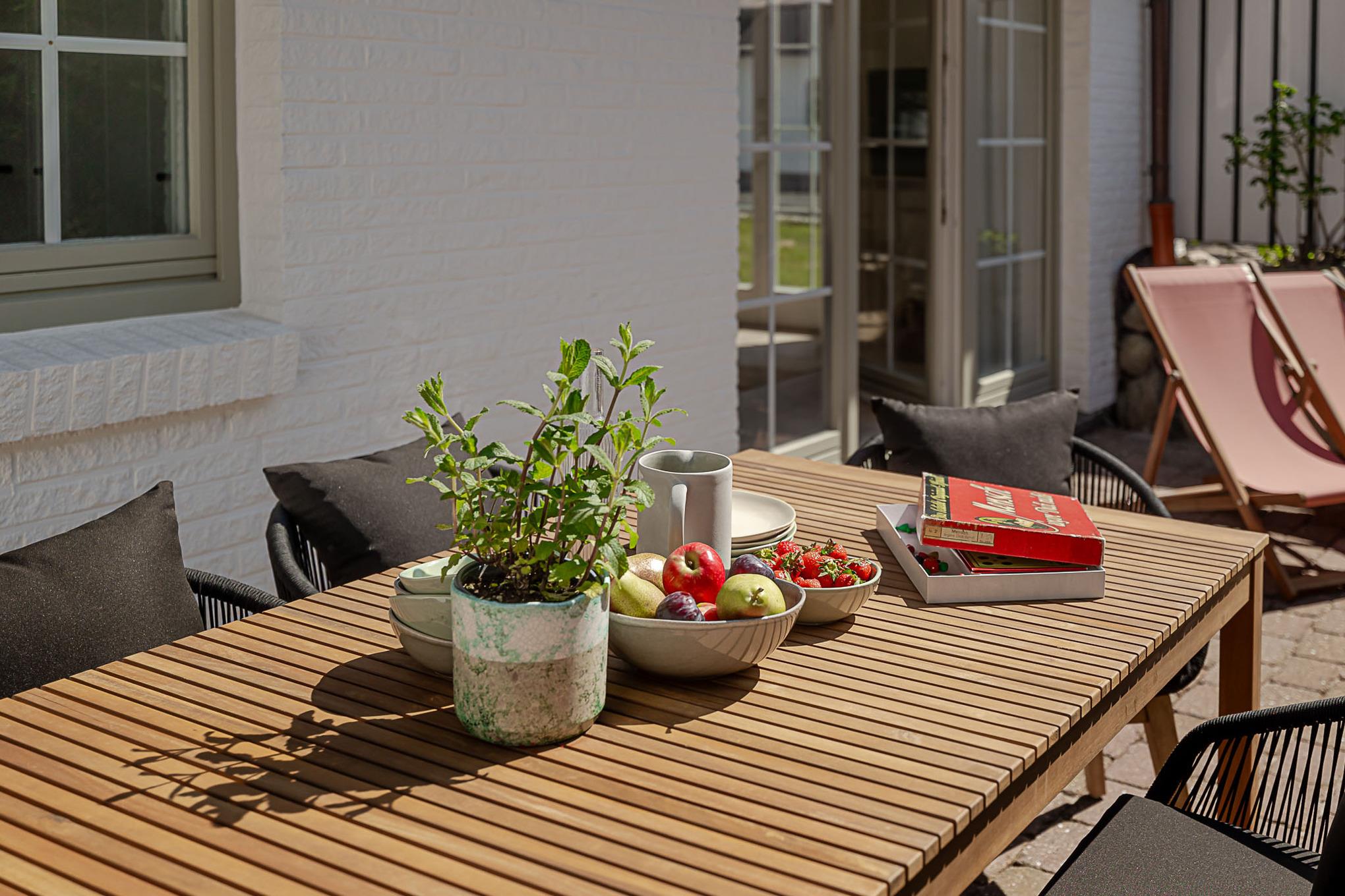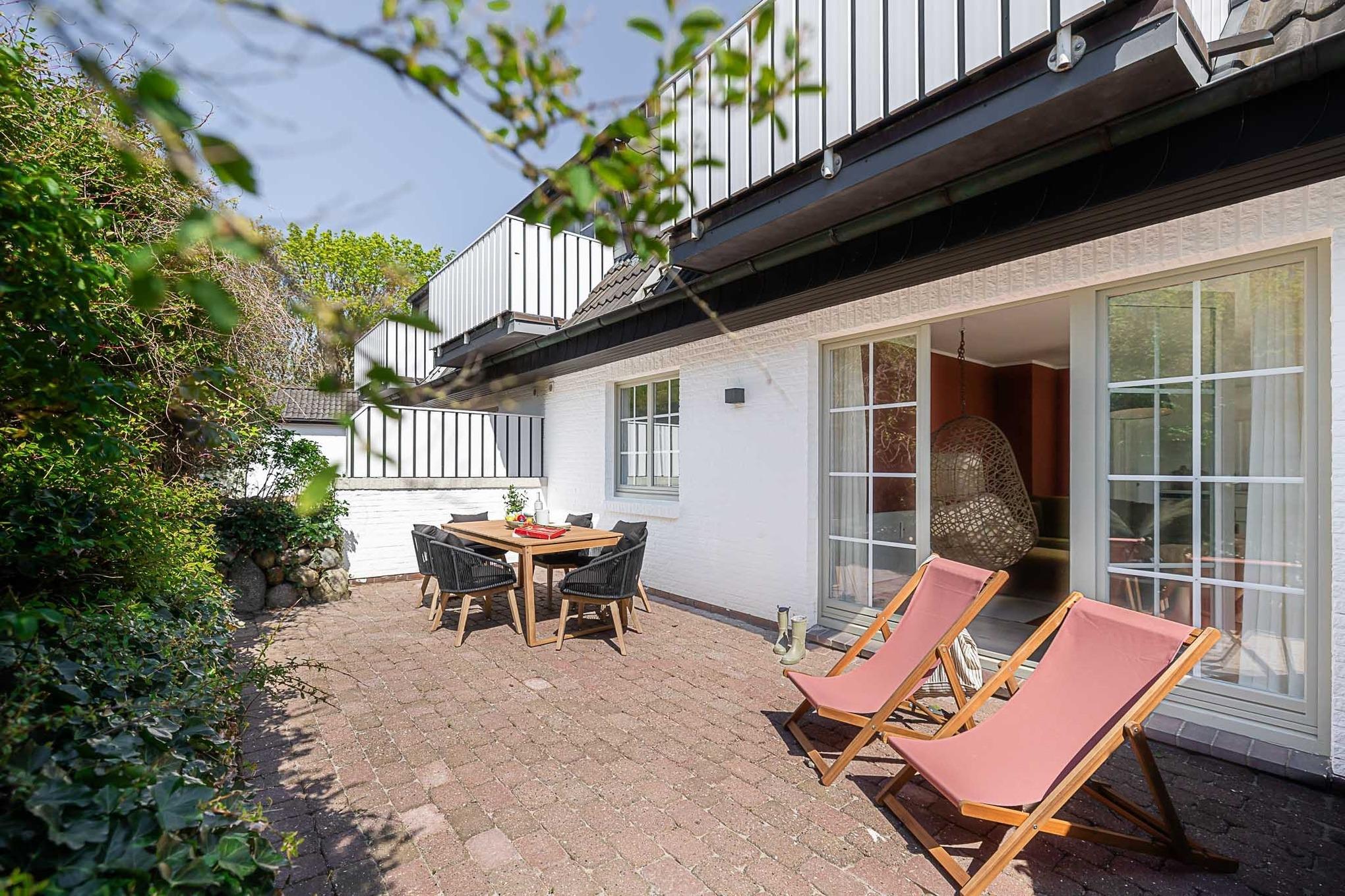Ein besonderes Plus ist die private Terrasse, auf der von Mai bis Oktober bequeme Möbel zum Entspannen und Durchatmen an der frischen Nordseeluft bereitstehen.