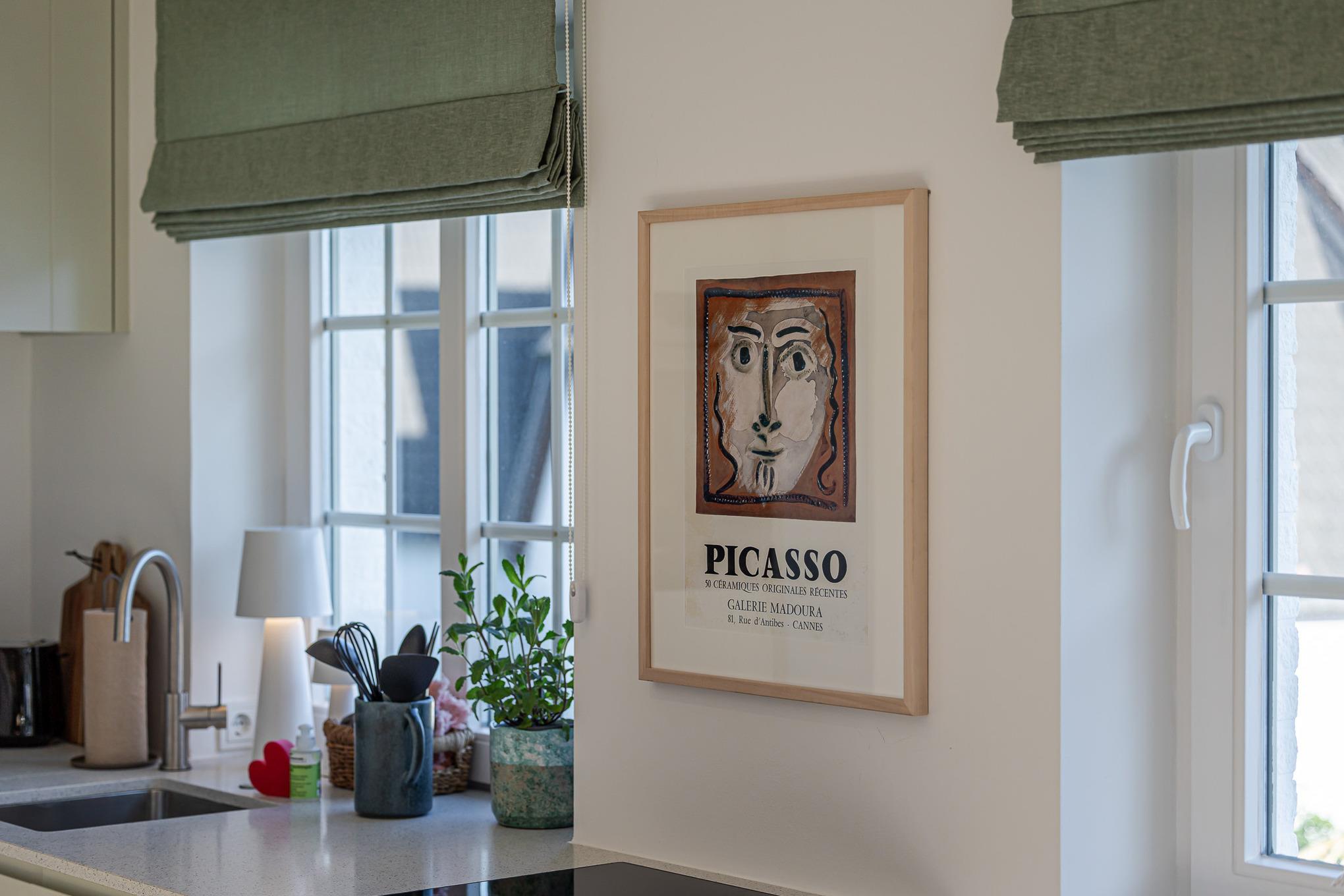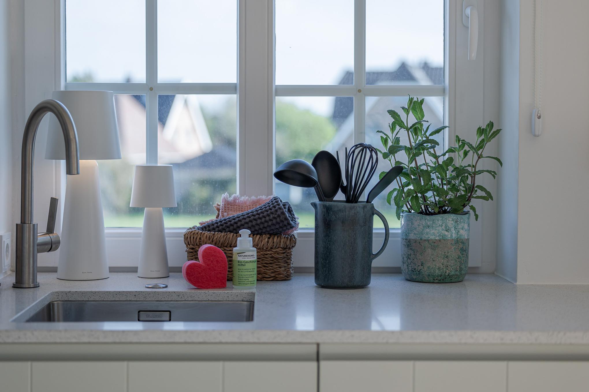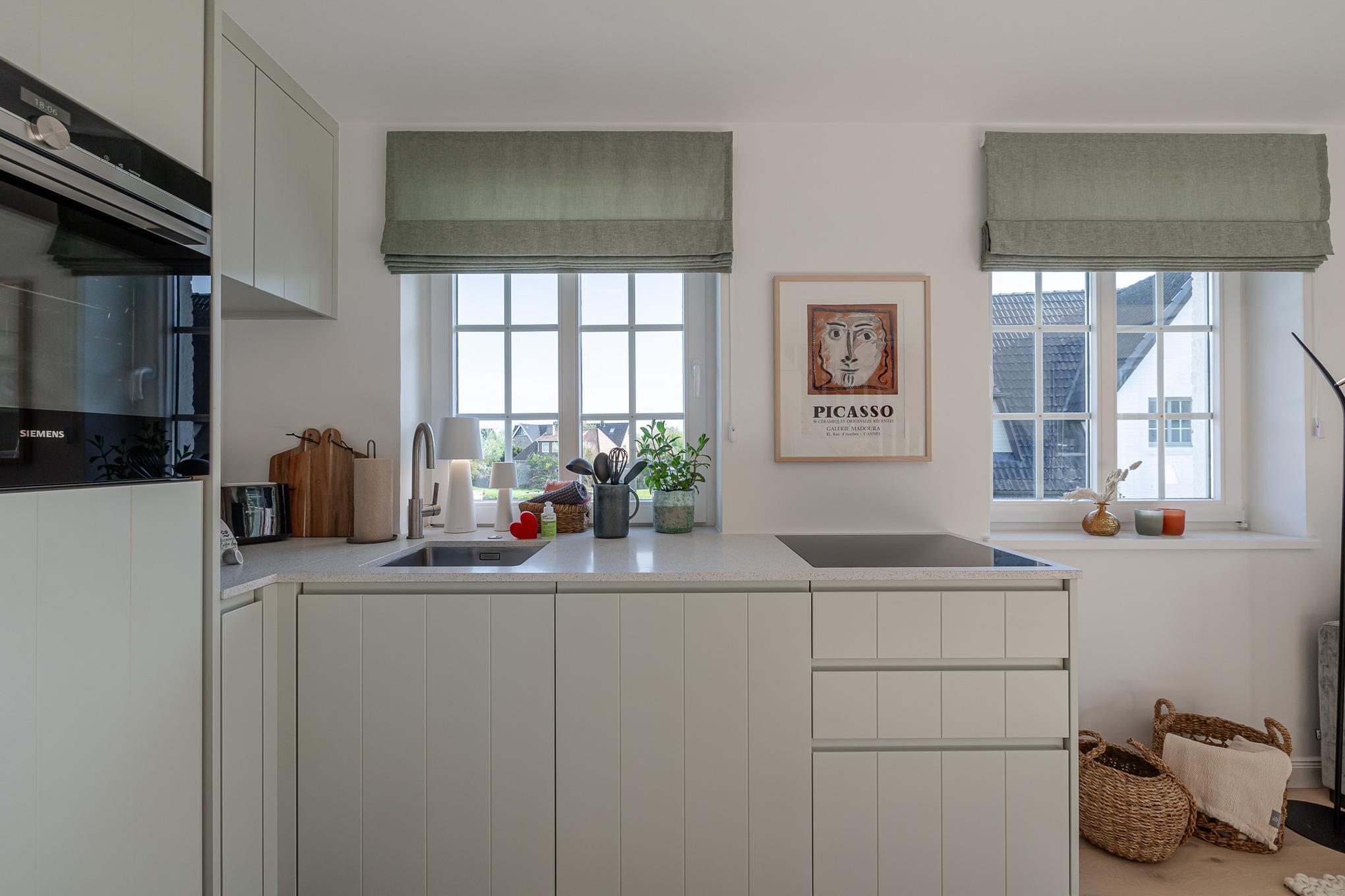 Die moderne Küche mit hochwertigen Markengeräten von Siemens ist vollständig ausgestattet und bietet alles, was Sie für Frühstück, Snacks oder ein gemütliches Abendessen benötigen – mit Blick nach draußen.