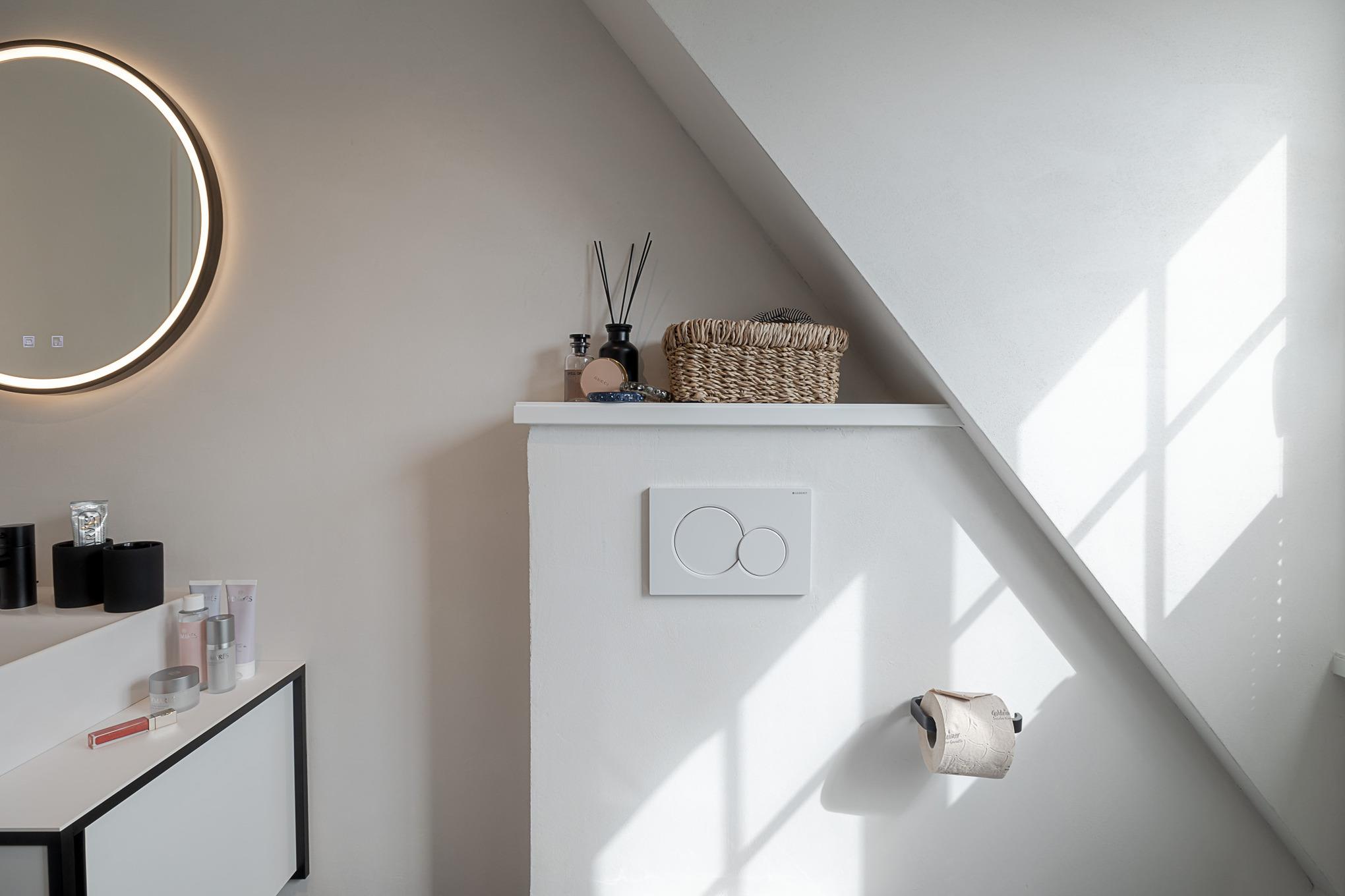 Das stilvolle Badezimmer befindet sich ebenfalls auf dieser Ebene und punktet mit großer Regendusche, Fußbodenheizung und Handtuchwärmer – perfekt für entspannte Momente nach einem Tag am Meer.