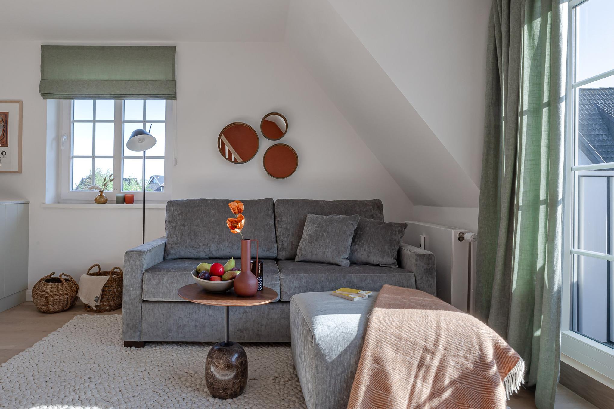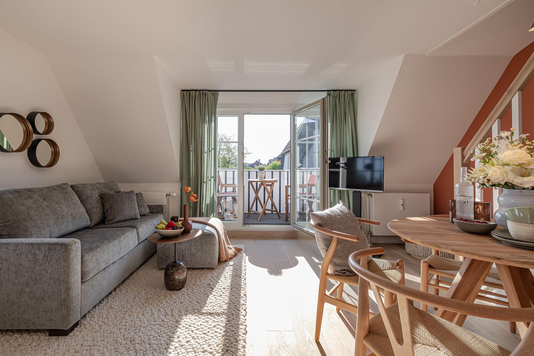 Schon beim Betreten empfängt Sie ein heller, einladender Wohn- und Essbereich mit typisch Sylter Eichenparkett, klaren Linien und einer harmonisch abgestimmten Einrichtung. Hier beginnt der Urlaub sofort. Das bequeme Schlafsofa lässt sich bei Bedarf in eine zusätzliche Schlafgelegenheit verwandeln und sorgt auch tagsüber für entspannte Stunden.
