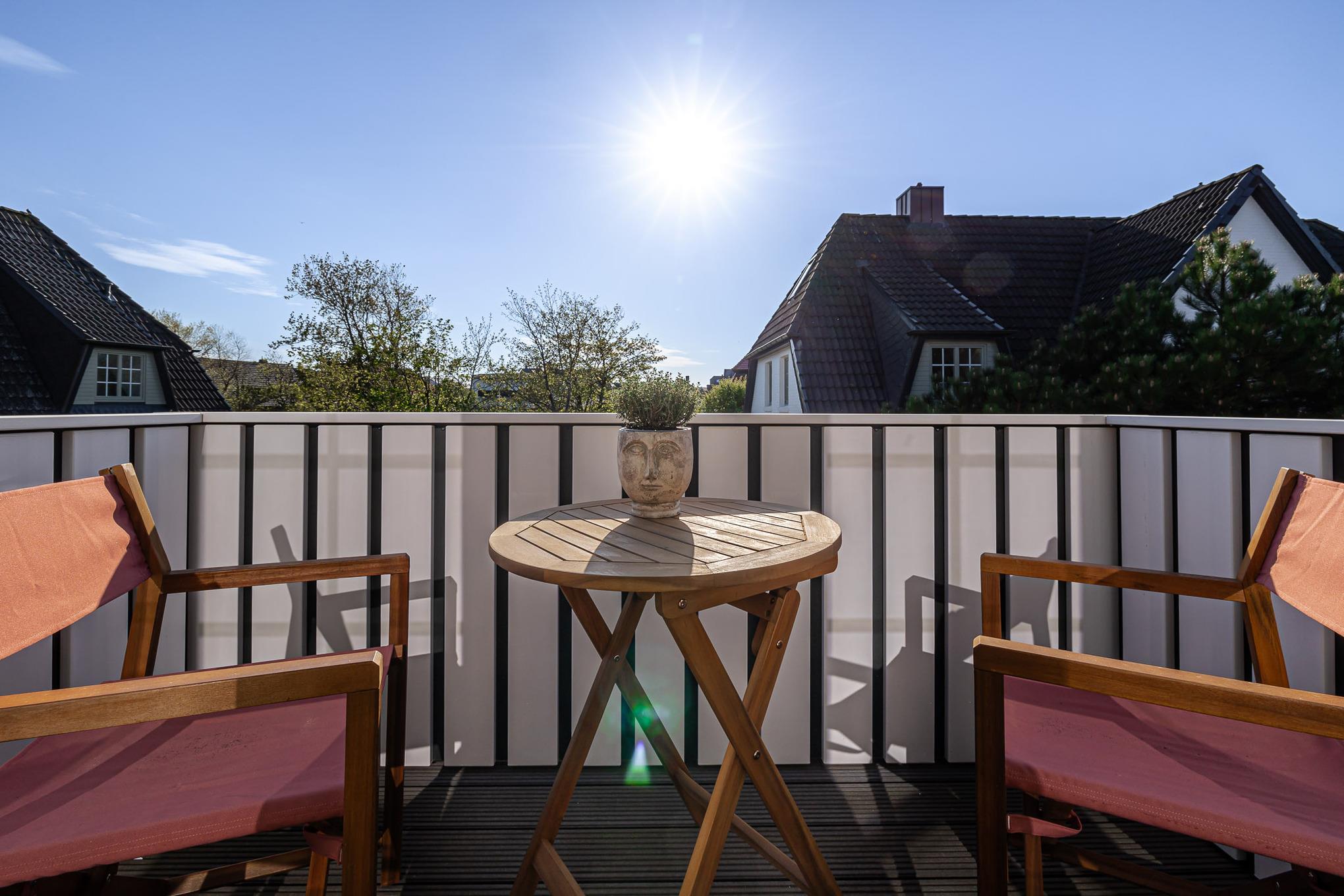 Über eine Treppe gelangen Sie auf das Oberdeck, wo sich Ihr Schlafbereich befindet. Ein komfortables Schramm-Boxspringbett und maßgefertigte Einbauschränke sorgen hier für ruhige Nächte und viel Stauraum. Auf dem Balkon stehen Ihnen von Mai bis Oktober bequeme Möbel zur Verfügung – ideal, um die frische Nordseeluft zu genießen oder den Tag bei einem Glas Wein ausklingen zu lassen.