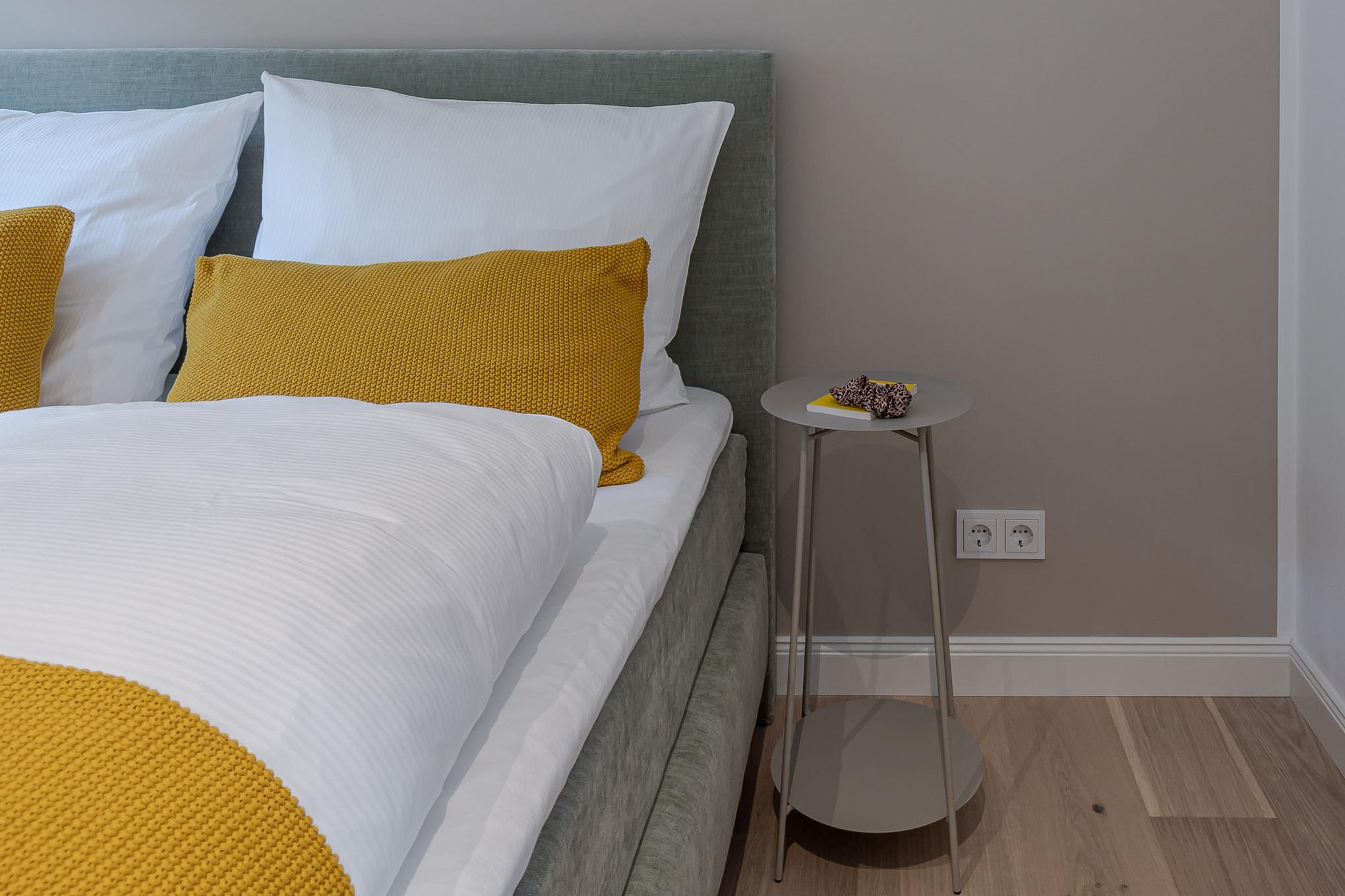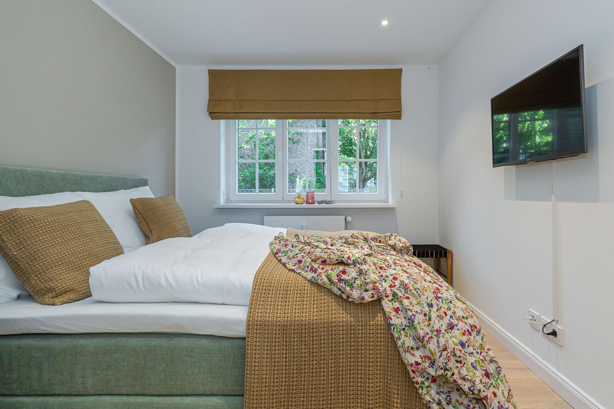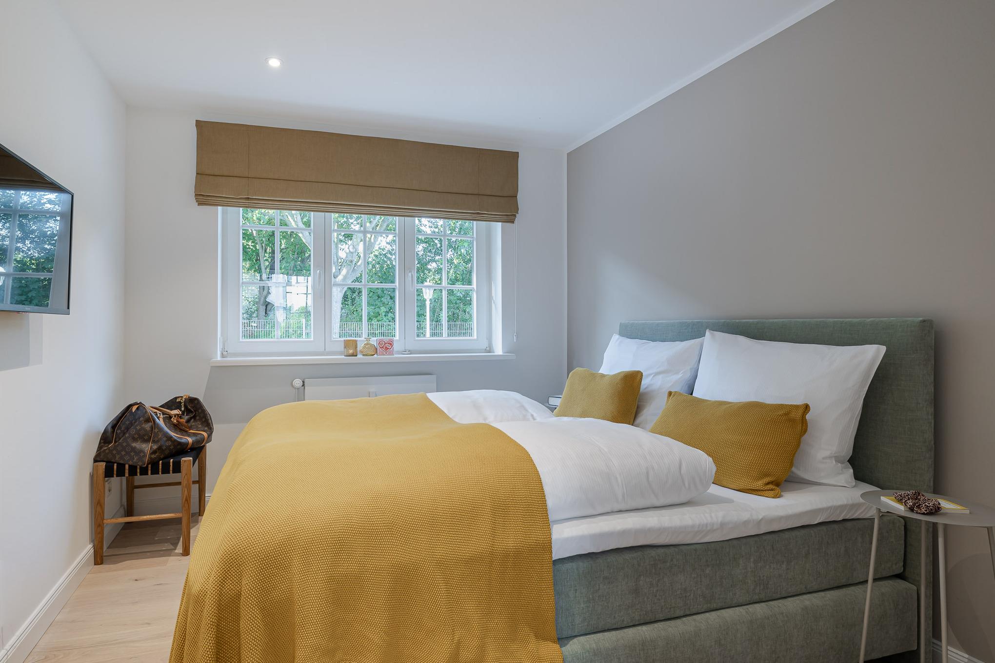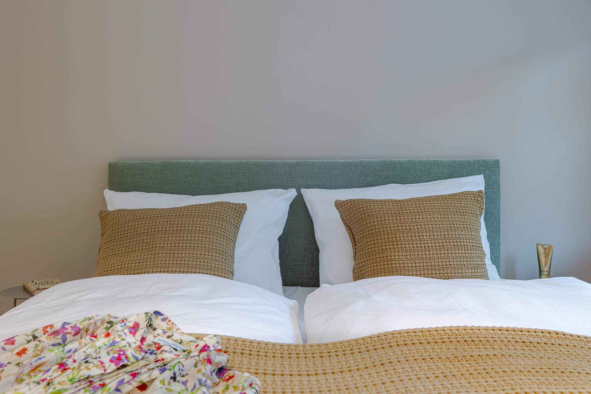 Zwei Schlafzimmer sind jeweils mit komfortablen Boxspringbetten und maßgefertigten Einbauschränken ausgestattet. Im großzügigen Wohn- und Essbereich befindet sich ein vollwertiges Schlafsofa für zwei weitere Gäste sowie eine moderne, hochwertig ausgestattete Küche mit Markengeräten (u. a. Miele) und allem, was man auch von zuhause kennt.