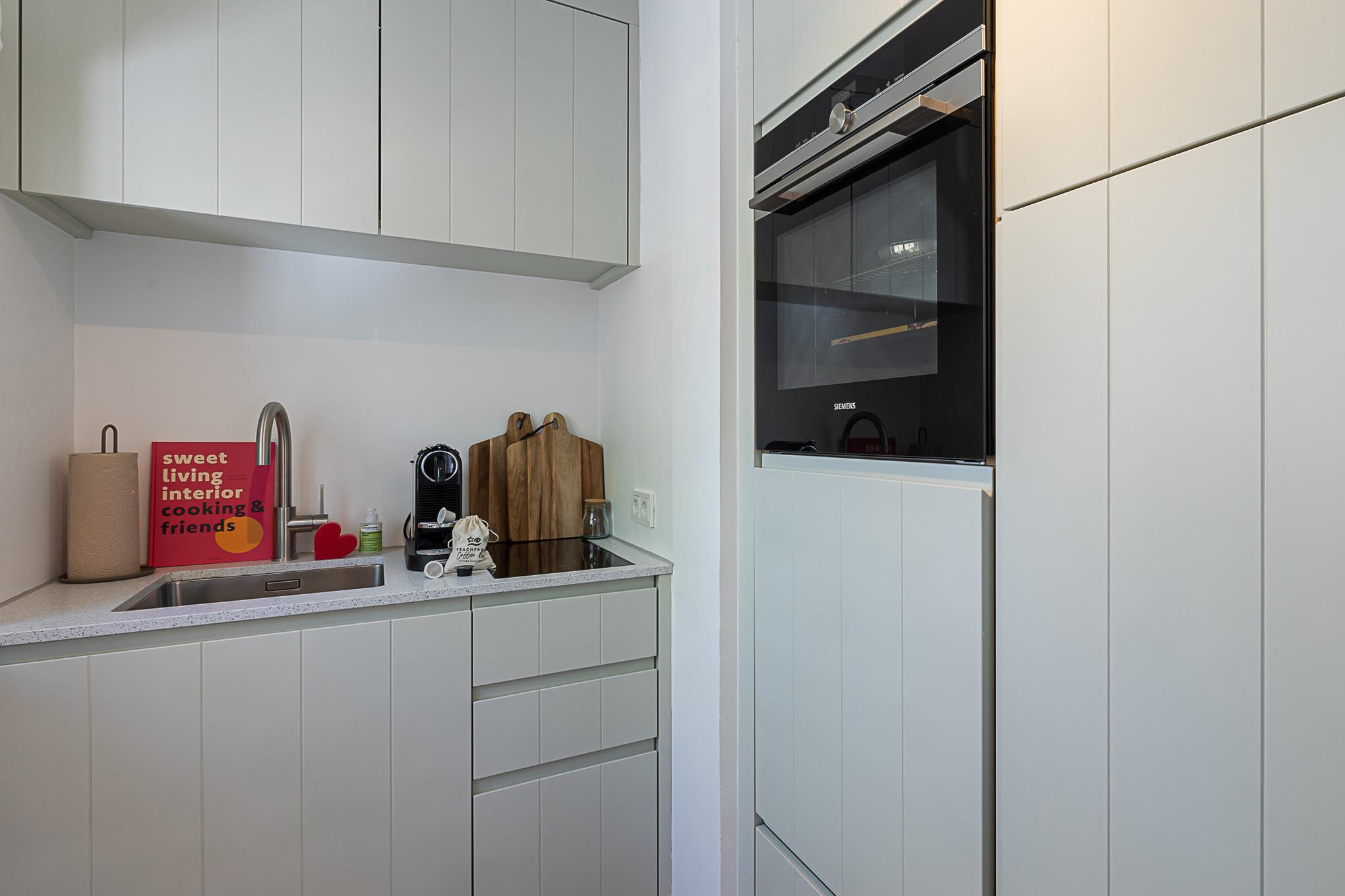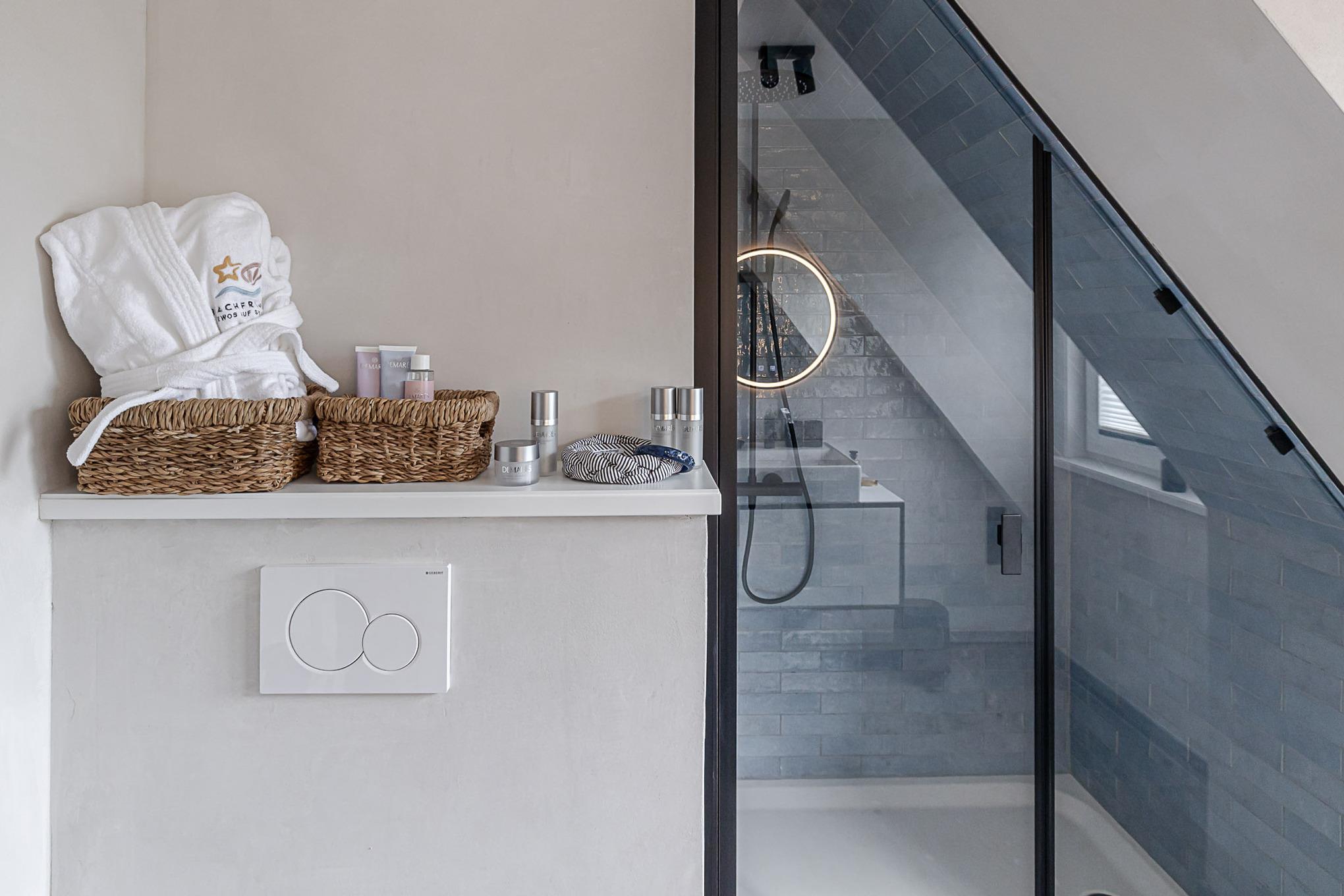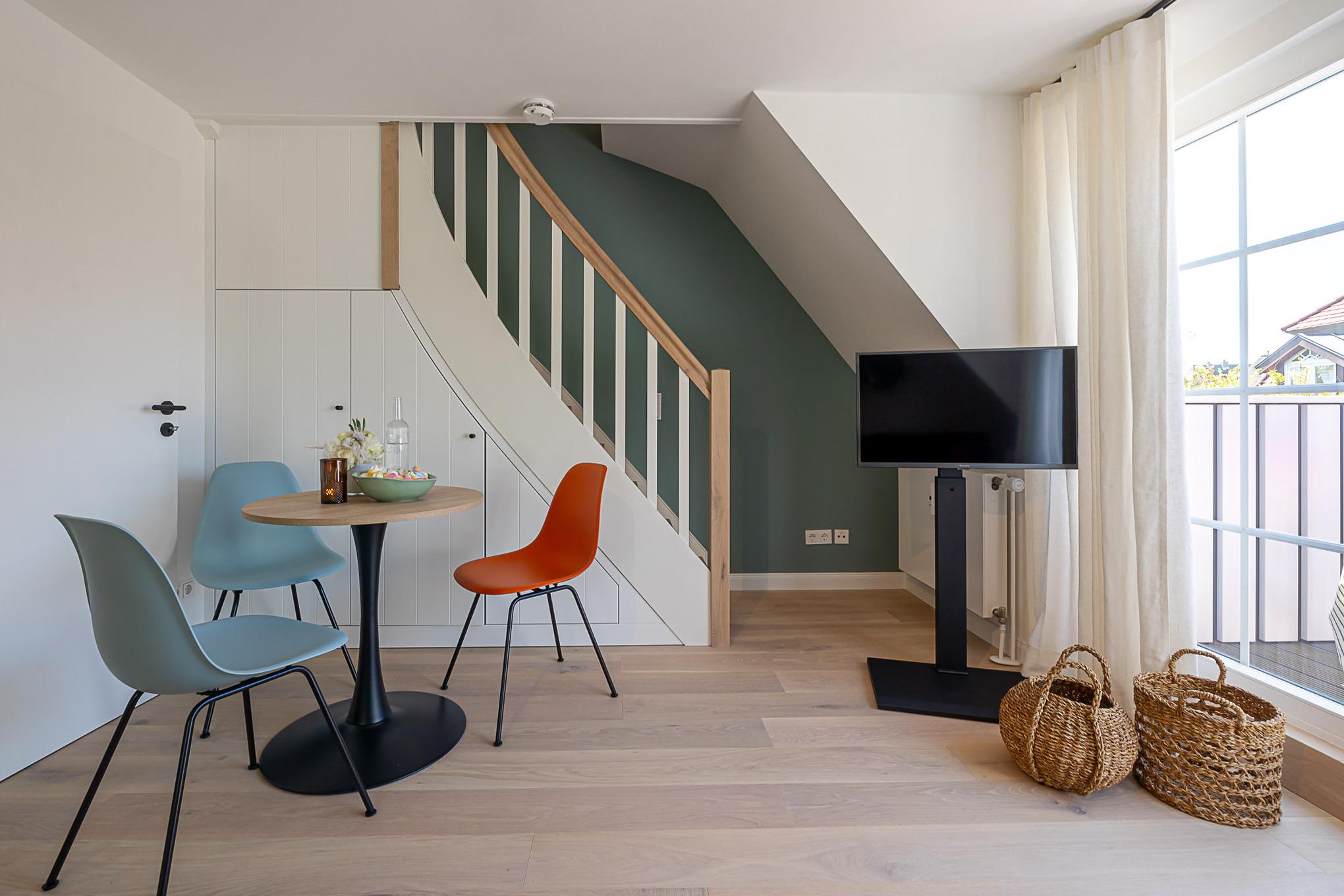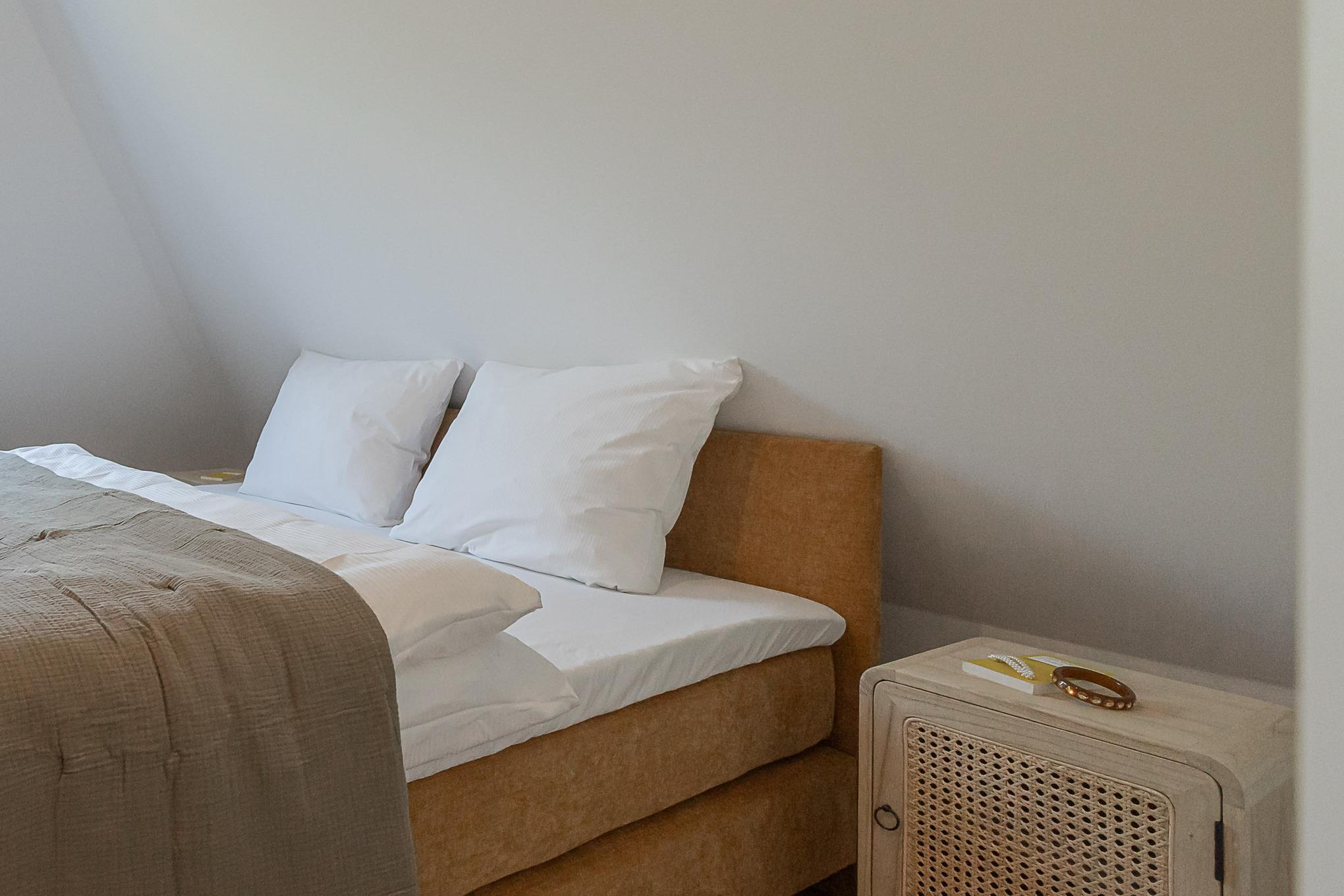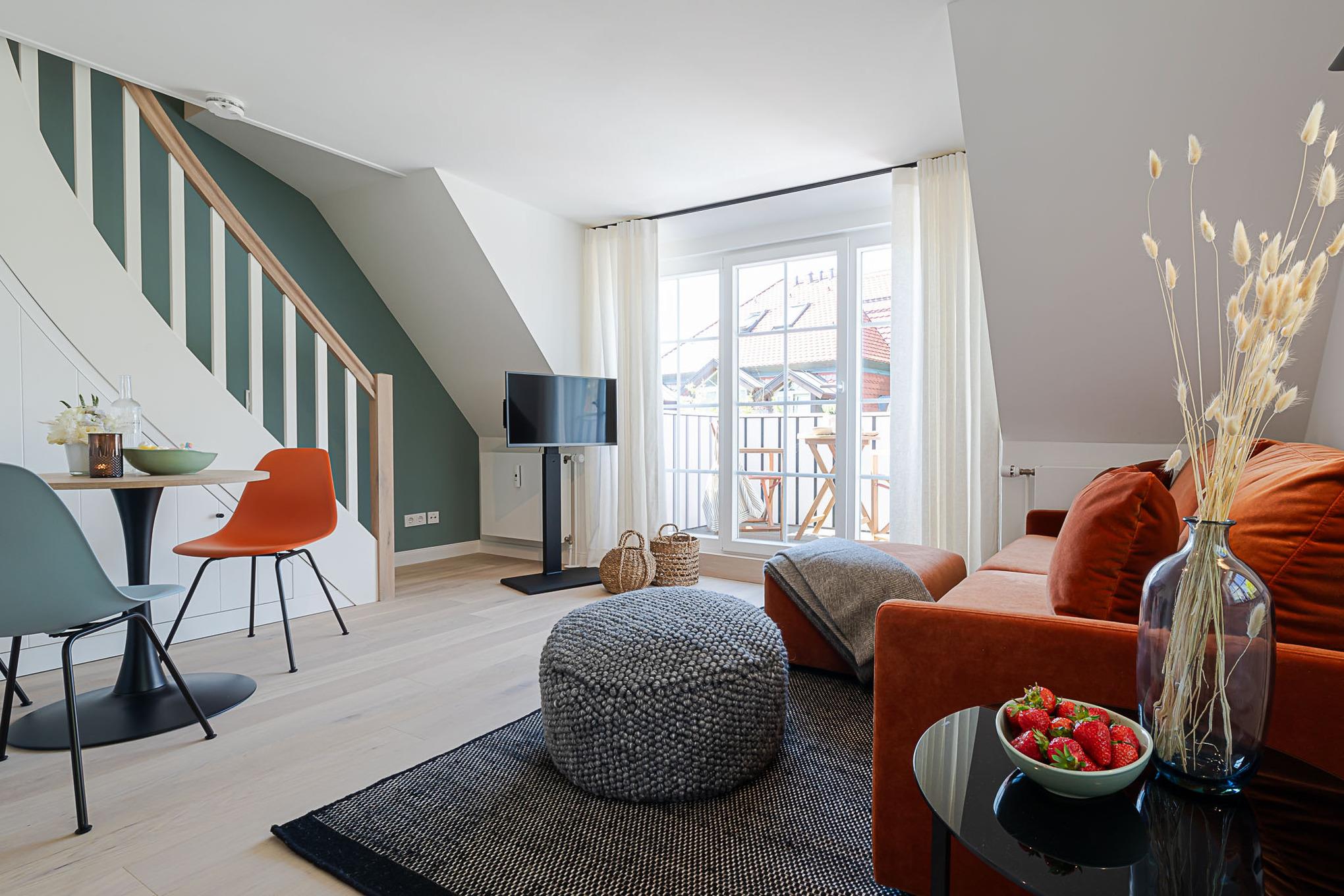 Eine Extraportion Vitamin Sea im CPTN Nicolai Resort. Mitten in Westerland, im neuen CPTN Nicolai Resort, erwartet Sie unsere frisch renovierte Kajüte #25 im Dock 6c. Die stilvolle Zwei Zimmer Wohnung liegt im Obergeschoss und bietet auf 43 Quadratmetern den idealen Rückzugsort für erholsame Tage auf Sylt. Bis zu drei Personen finden hier ein modernes Zuhause auf Zeit mit echtem Inselgefühl. Beim Eintreten empfängt Sie ein heller, geschmackvoll gestalteter Wohn und Essbereich mit warmem Eichenparkett und einer Einrichtung, die Ruhe und Qualität ausstrahlt. Das komfortable Schlafsofa im Wohnbereich lässt sich bei Bedarf in eine zusätzliche Schlafmöglichkeit verwandeln. Die moderne Küche ist hochwertig ausgestattet, unter anderem mit Geräten von Siemens, und bietet alles, was Sie für ein entspanntes Frühstück oder ein gemeinsames Abendessen benötigen. Funktional, durchdacht und angenehm unaufgeregt. Das Badezimmer ist in sanften Farben von Meer und Sand gehalten und wird mit Regendusche, Fußbodenheizung und Handtuchwärmer schnell zu Ihrer kleinen Wellnessoase. Über eine Treppe gelangen Sie auf das Oberdeck, wo ein bequemes Boxspringbett für erholsame Nächte nach langen Strandspaziergängen sorgt. Ein weiteres Highlight ist der Balkon, der von Mai bis Oktober mit bequemen Möbeln zum Durchatmen, Sonnen und Verweilen einlädt.Als Gast nutzen Sie den 200 Quadratmeter großen Pool und Saunabereich in Dock 6d kostenfrei. Ein 12 mal 4 Meter Pool, Sauna, Loungebereich und moderne Fitnessgeräte stehen Ihnen zur Verfügung. Hunde sind herzlich willkommen. Ein kostenfreier Parkplatz gehört ebenfalls zu Ihrer Kajüte. Ankommen, aufladen und Sylt genießen. Genau dafür ist diese Kajüte gemacht.