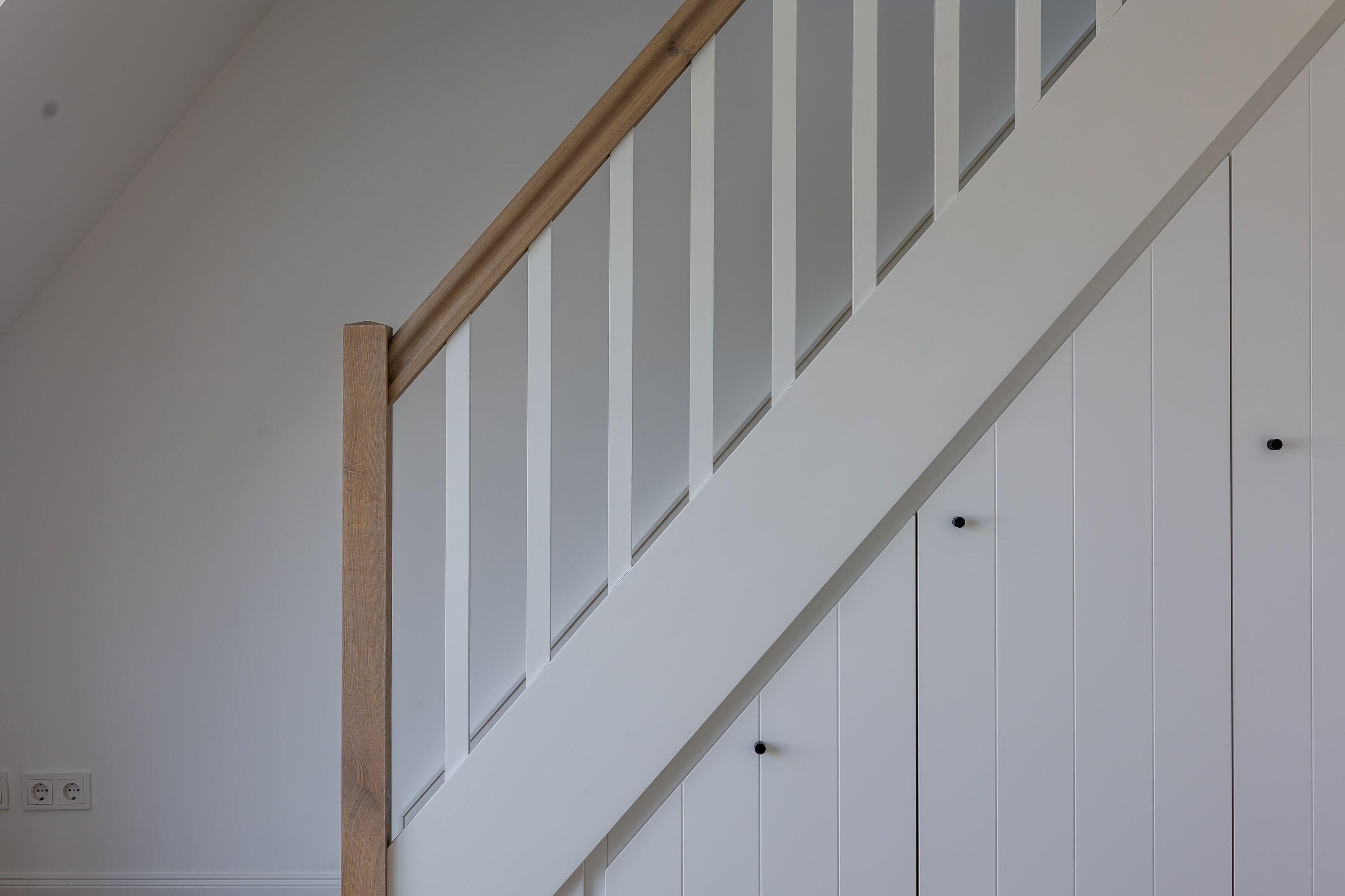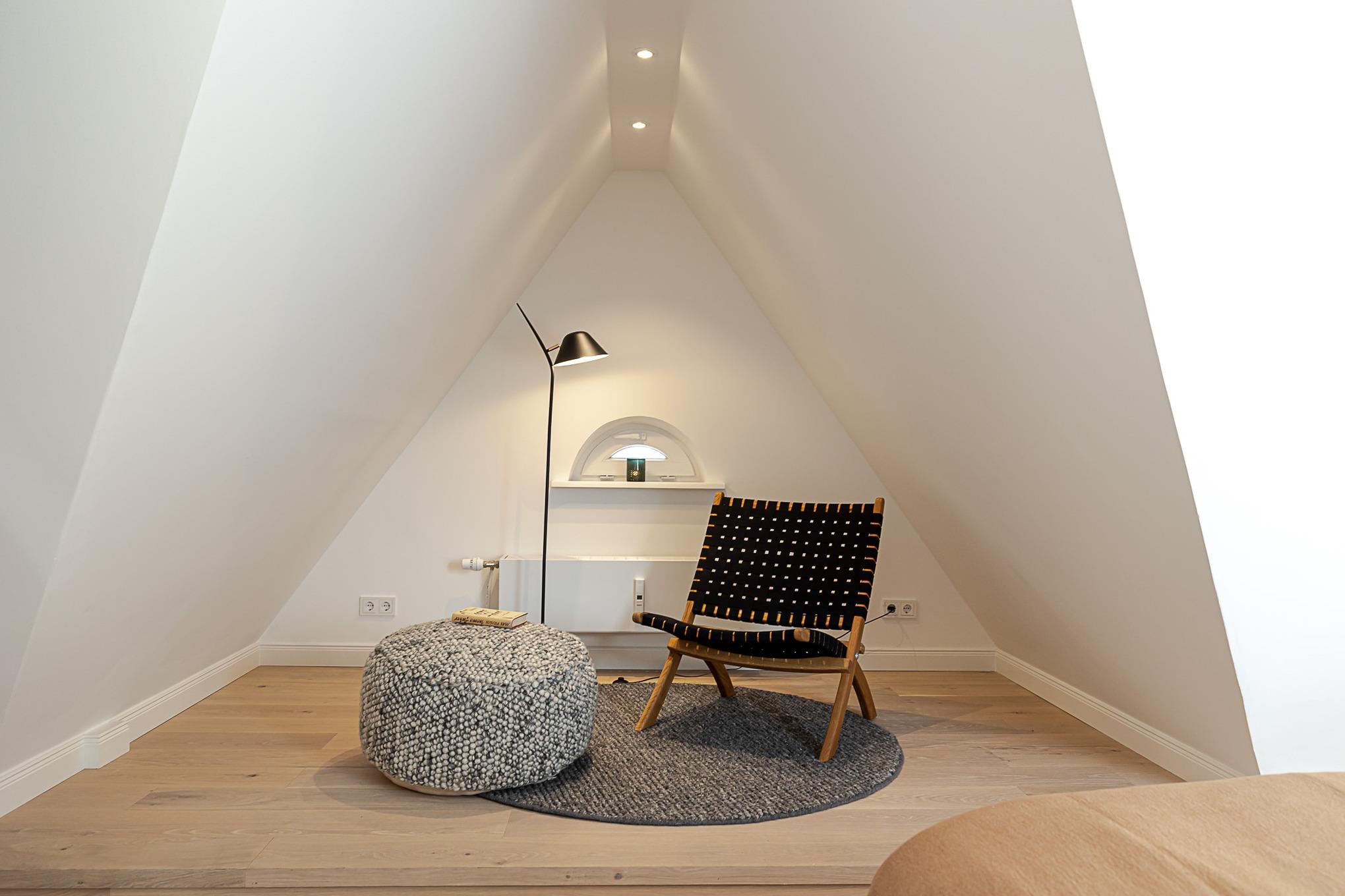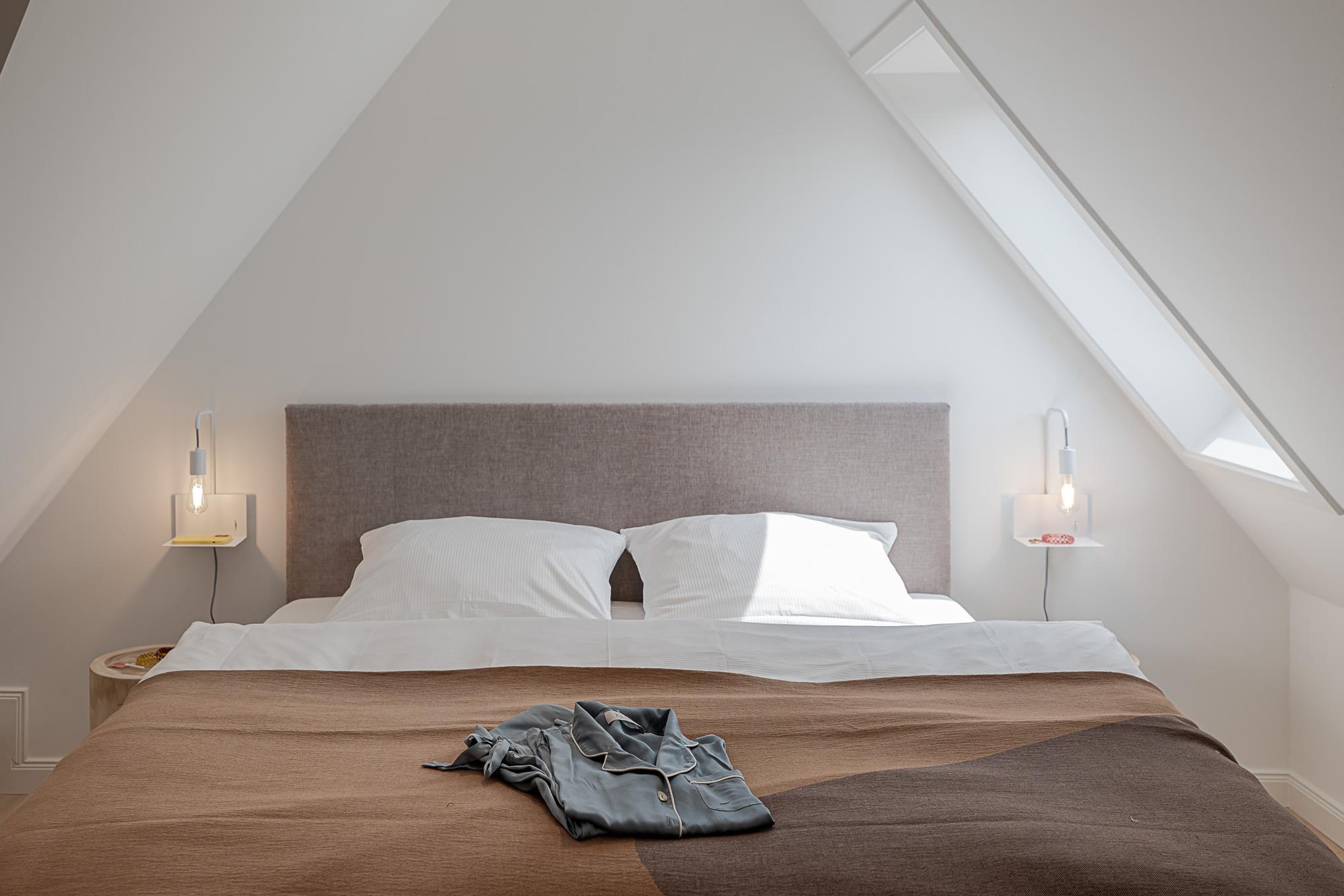 Über eine Treppe erreichen Sie den oberen Bereich der Wohnung mit dem Schlafzimmer, ausgestattet mit einem komfortablen Boxspringbett für ruhige, erholsame Nächte.