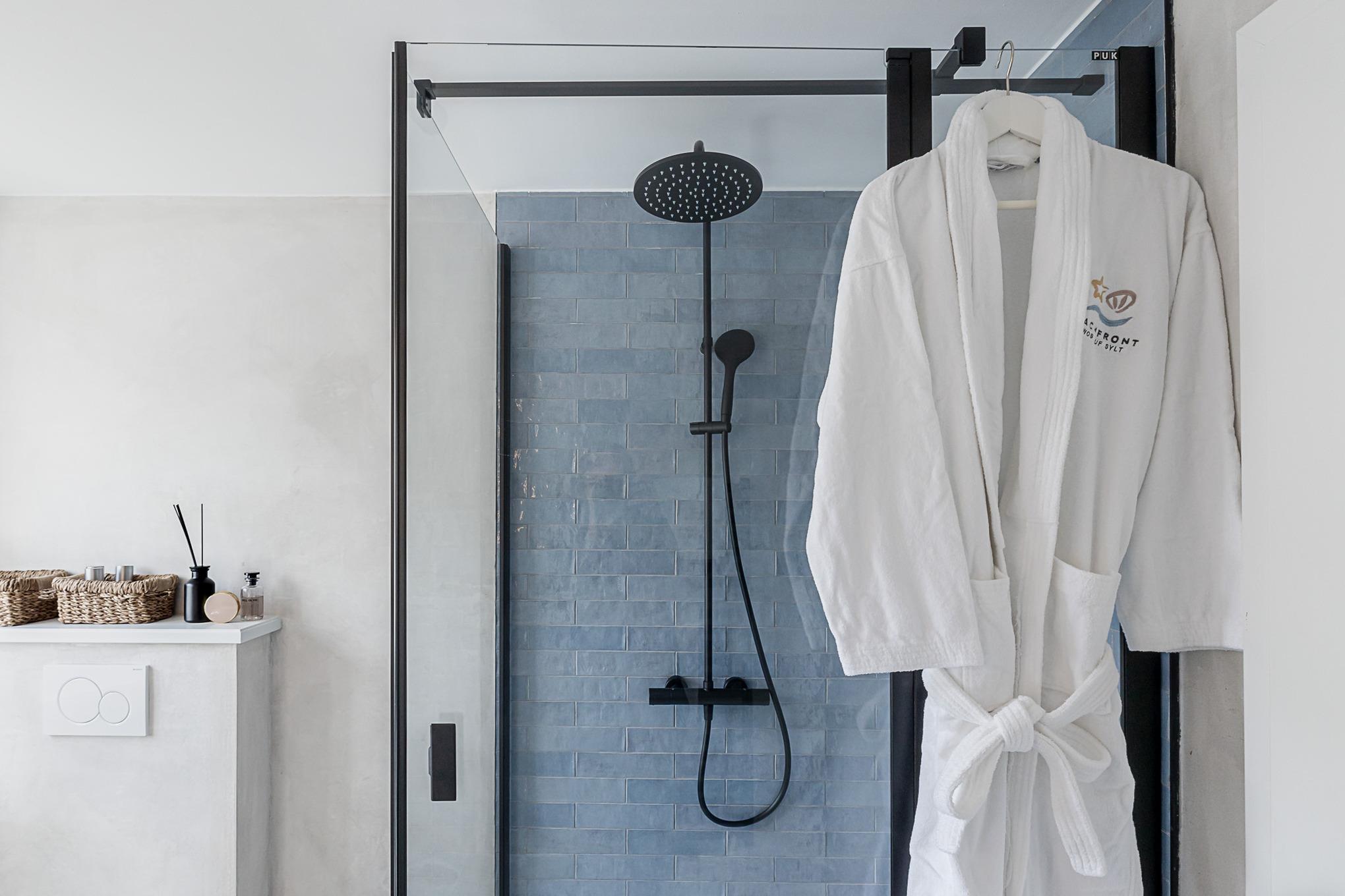 Das stilvolle Bad ist in Meerblau- und Sandtönen gehalten und bietet eine großzügige Regendusche, Fußbodenheizung und einen Handtuchwärmer – ideal für entspannte Wohlfühlmomente nach einem Tag am Meer.