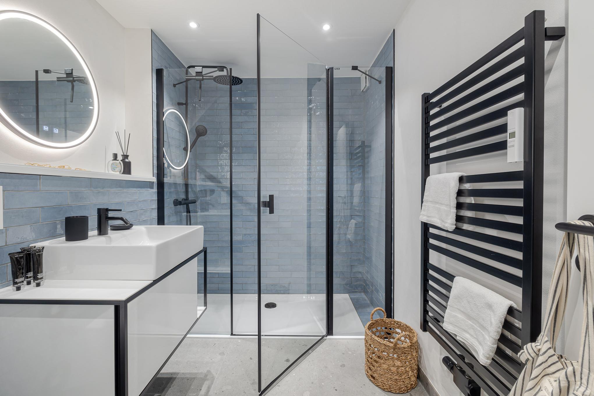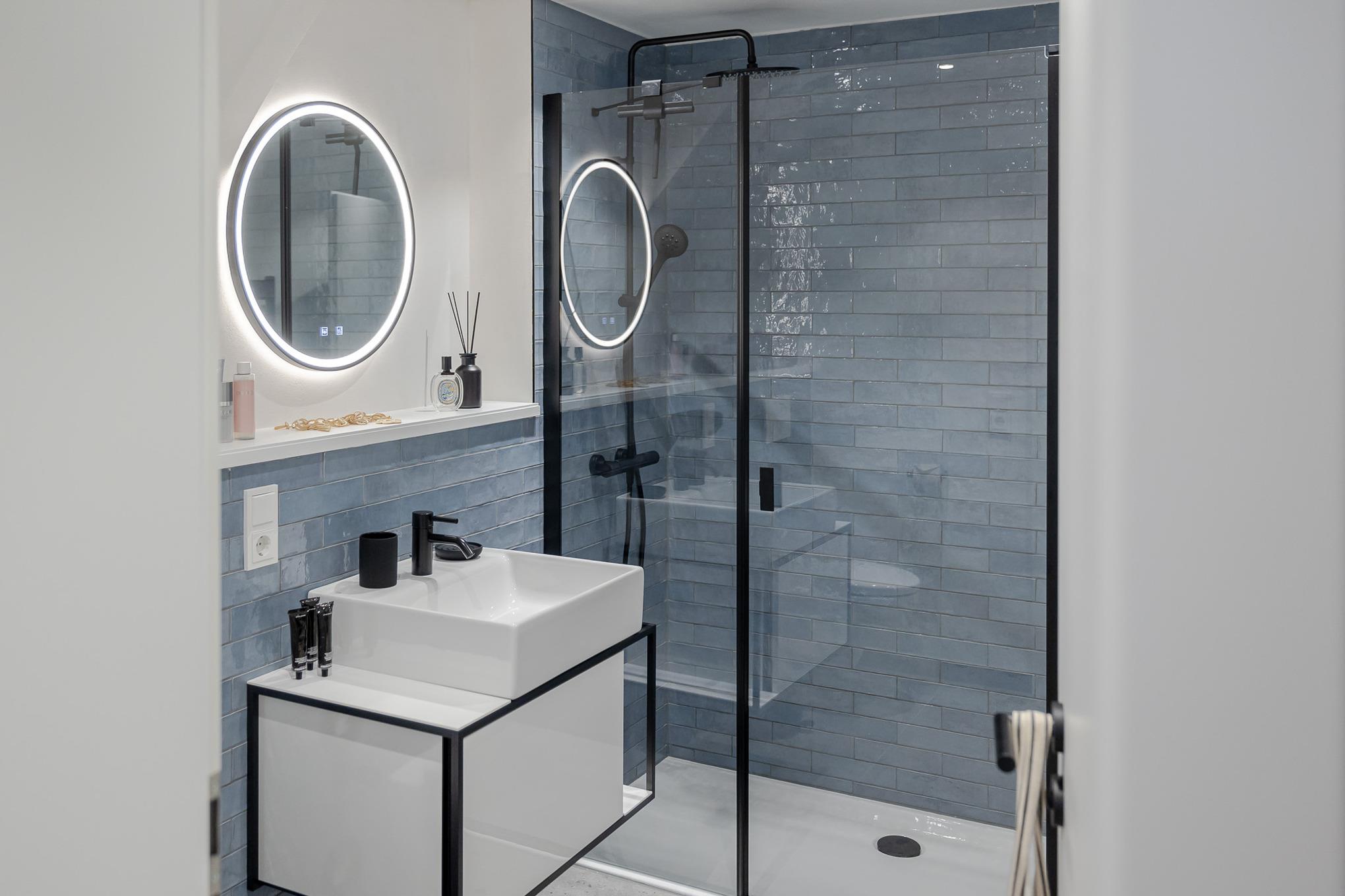 Das maritim gestaltete Badezimmer lädt mit Regendusche und Fußbodenheizung zum Entspannen ein und sorgt auch an kühleren Tagen für angenehmes Wohlfühlklima. Zur Wohnung gehört eine eigene Terrasse, die von Mai bis Oktober mit modernen Loungemöbeln ausgestattet ist. Ob Frühstück in der Sonne oder ein Glas Wein am Abend – hier genießen Sie entspannte Inselmomente an der frischen Nordseeluft.