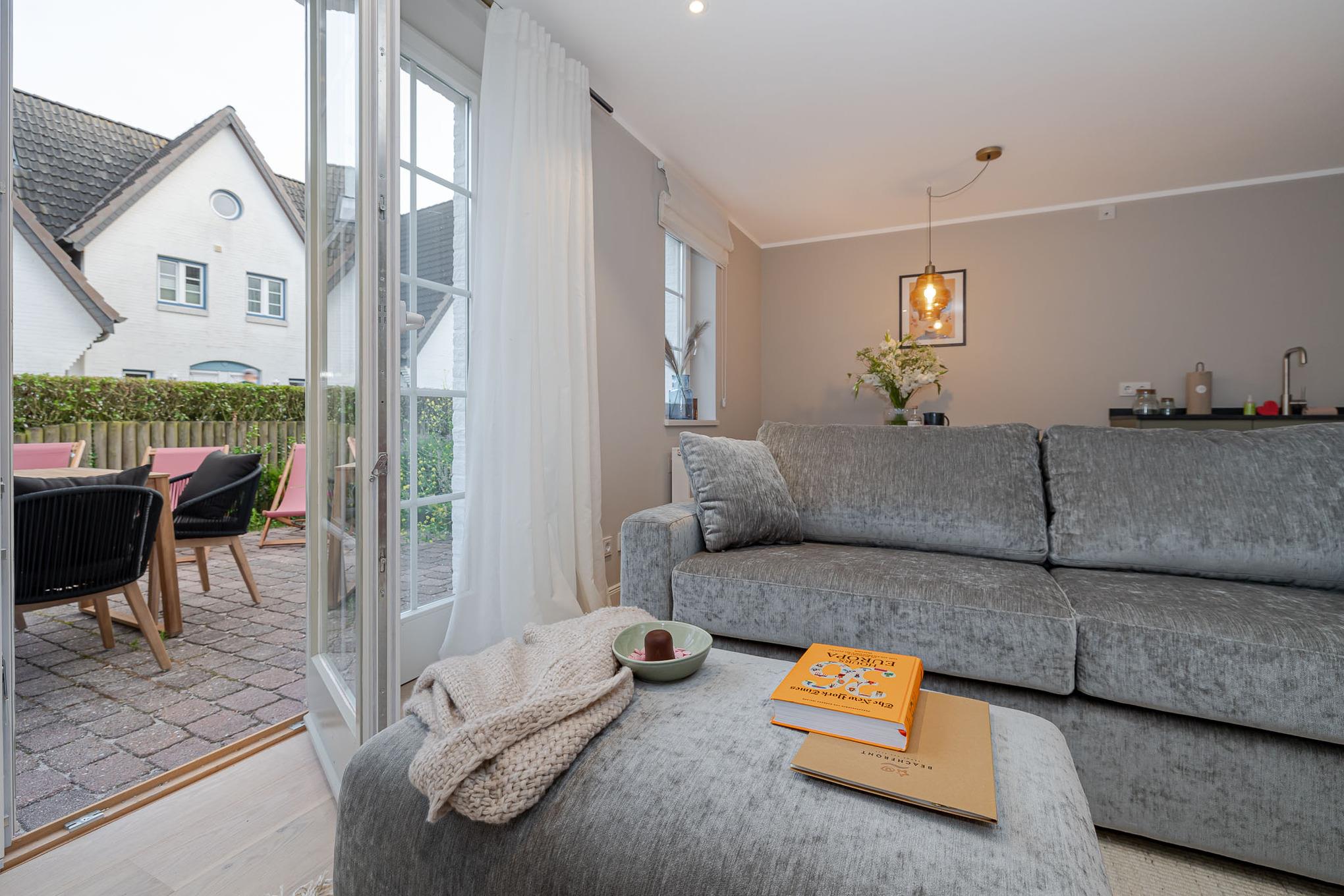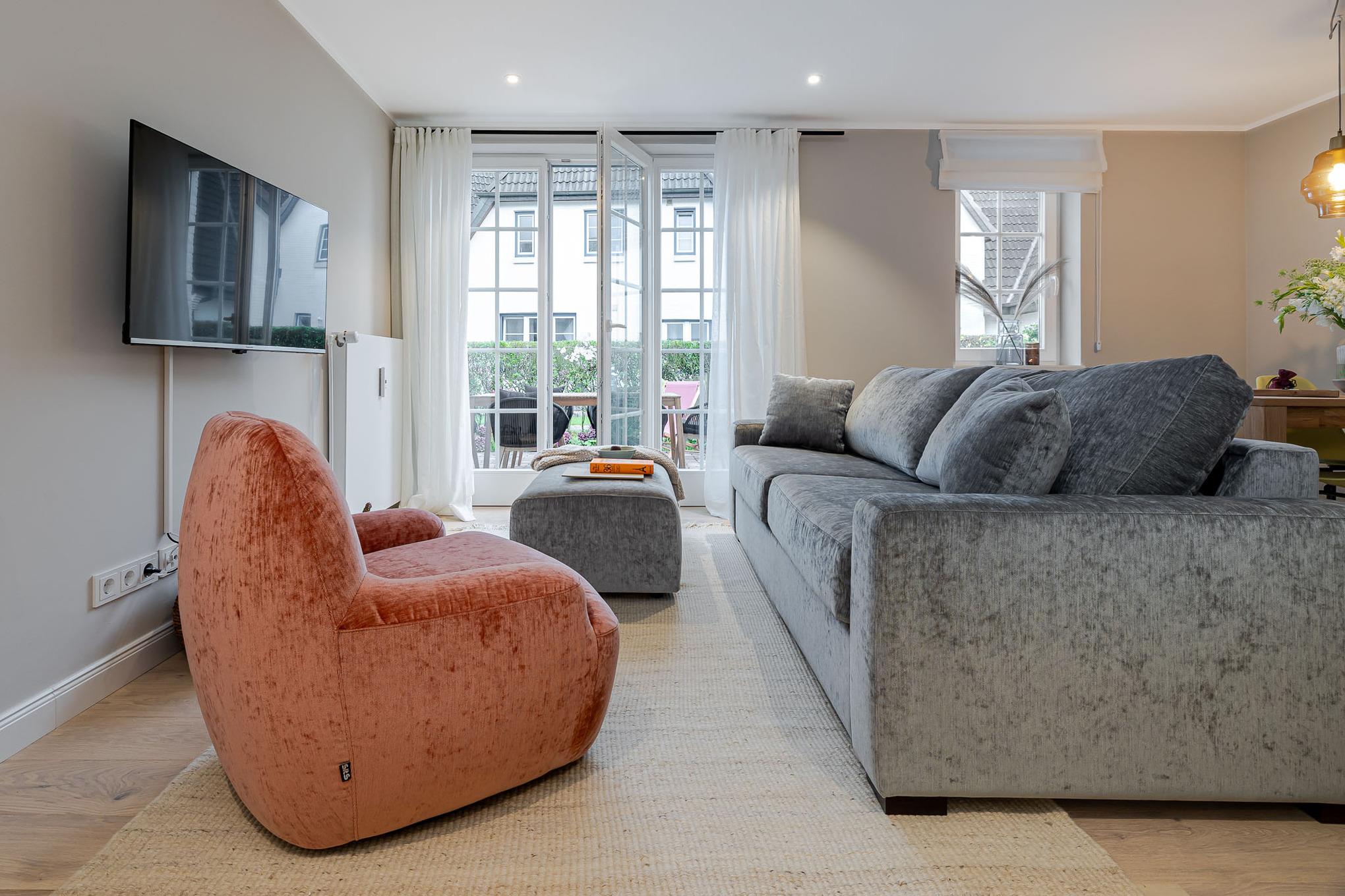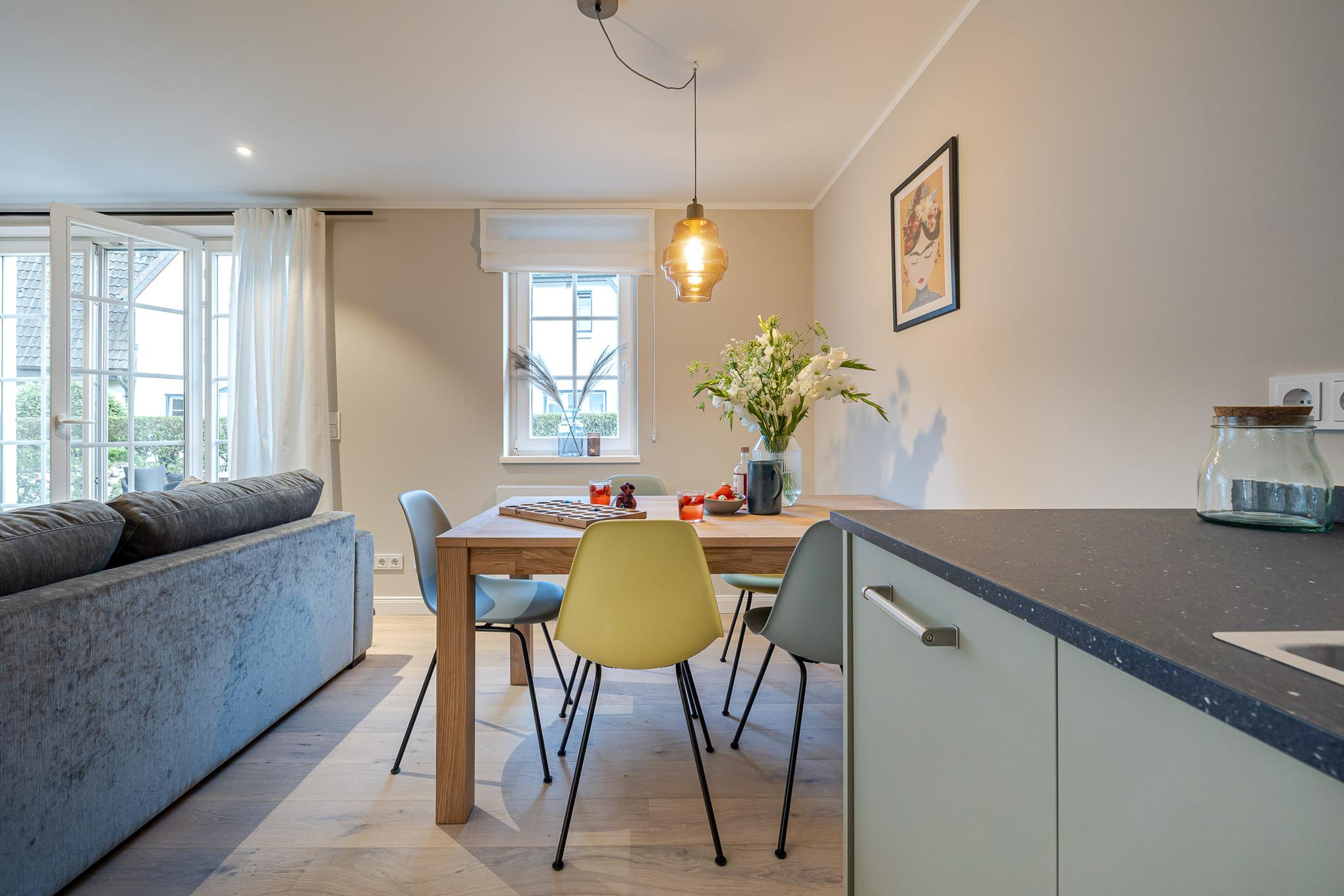 Der großzügige Wohn- und Essbereich verfügt über ein weiteres vollwertiges Schlafsofa sowie eine hochwertig ausgestattete Küche mit Markengeräten (u. a. Miele) und umfangreichem Küchenequipment – perfekt für gemeinsames Kochen wie zuhause.