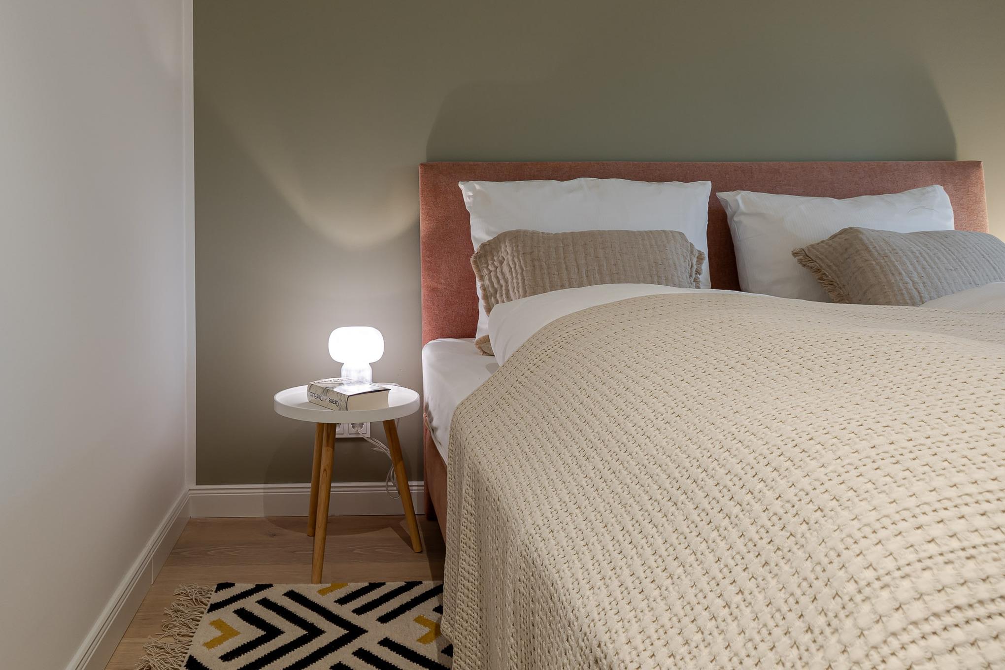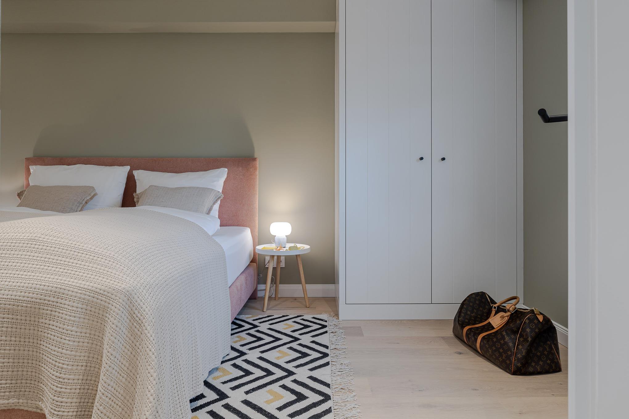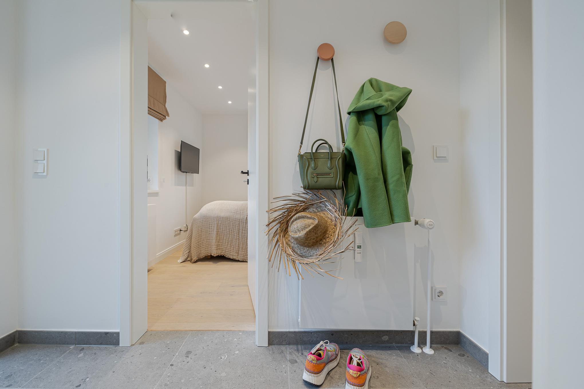 Vom Eingangsbereich erreichen Sie direkt die beiden Schlafzimmer. Diese sind mit einem hochwertigen Schramm-Boxspringbett ausgestattet. Maßgefertigte Einbauschränke in der gesamten Wohnung sorgen für viel Stauraum und Ordnung.