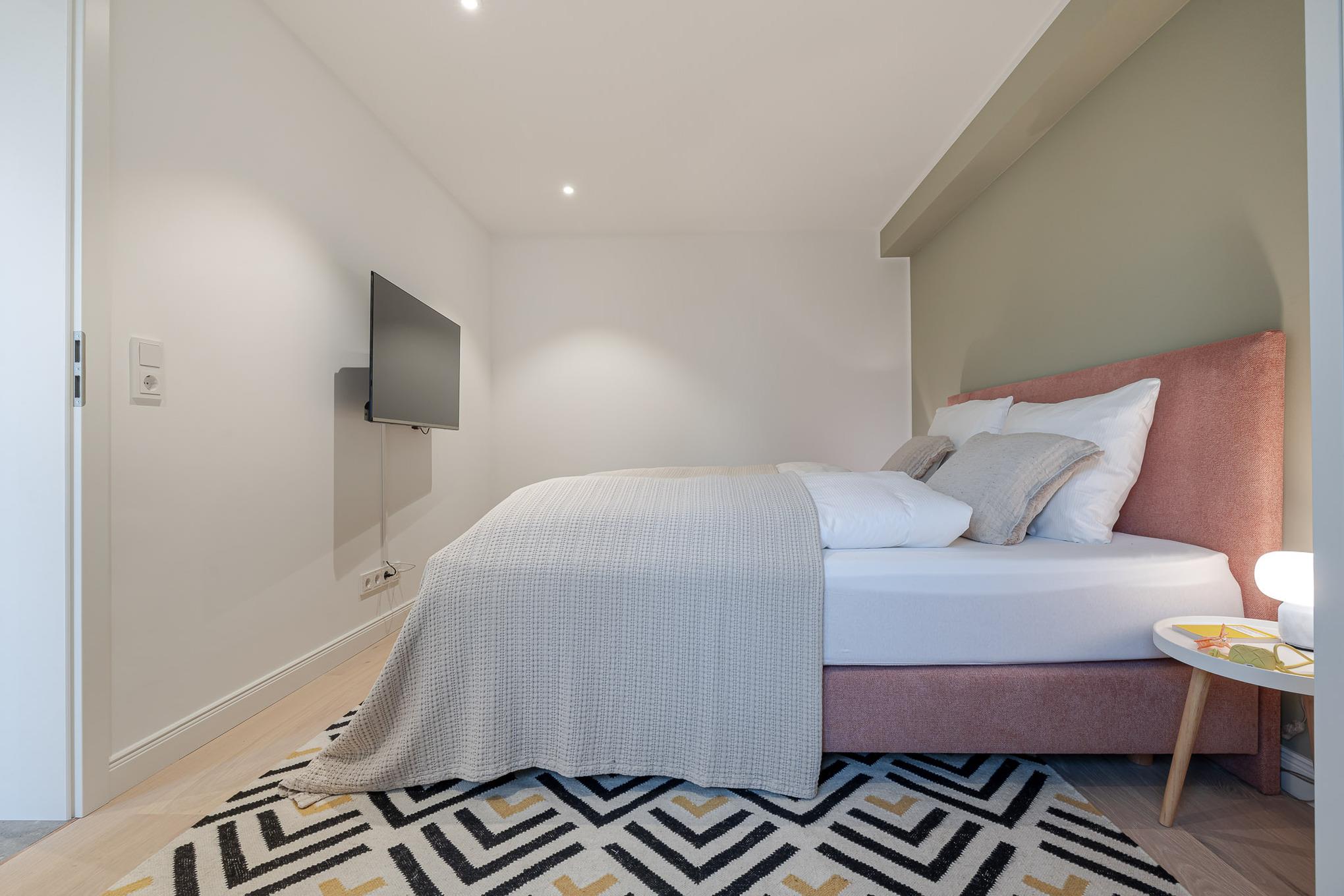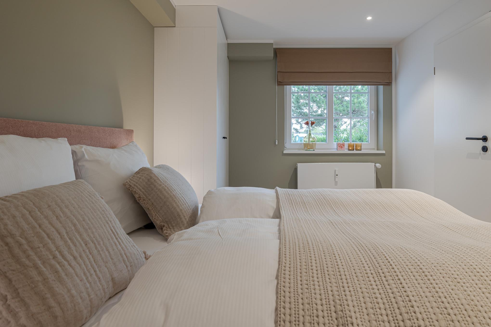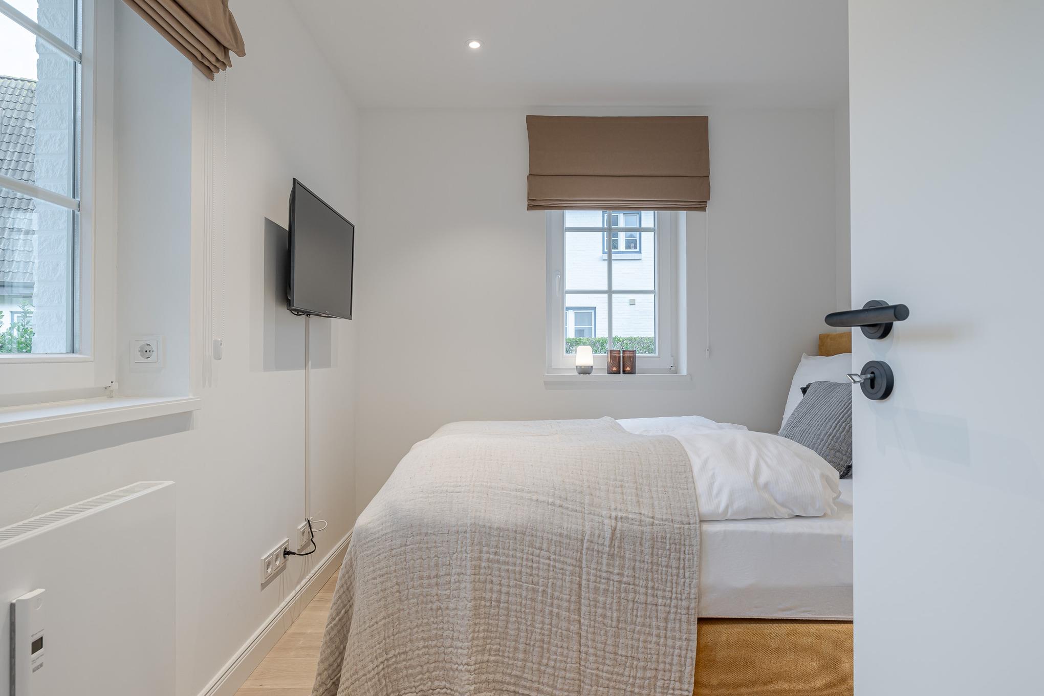 Vom Eingangsbereich erreichen Sie direkt die beiden Schlafzimmer. Diese sind mit einem hochwertigen Schramm-Boxspringbett ausgestattet. Maßgefertigte Einbauschränke in der gesamten Wohnung sorgen für viel Stauraum und Ordnung.