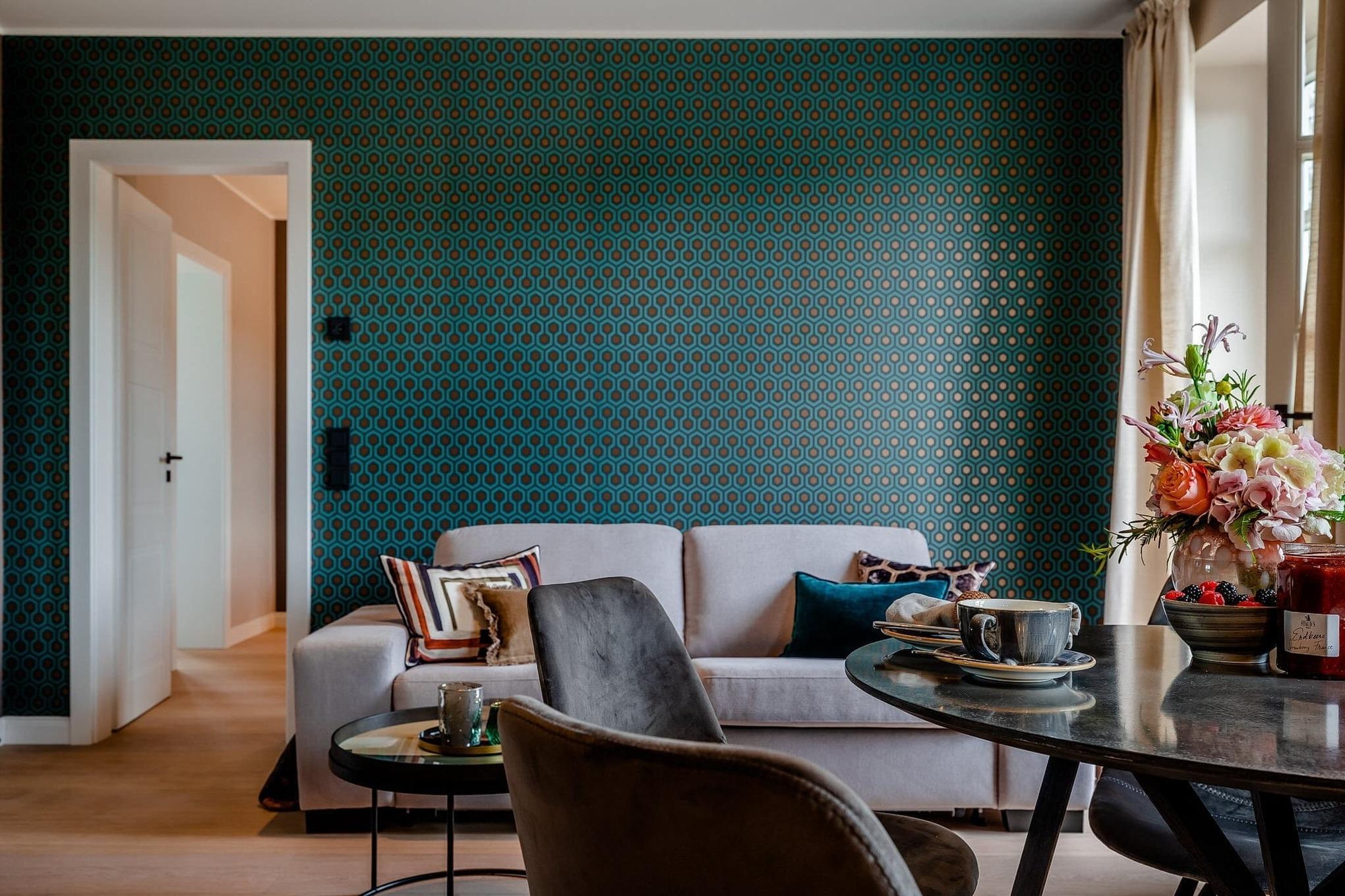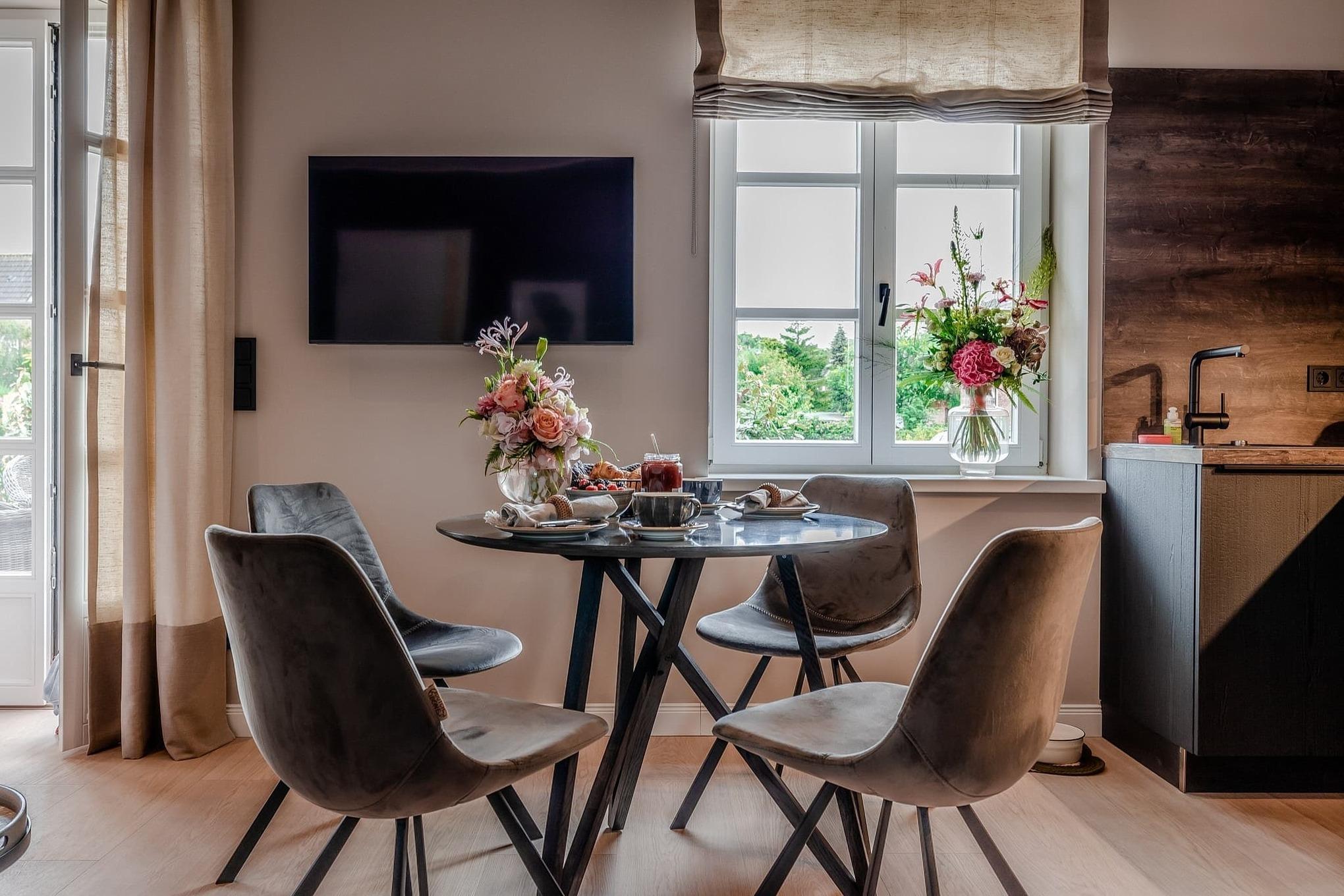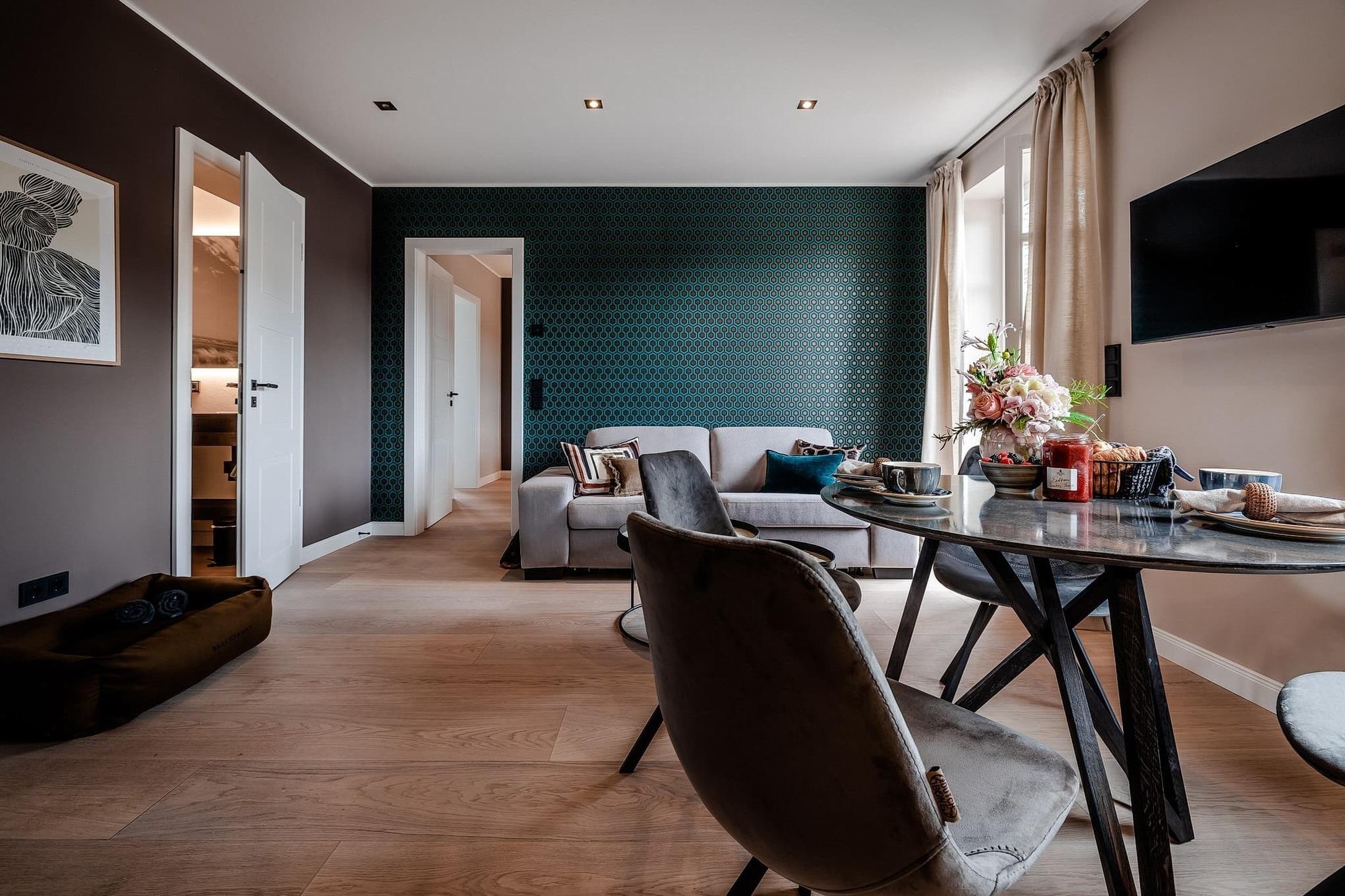 Schon beim Ankommen spüren Sie die besondere Atmosphäre: hohe Decken und eine moderne, hochwertige Einrichtung schaffen ein luftiges, wohnliches Ambiente. Der offene Wohn- und Essbereich ist der Mittelpunkt der Wohnung. Ein bequemes Schlafsofa ergänzt den Raum und bietet bei Bedarf eine zusätzliche Schlafmöglichkeit.