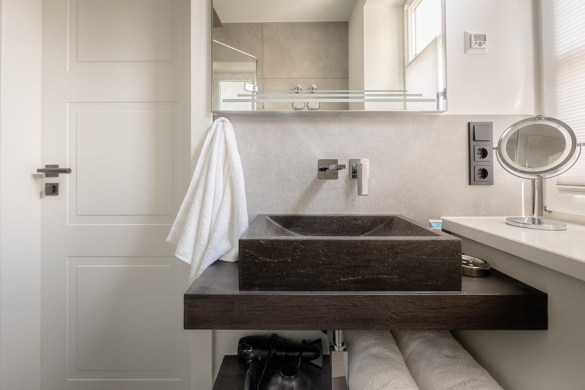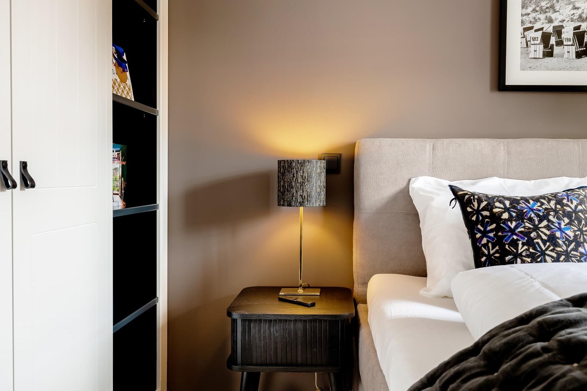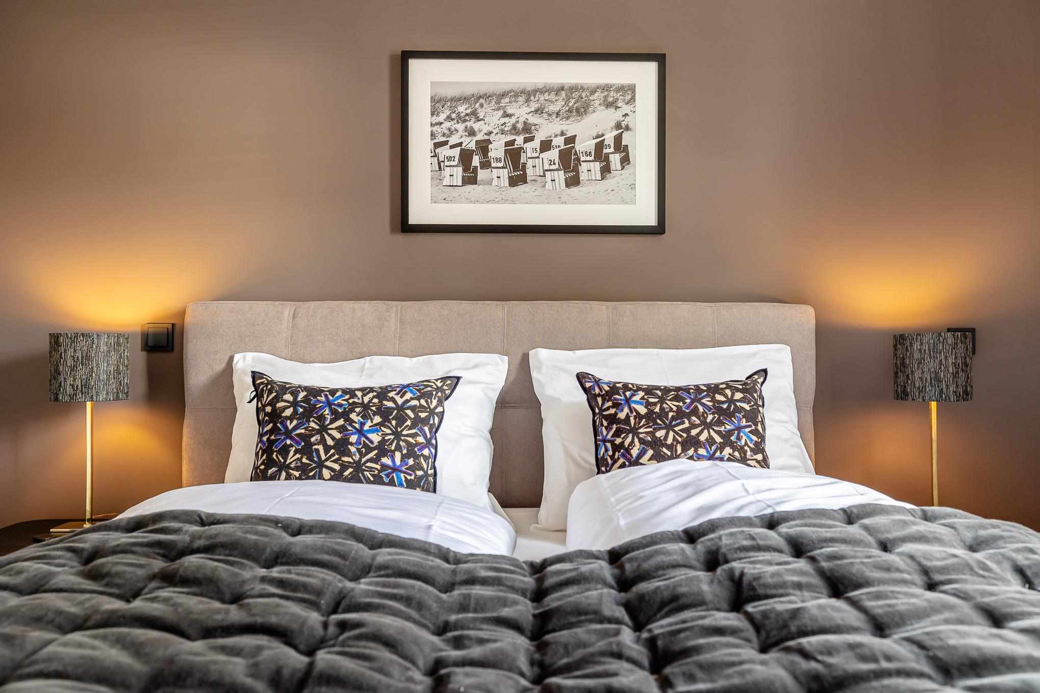 Im separaten Schlafzimmer sorgt ein hochwertiges COCO-MAT-Boxspringbett für erholsame Nächte. Das stilvolle Badezimmer mit großer Regendusche lädt zum Durchatmen und Abschalten ein. Die Fußbodenheizung in der gesamten Wohnung sorgt auch an kühleren Tagen für wohlige Wärme. Bei Anreise erwartet Sie ein kleines Starterpaket für Küche und Bad.
