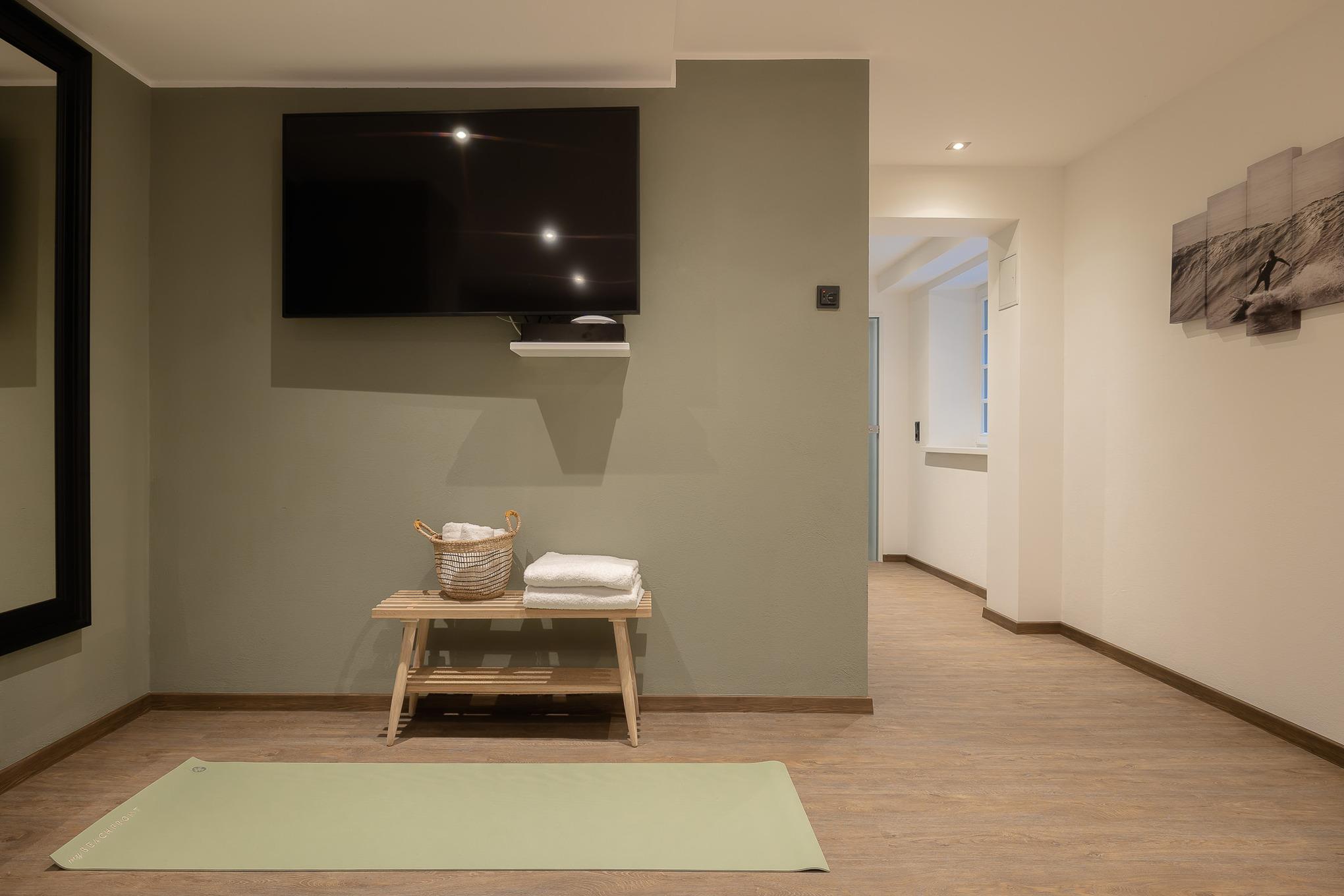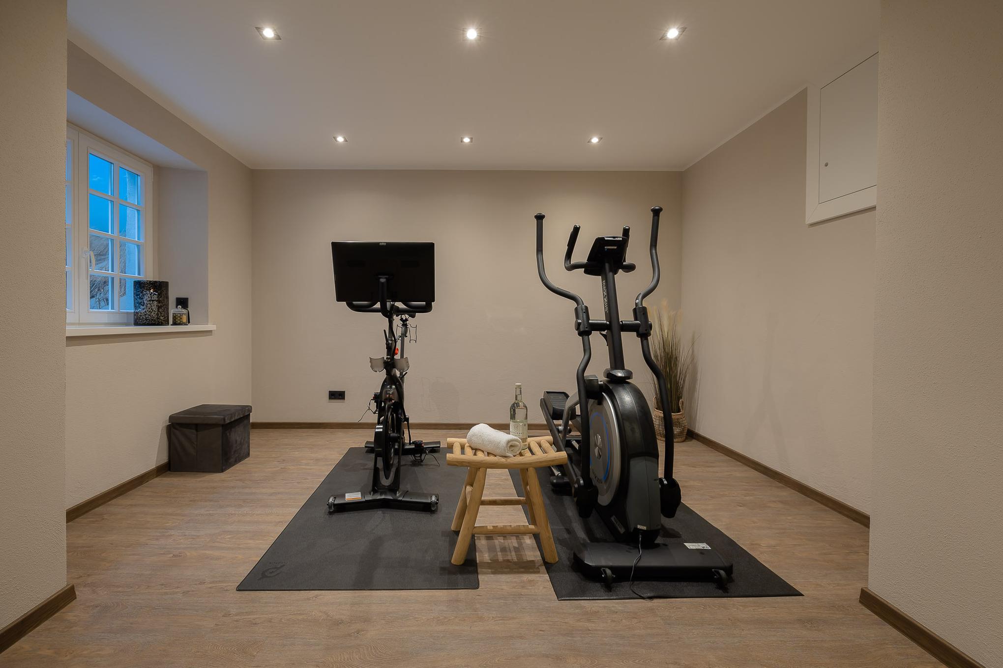 Als Gast von Living Lorens nutzen Sie kostenfrei den Fitnessraum mit Peloton®-Bike, Crosstrainer und Spiegelwand sowie die Sauna mit Liegen. Yogamatten können auf Wunsch dazugebucht werden.