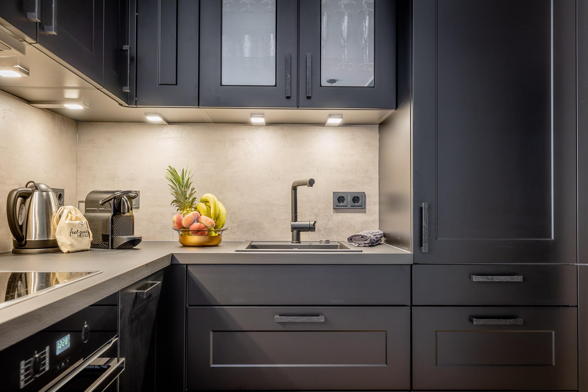 Schon beim Eintreten spürt man die besondere Atmosphäre: hohe Decken und eine moderne, harmonisch abgestimmte Einrichtung schaffen ein luftiges und zugleich gemütliches Wohngefühl. Der offene Wohn- und Essbereich ist das Herz der Wohnung. Ein komfortables Schlafsofa ergänzt den Raum und bietet bei Bedarf eine zusätzliche Schlafmöglichkeit.