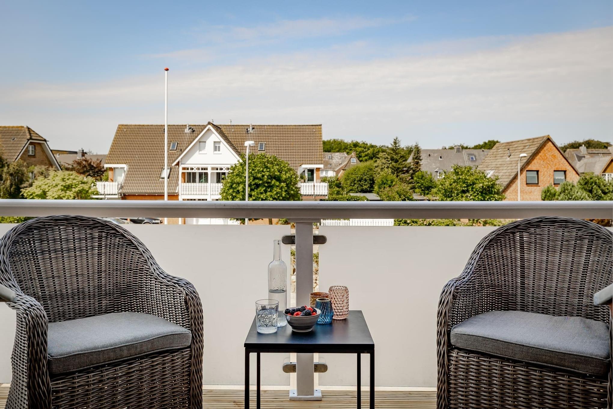 Die hochwertige Küche ist mit Gaggenau- und Miele-Geräten ausgestattet und lädt zum Kochen, Genießen und Zusammensein ein. Von hier aus gelangen Sie direkt auf den westlich ausgerichteten Balkon, wo sich die Sonnenuntergänge über Westerland besonders schön erleben lassen – mit einem Glas Wein in der Hand und der Brise der Nordsee im Haar.