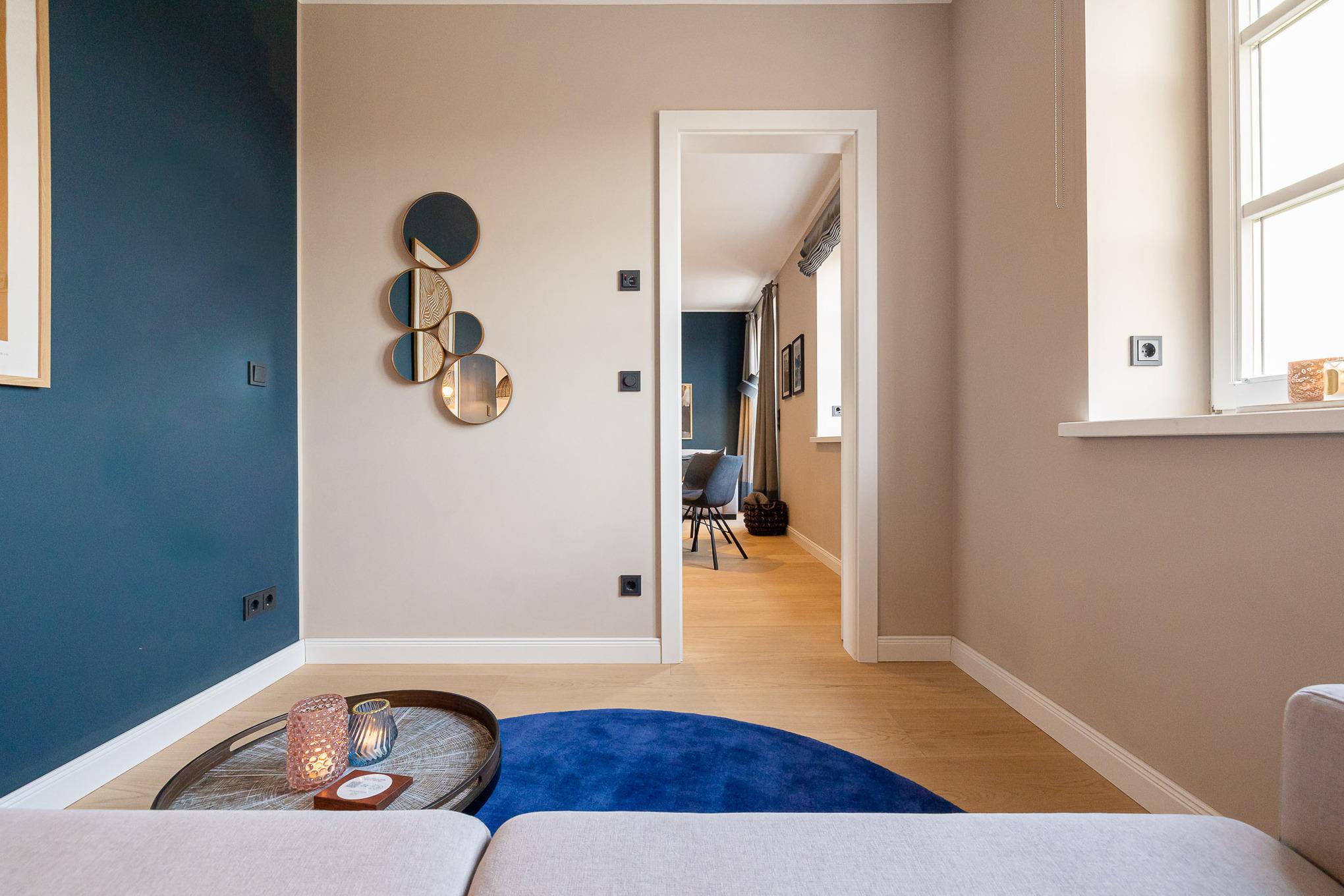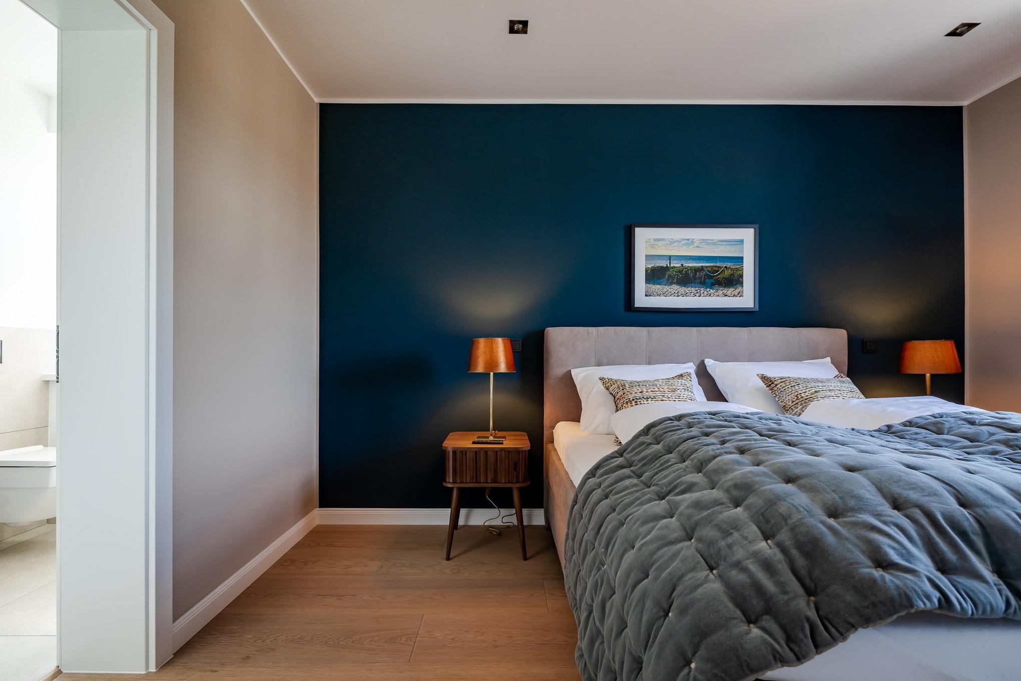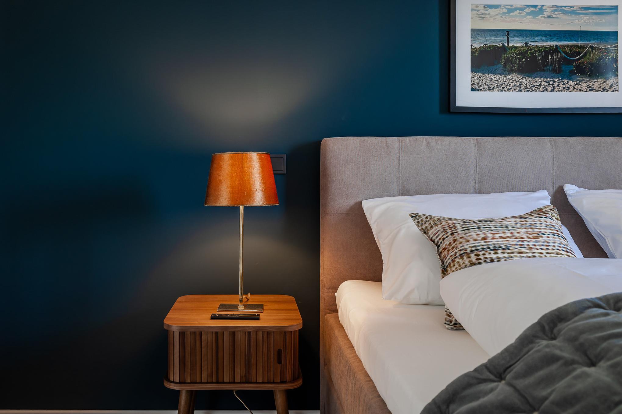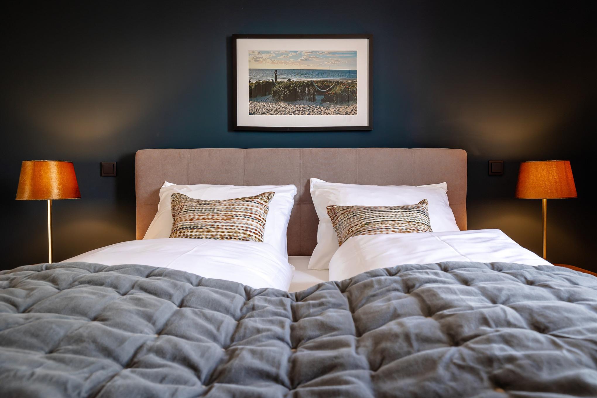 Für erholsamen Schlaf sorgen zwei separate Schlafzimmer: Im größeren erwartet Sie ein exklusives COCO-MAT-Boxspringbett, im zweiten ein hochwertiges Boxspring-Schlafsofa. Das moderne Badezimmer mit Regendusche bietet Ihnen Ihren ganz persönlichen Wellnessmoment. Ein Starterpaket für Küche und Bad liegt bei Anreise für Sie bereit, ebenso sorgt die Fußbodenheizung in der gesamten Wohnung das ganze Jahr über für behagliche Wärme.