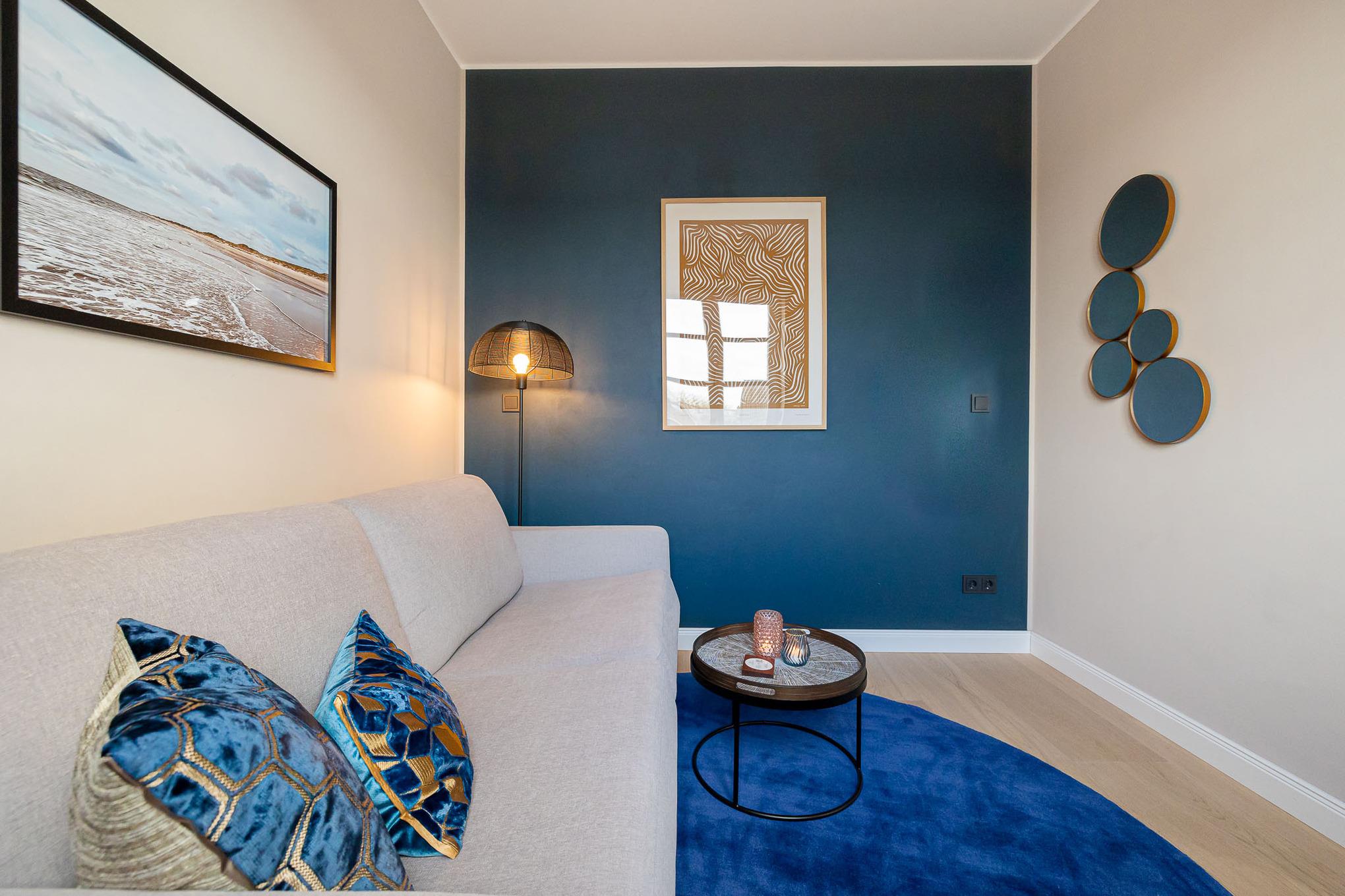 Schon beim Eintreten empfängt Sie ein offenes, lichtdurchflutetes Wohngefühl. Hohe Decken, klare Linien und eine moderne, warme Einrichtung schaffen eine Atmosphäre, die sofort ankommen lässt. Der großzügige Wohn- und Essbereich mit komfortablem Schlafsofa bildet den Mittelpunkt der Wohnung – perfekt für gemeinsame Abende nach Strand und Stadtbummel.