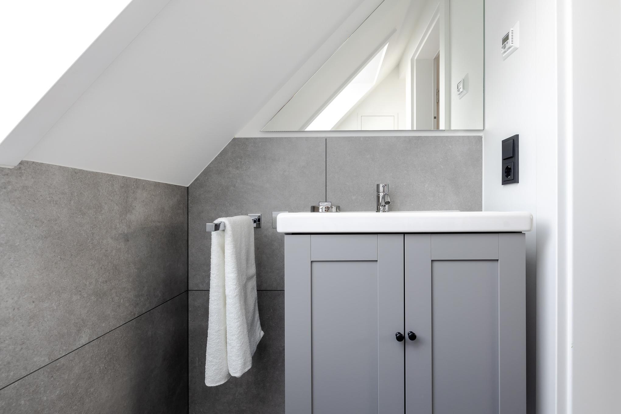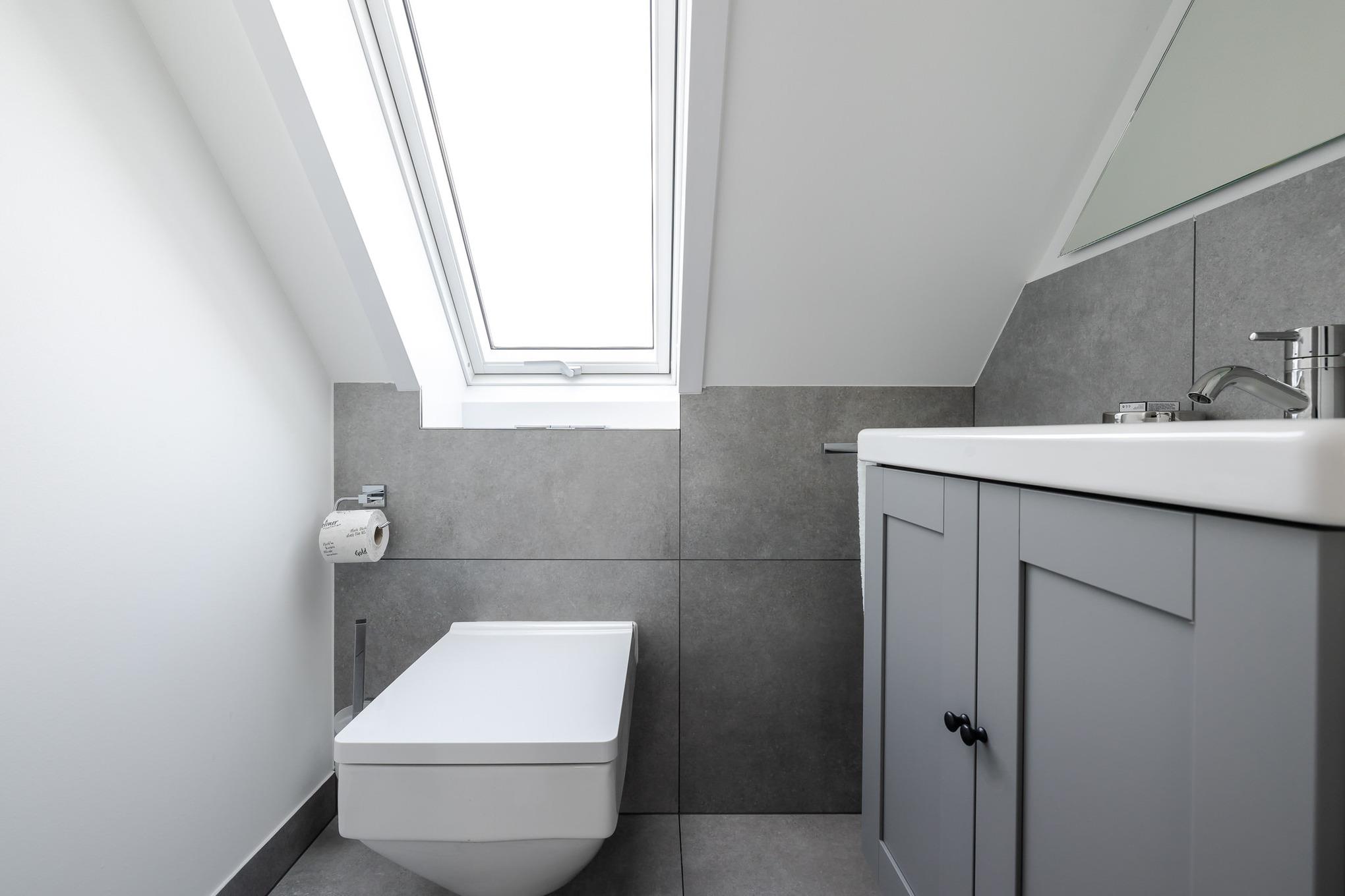 Auf der oberen Etage der Maisonette befindet sich ein zusätzlicher Wohn- und Arbeitsbereich mit Schreibtisch und Sofa sowie ein weiteres WC-Badezimmer. In der gesamten Wohnung sorgt Fußbodenheizung auch im Winter für eine angenehme Wohlfühltemperatur.