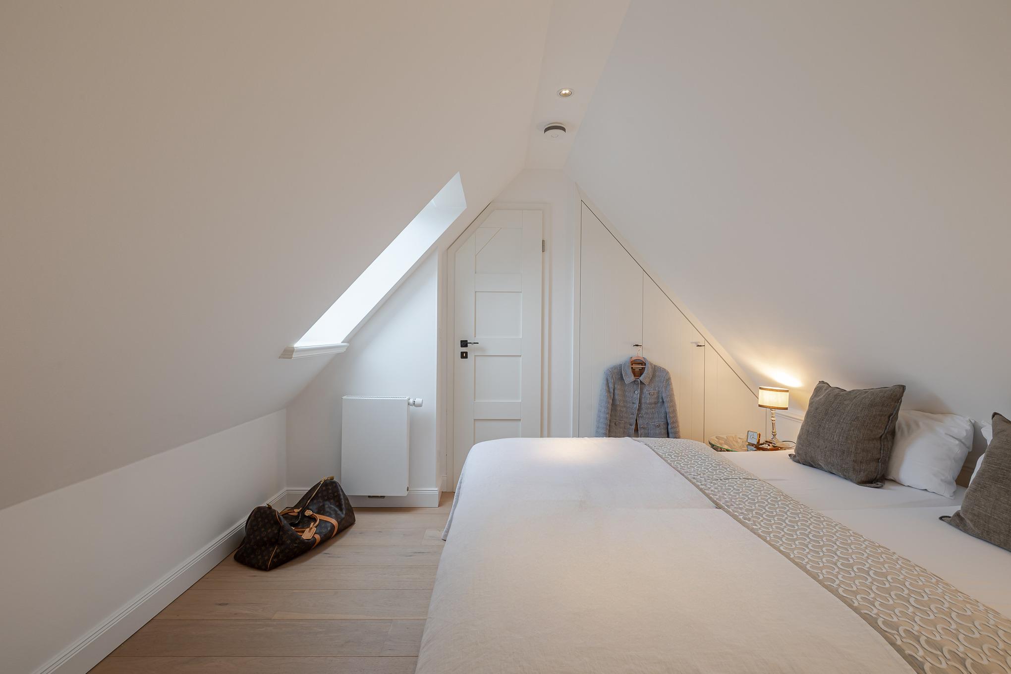 Das Schlafzimmer verfügt über ein komfortables Boxspringbett und ausreichend Stauraum. Das moderne Badezimmer ist mit Dusche, WC und Handtuchheizkörper ausgestattet.
