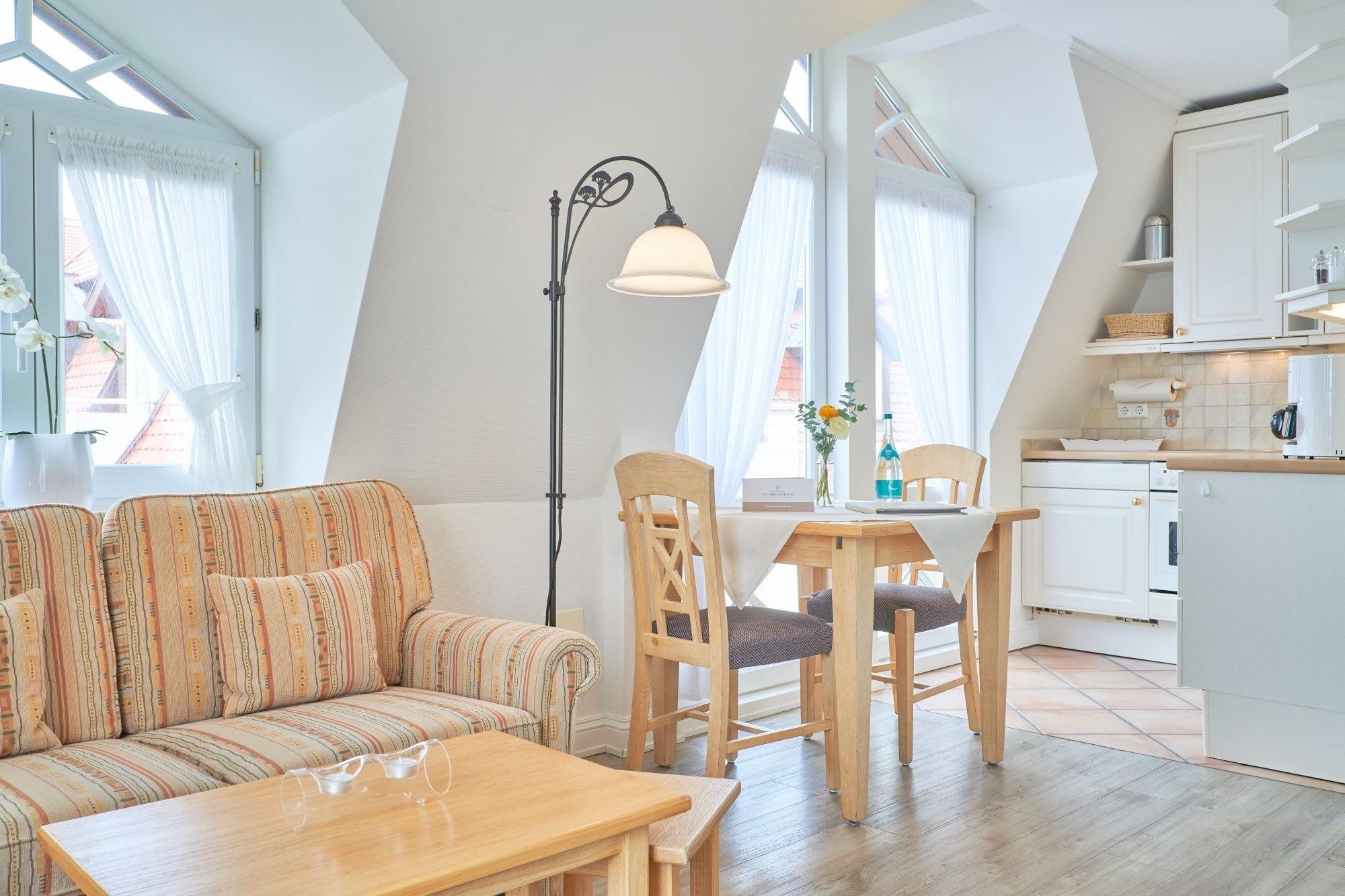 In dieser Wohnung finden sie einen Wohnraum mit integrierter Küche, Essplatz, ein gemütliche Schlafzimmer mit Doppelbett und ein Schlafzimmer mit einem Einzelschrankbett,