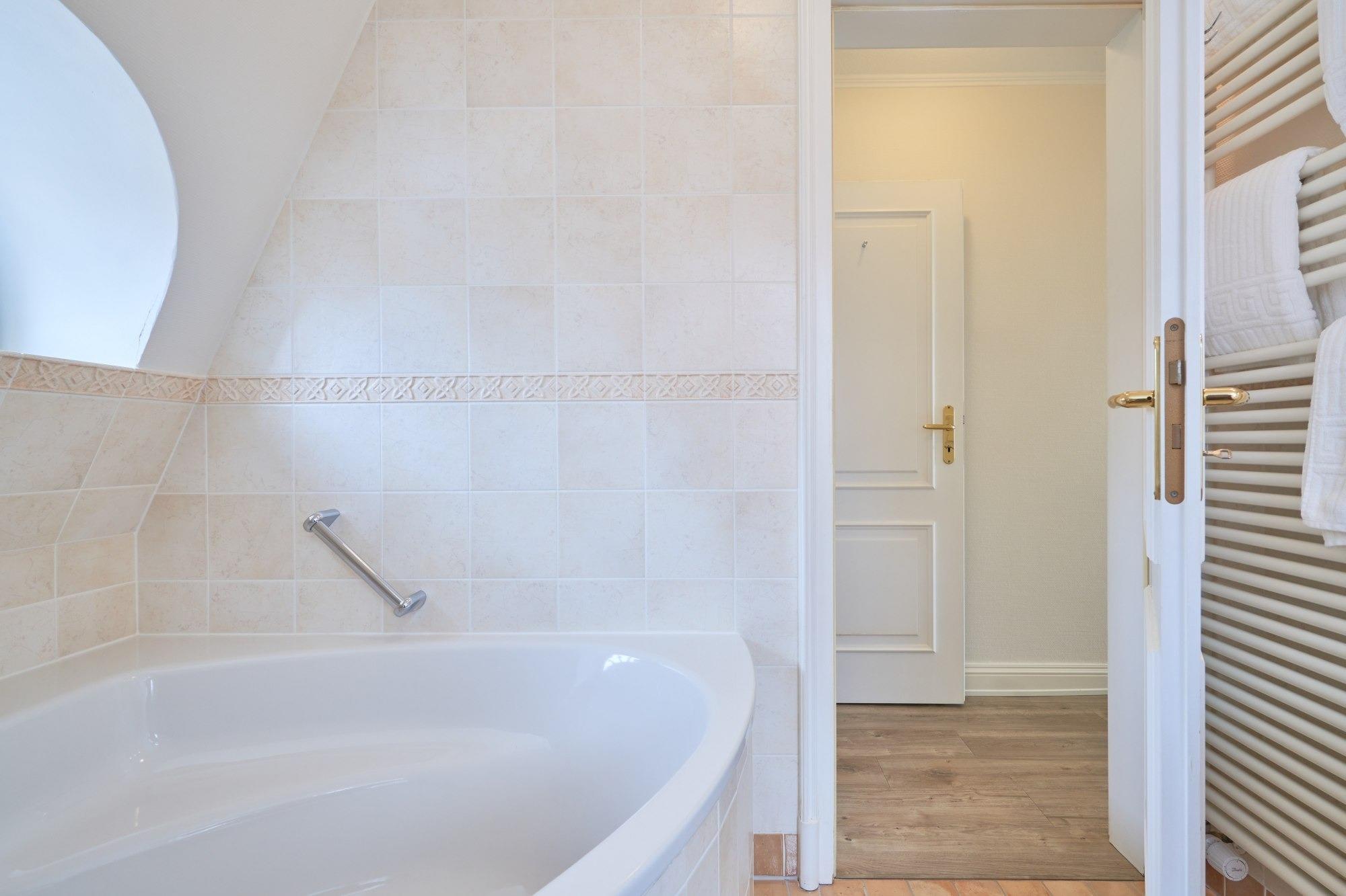 ein Badezimmer mit Badewanne und ein separates WC.