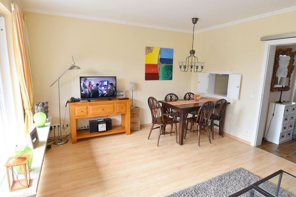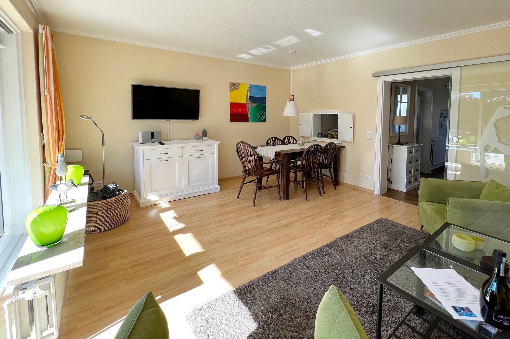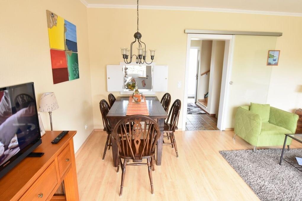 Erdgeschoss: Wohnzimmer mit Essecke und Sitzgruppe. Separate Küche mit Durchreiche zum Wohnzimmer und ein Gäste-WC