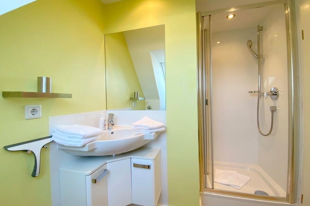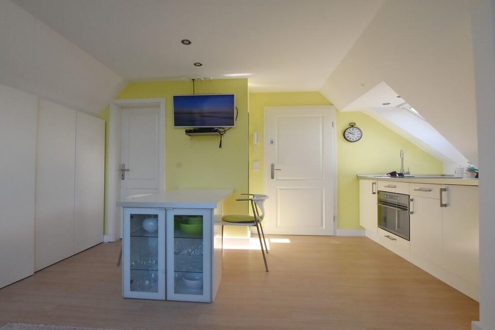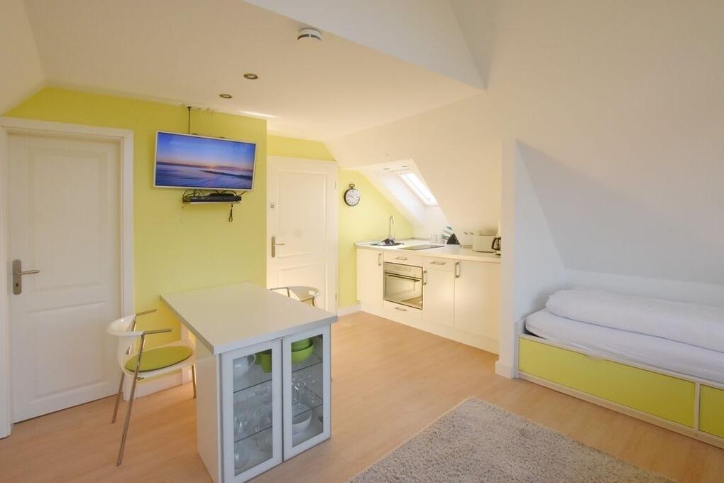 Modernes helles 1-Zimmer-Appartement (Dachgeschoss). Heller Kombinierter Wohn-Schlafraum mit 2 Einzelbetten, Lounge-Sessel, Küchenzeile und Duschbad. Im Garten des Hauses steht Ihnen ein Strandkorb zur Verfügung.