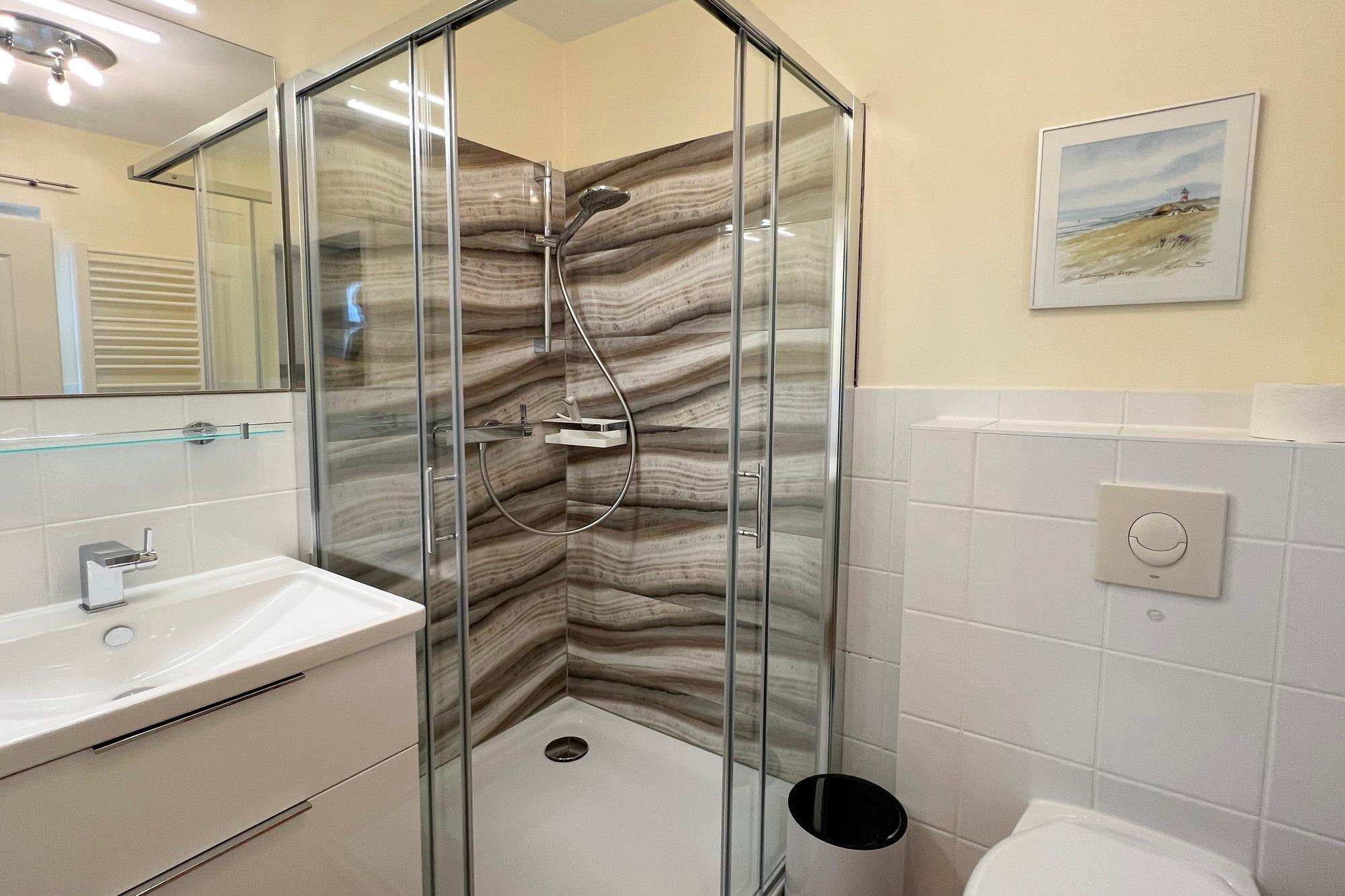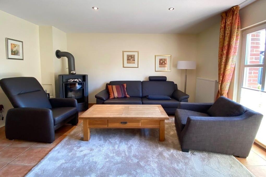 Ferienhaus (EG/OG/SB) mit Terrasse in zentraler und strandnaher Lage Westerlands, Wohnzimmer mit Sitzgruppe und Eßecke, Kaminofen, Fernseher (Smart-TV ), offene Küche mit Geschirrspüler, Backofen und Mikrowelle, 2 Duschbäder, 3 Schlafzimmer für je 2 Personen, Waschmaschine und Trockner, 1 PWK-Stellplatz.