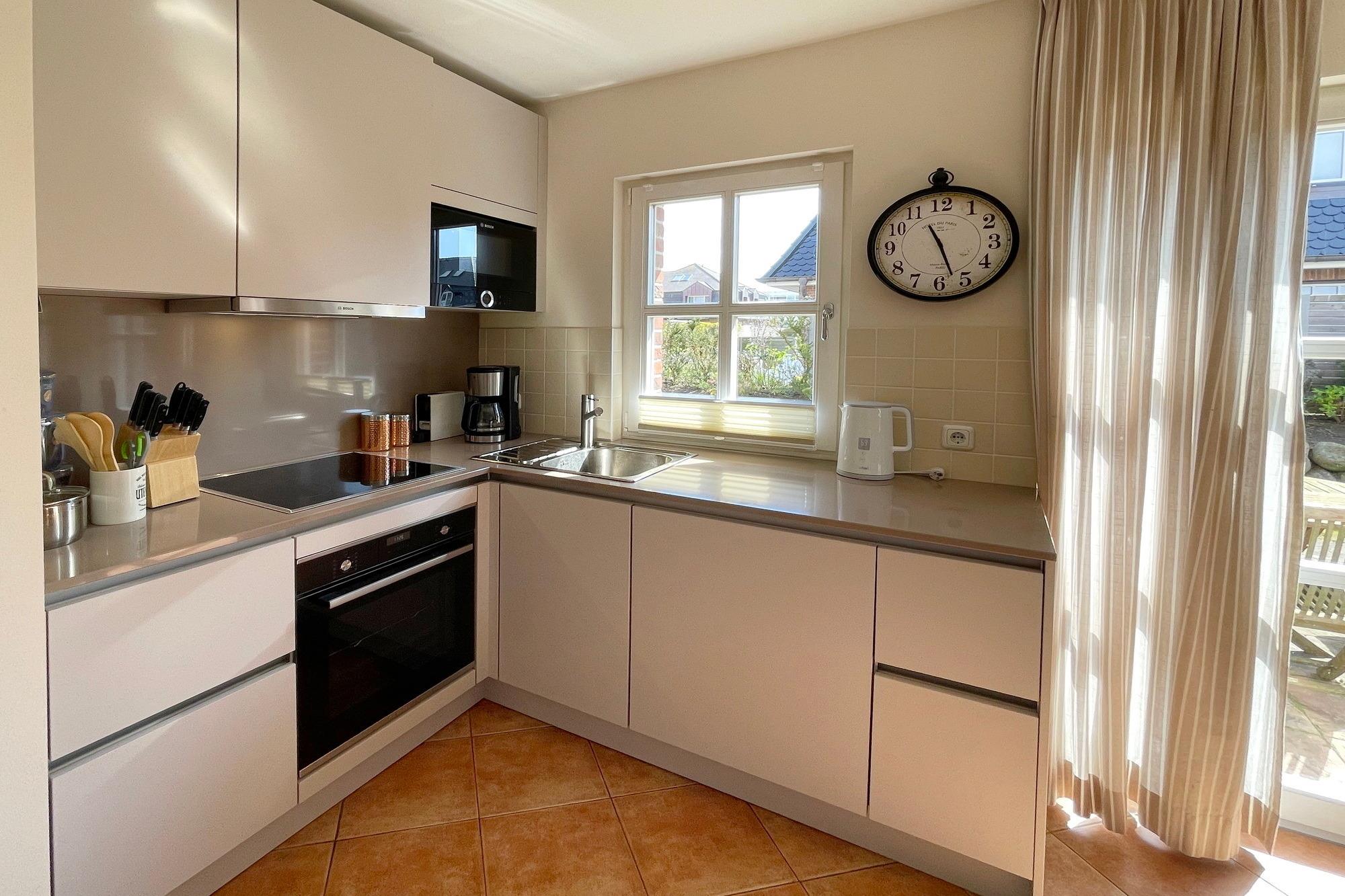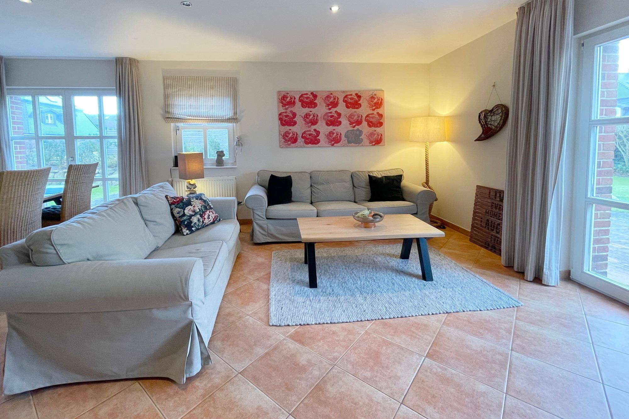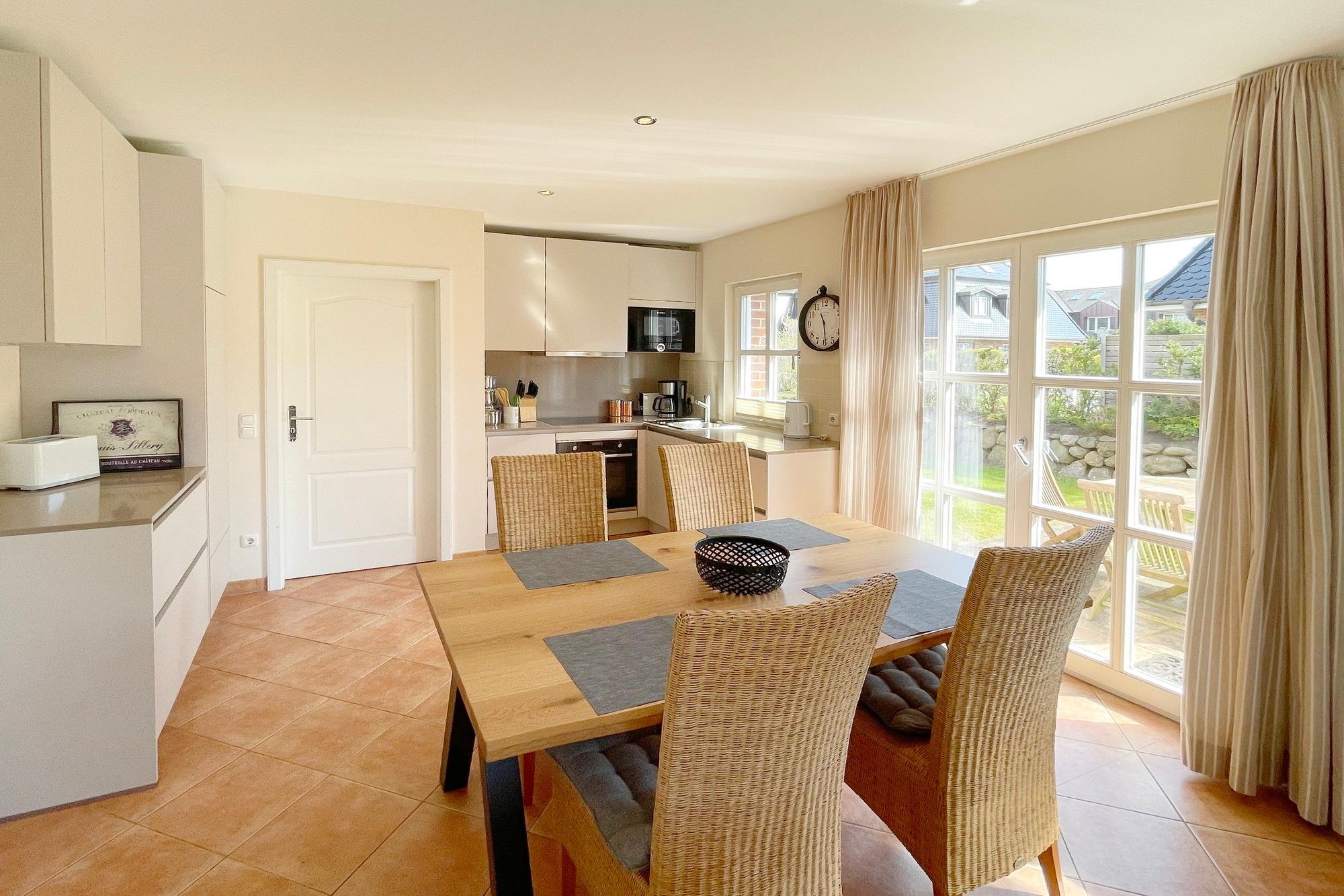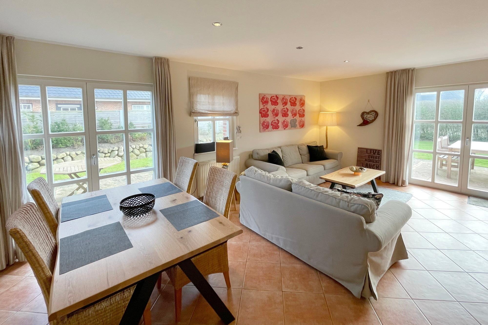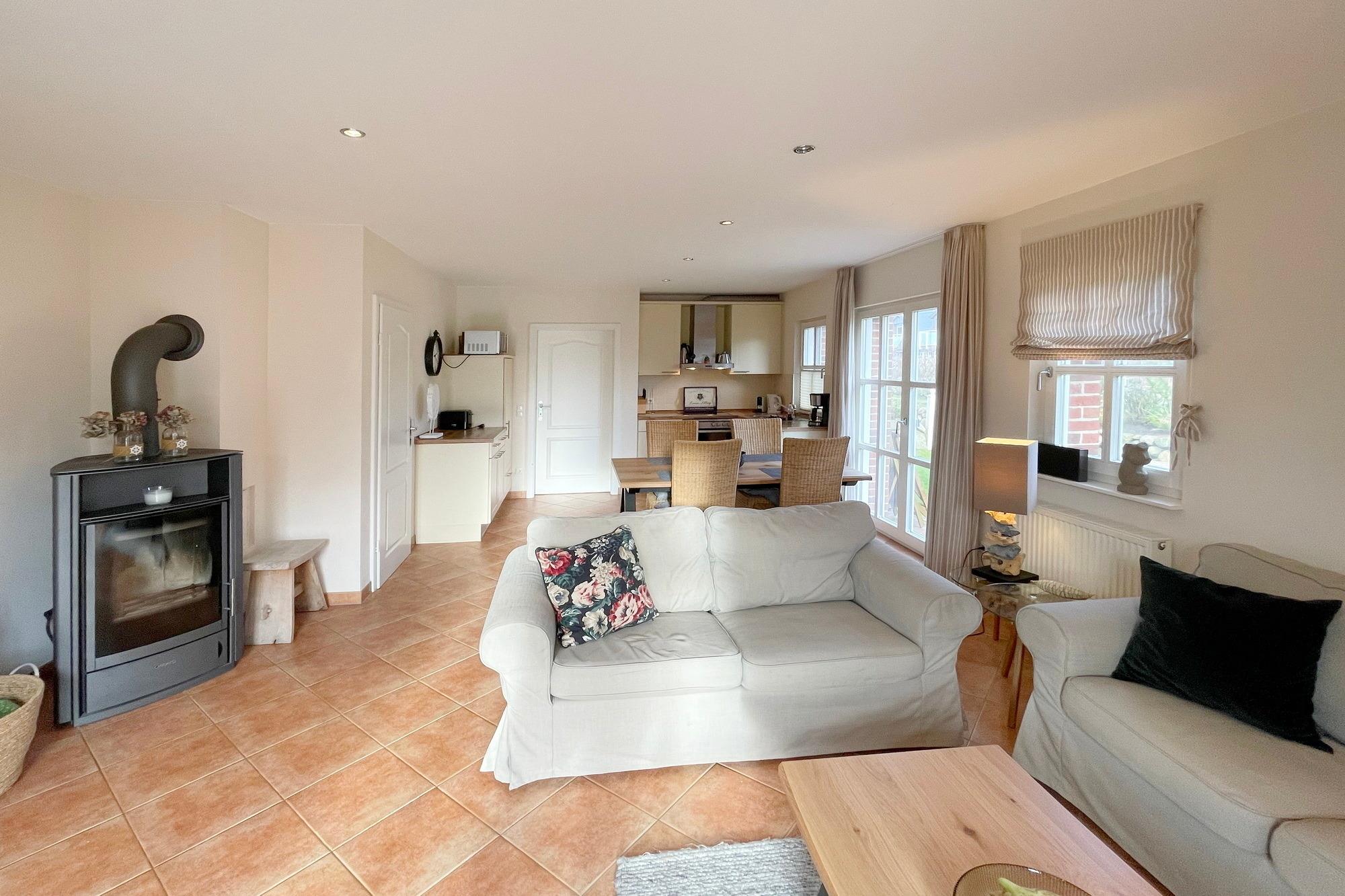 Reihenendhausteil mit 2 Terrassen in zentraler, strandnaher Lage, Wohnzimmer mit Sitzgruppe und Eßecke, Kaminofen, Fernseher (Smart-TV[nbsp] offene Küche mit Geschirrspüler und Backofen, 2 Bäder mit Waschbecken und WC, 2 Schlafzimmer mit Doppelbett für je 2 Personen, Waschmaschine und Trockner