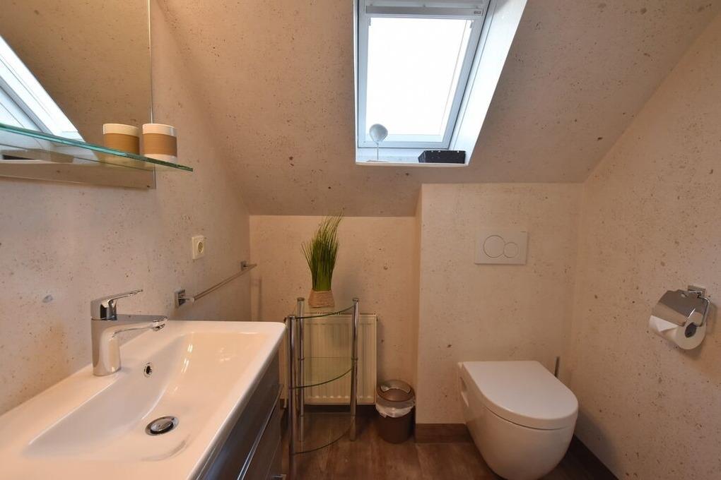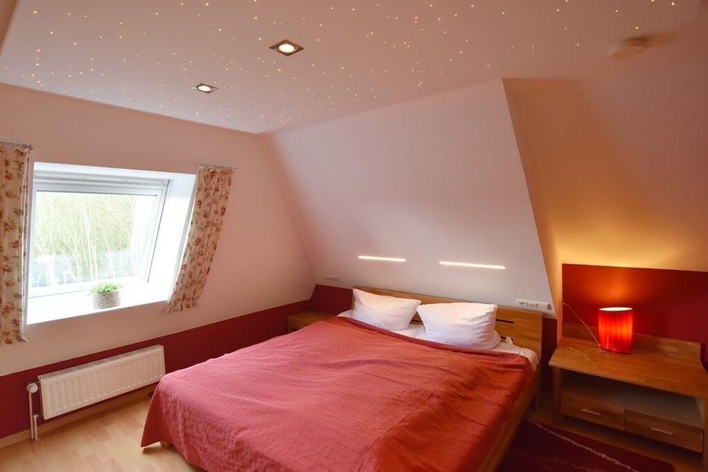Moderne Ferienwohnung ( OG / DG )mit Balkon, Wohnzimmer mit gemütlicher Sitzgruppe und Eßecke, offene Küche mit Cerankochfeld, und Geschirrspüler, Smart-TV, 2 Schlafzimmer für je 2 Personen ( 1x Doppelbetten, 2x Einzelbetten ) mit jeweils eigenem Badezimmer mit Dusche WC und Waschbecken, im UG befinden sich für die Gäste des Hauses Waschmaschine und Trockner gegen Gebühr. 1 PKW-Stellplatz auf dem Grundstück. Für die Gäste im Ruusenhüs steht ein gemeinschaftlich genutztes Gartenhaus für Fahrräder zur Verfügung. Gerne dürfen Sie hier ein gut erzogenes Haustier mitbringen. Dafür wird dann eine einmalige Haustiergebühr berechnet.