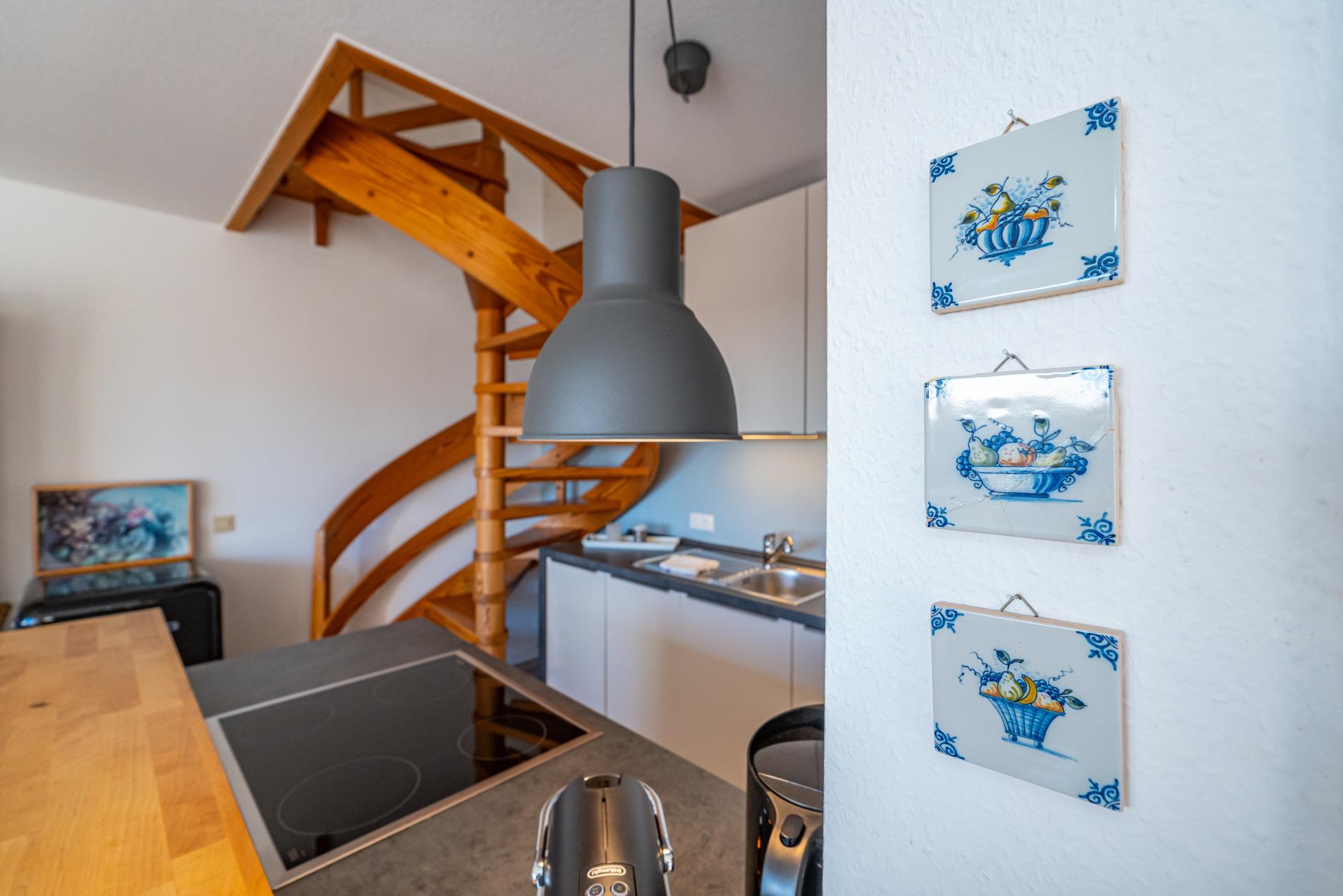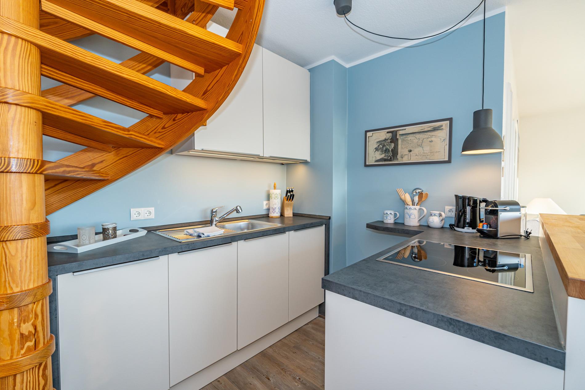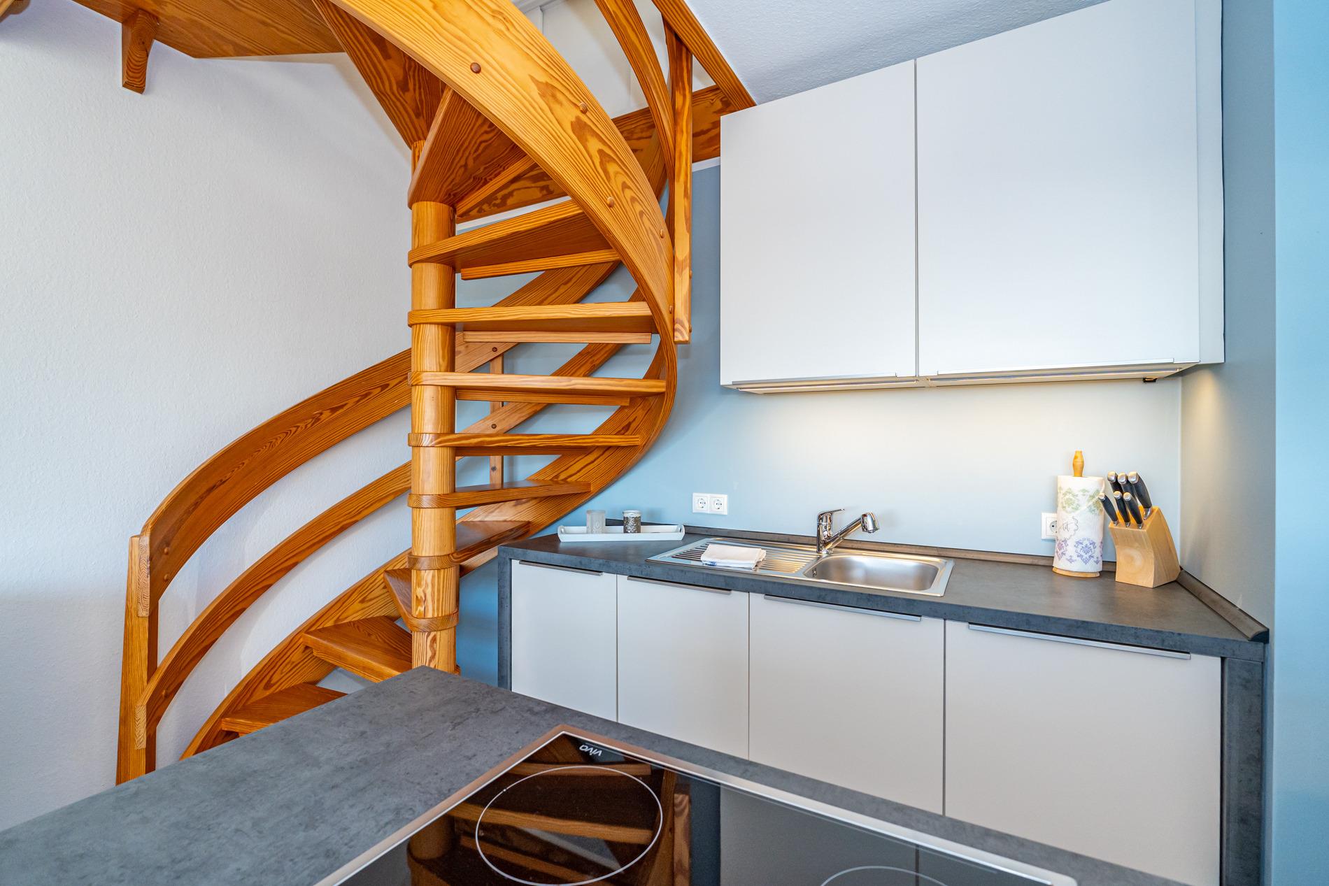 Beim Betreten gelangen Sie über die Diele in den kombinierten Wohn-/Schlafraum sowie in das helle Duschbad/WC. Auf der unteren Ebene befindet sich ein separater Schlafbereich mit einem fest installierten Boxspringbett (Liegefläche 1,60 x 2,00 m) und einem Fenster, das für reichlich Tageslicht sorgt. Der gemütliche Wohnbereich bietet einen separaten Essplatz, zwei bequeme Sessel, einen Kabel-Flachbild-TV, ein CD-Radio und WLAN. Die moderne offene Einbauküche ist voll ausgestattet mit Geschirrspüler, Backofen, Ceranfeld (4 Kochfelder), Kühlschrank mit 3-Sterne-Gefrierfach und Nespressomaschine. Zur Grundausstattung zählen zudem Kaffeemaschine, Wasserkocher und Toaster. Ein lichtundurchlässiger Vorhang ermöglicht es, den Schlafbereich elegant vom Wohnbereich abzugrenzen.