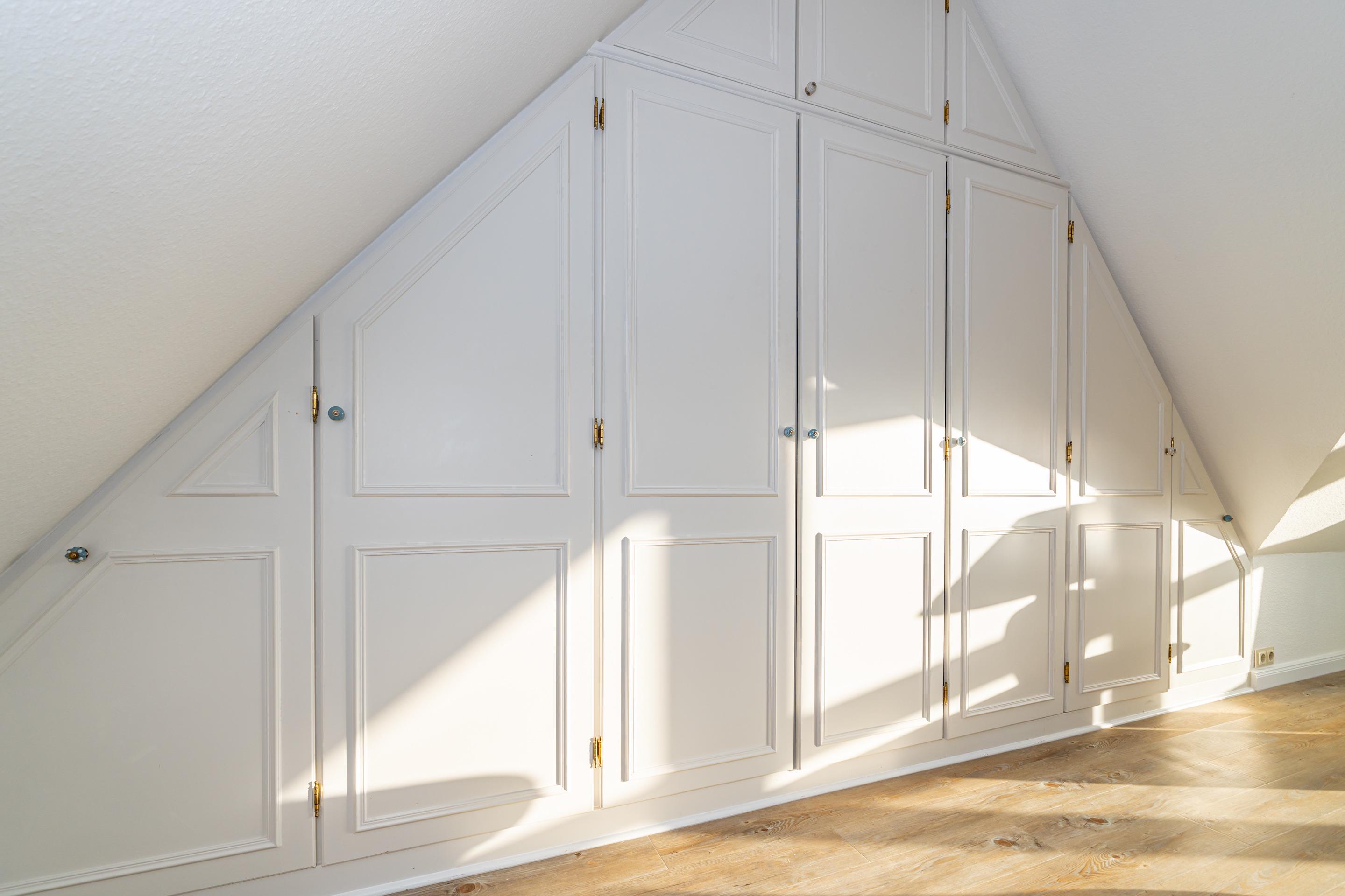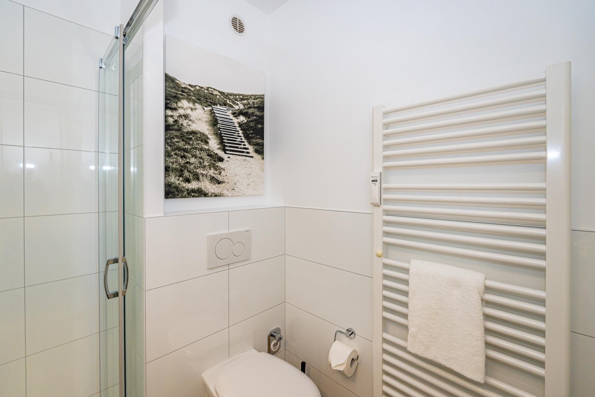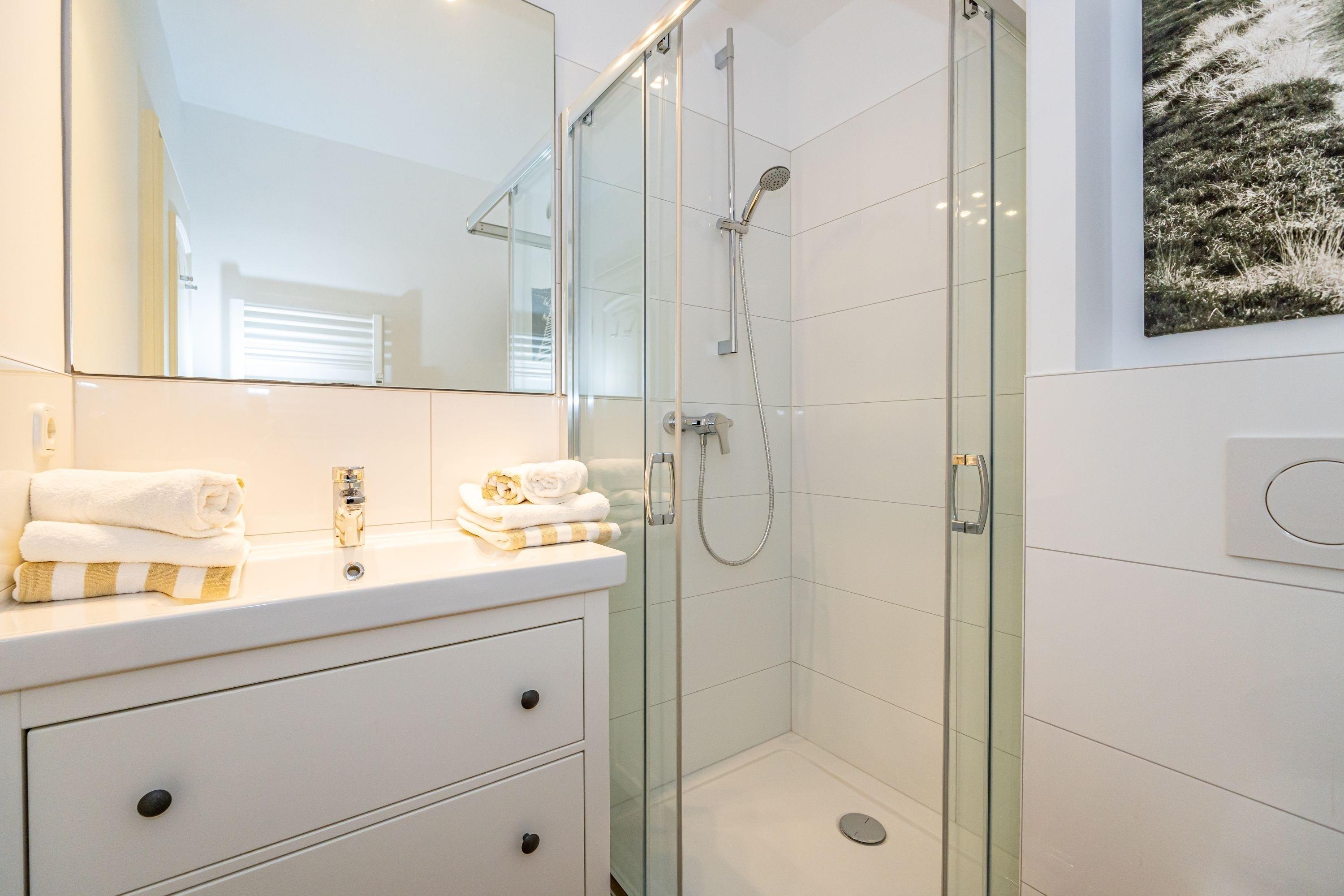 Das helle Duschbad/WC verfügt über Dusche, Waschtisch, Handtuchtrockner und WC. Über eine begehbare Treppe erreichen Sie den Spitzboden, der mit einem großzügigen Kleiderschrank ausreichend Platz bietet, um Koffer, einen Wäscheständer und weitere Utensilien unterzustellen.