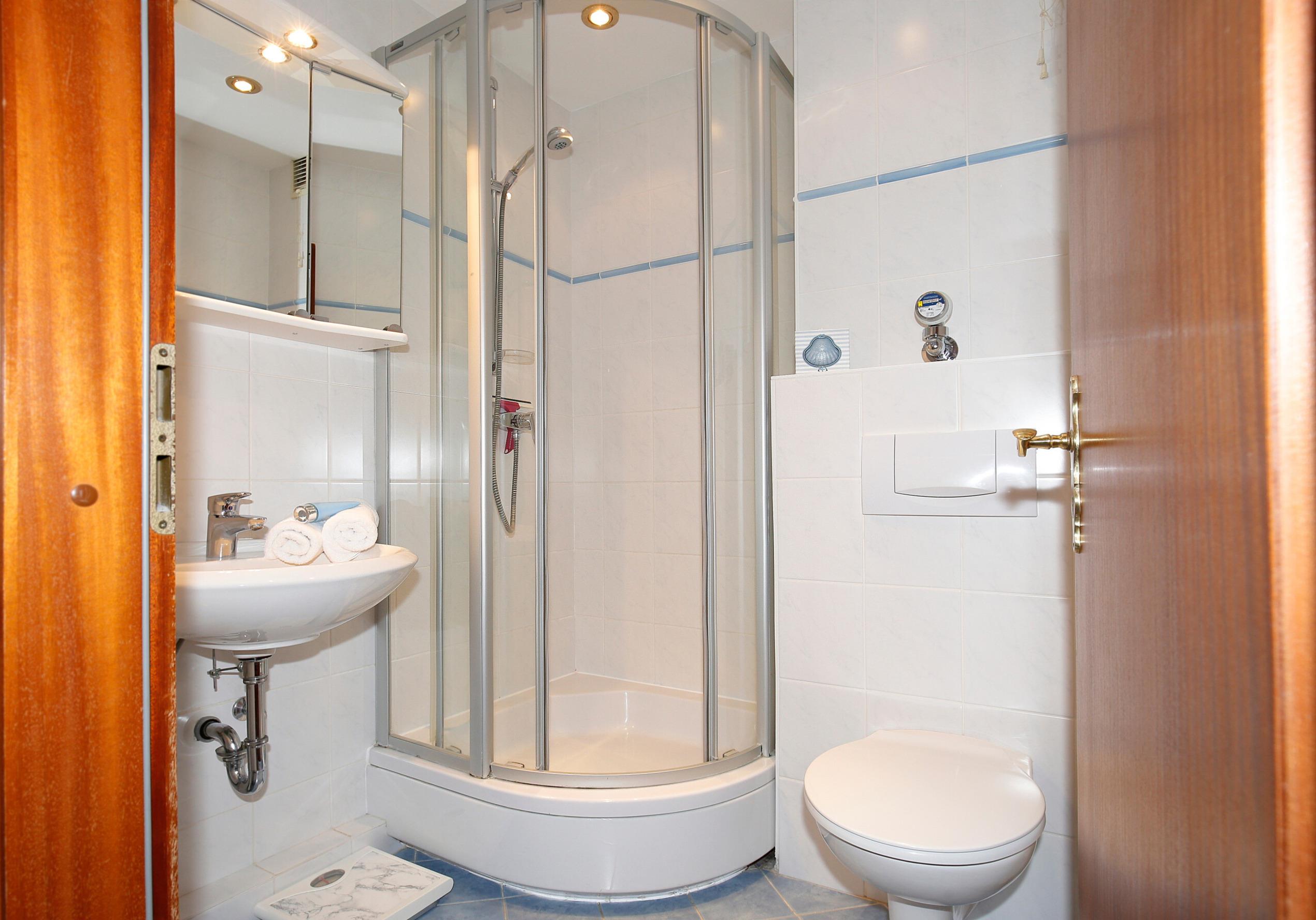 Die zum Wohnbereich offene Kochnische ist voll ausgestattet mit einem Geschirrspüler, einer Mikrowelle, einem Ceranfeld mit 4 Kochfeldern, einem Kühlschrank mit 3-Sterne-Gefrierfach und einem Fenster. Zur Grundausstattung zählen zudem Kaffeemaschine, Wasserkocher und Toaster. Das gemütliche Schlafzimmer ist mit einem Doppelbett eingerichtet, während das Badezimmer über eine Dusche, ein WC und einen Waschtisch verfügt.