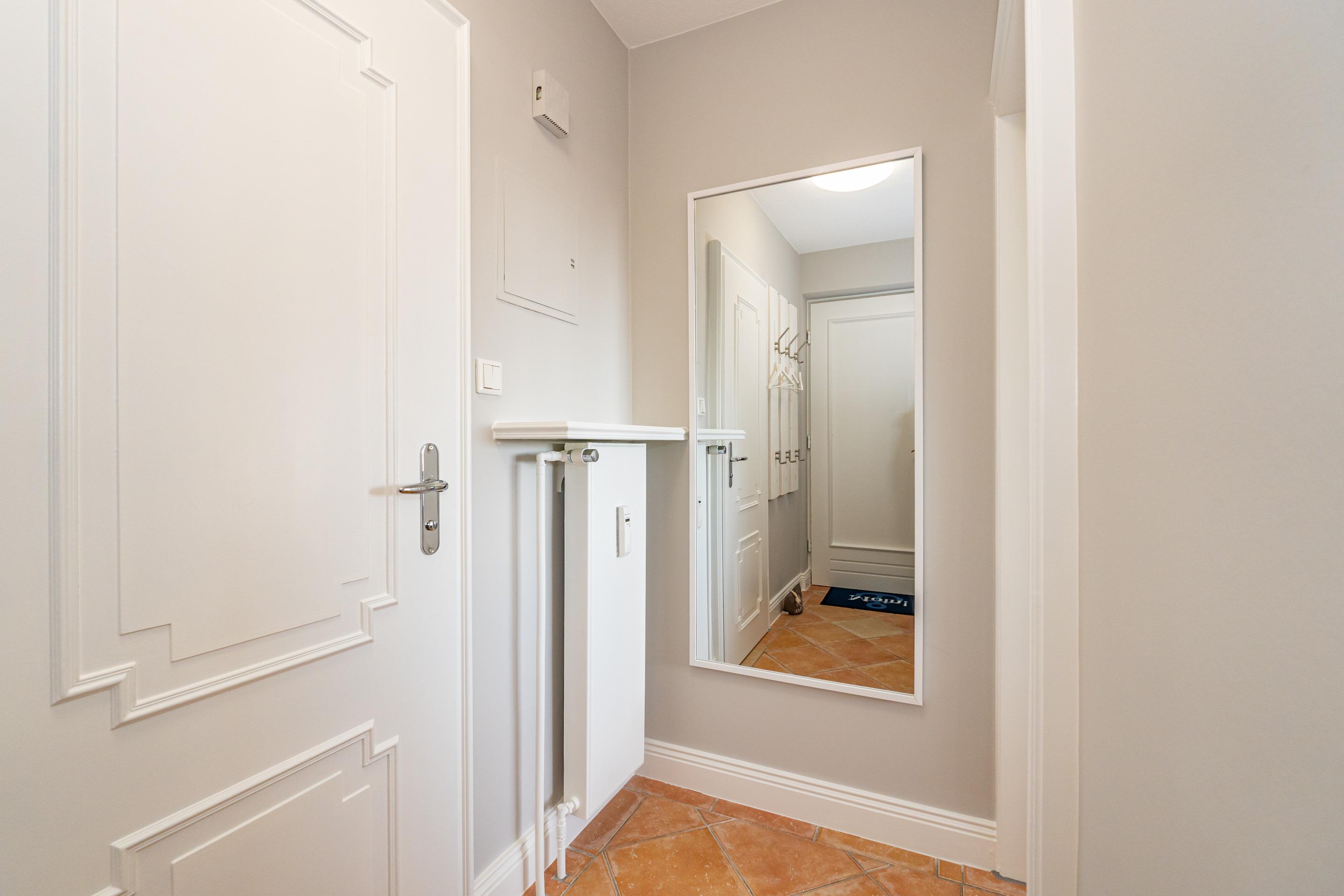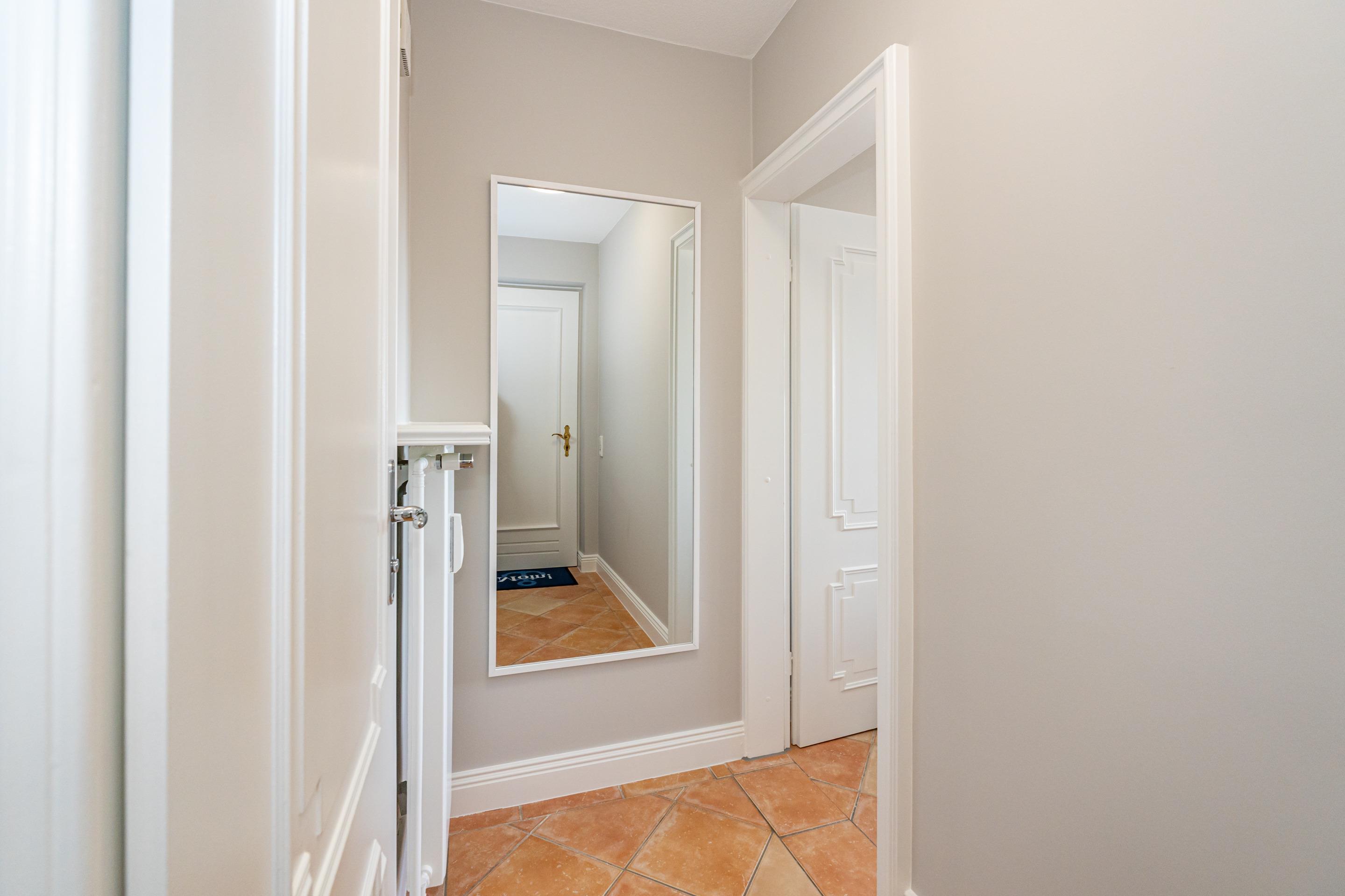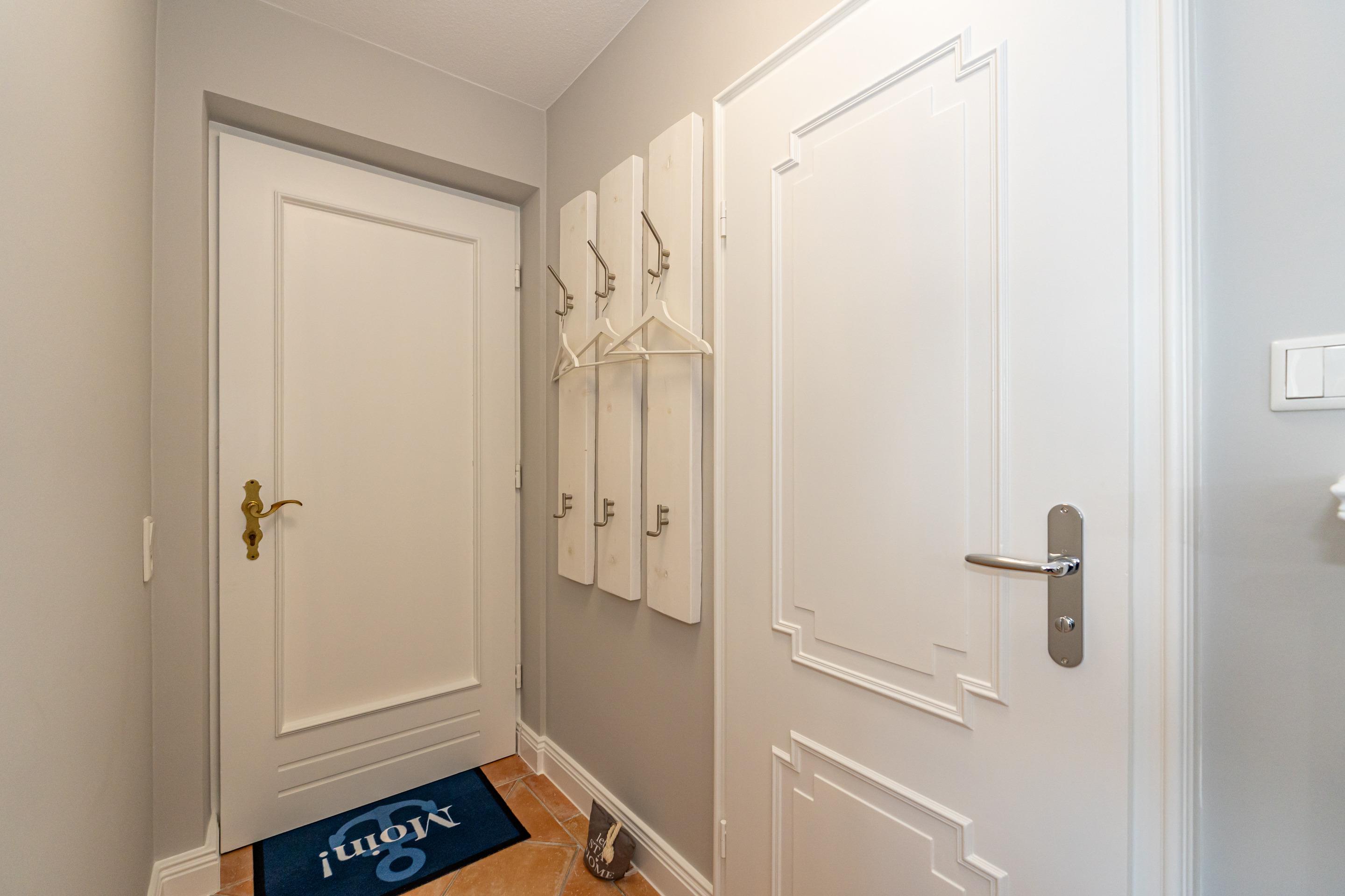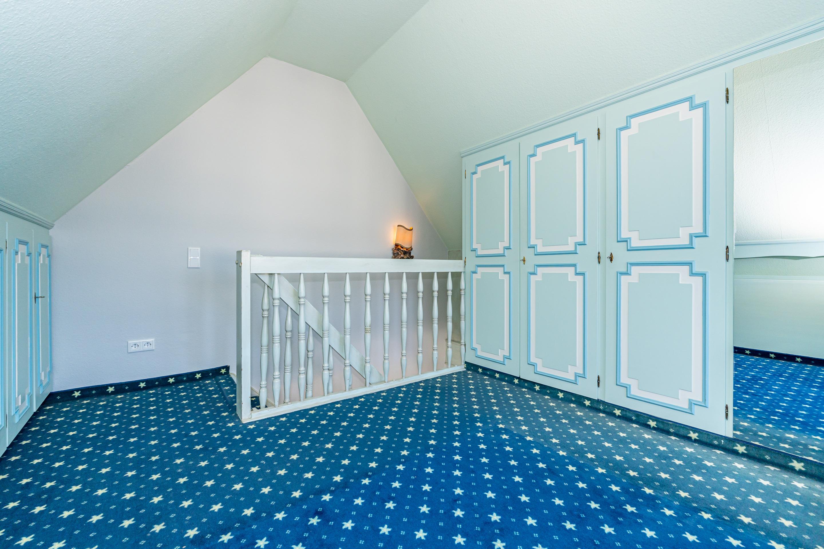Das neuwertige Badezimmer mit Natursteinboden mit Dusche (extraflacher Einstieg), Waschtisch, Handtuchtrockner, Fön, WC und Fenster lässt Sie perfekt in den Urlaubstag starten. Über eine bequem begehbare Treppe gelangen Sie auf die offene Empore, die mit Teppichboden ausgelegt ist und Ihnen mit einem großzügigen Kleiderschrank sowie kleineren Nebenschränken ausreichend Stauraum bietet – ideal, um Koffer und weiteres Gepäck unterzustellen.