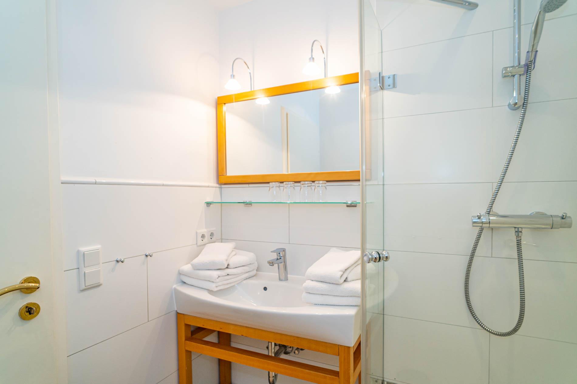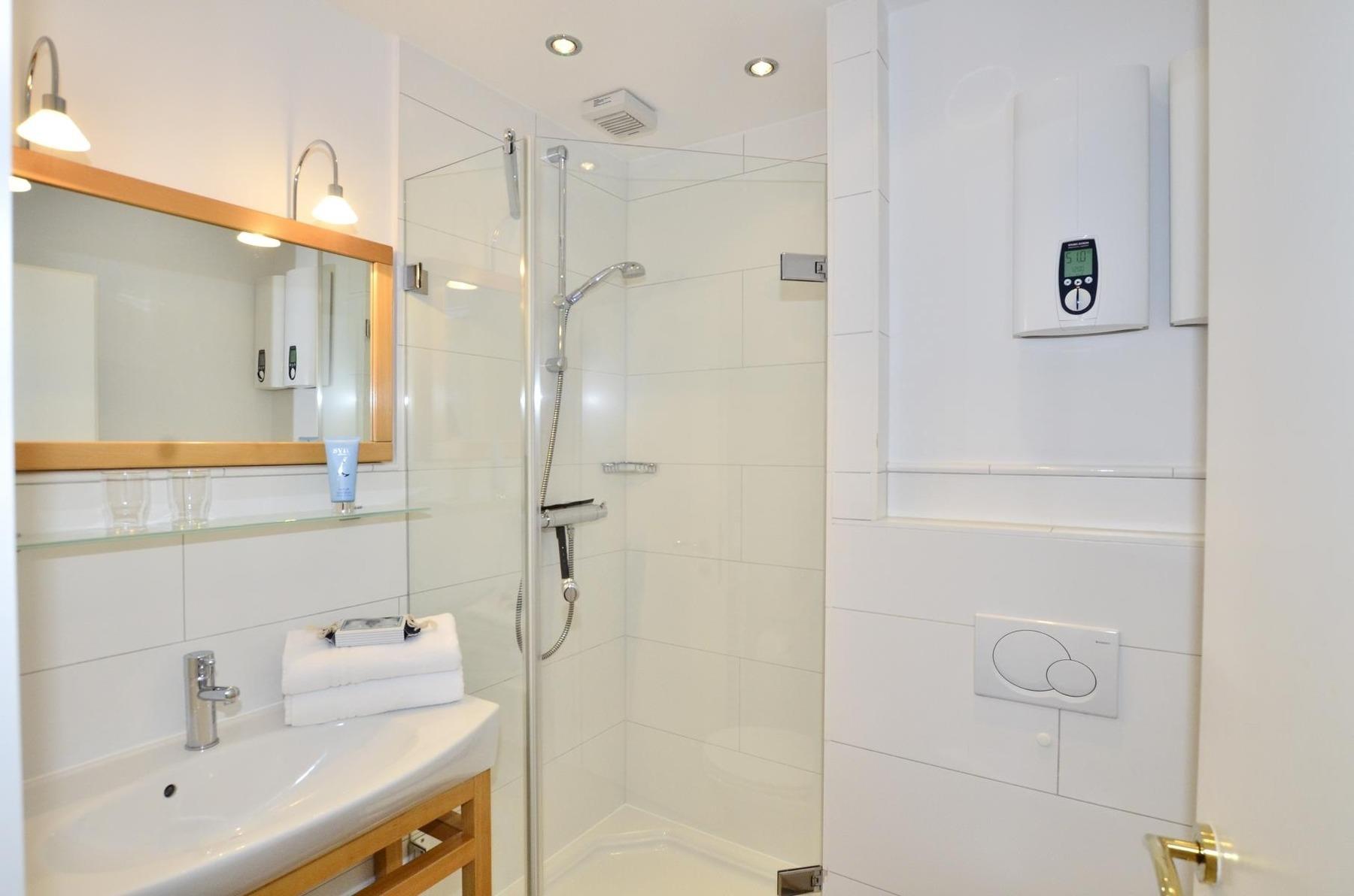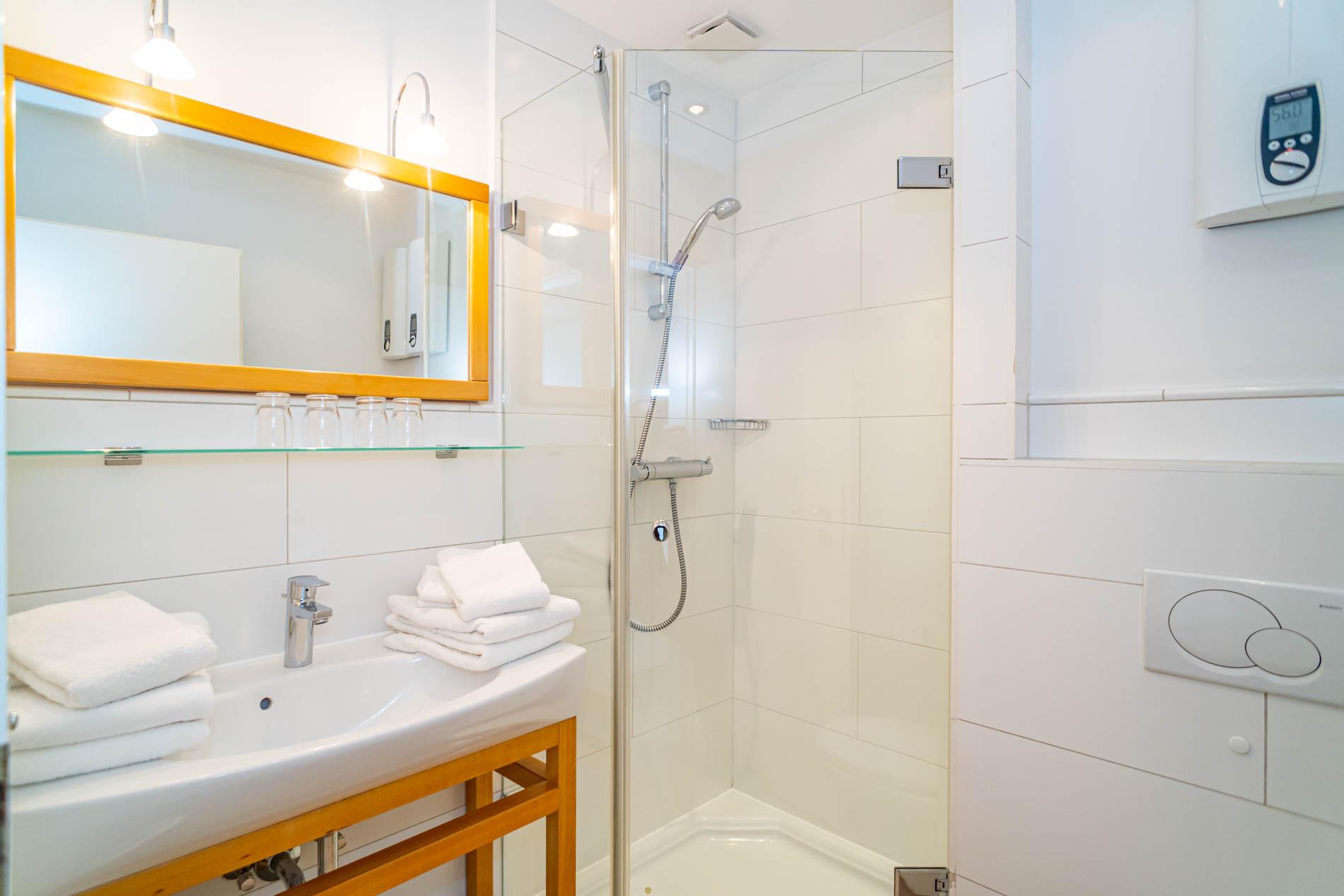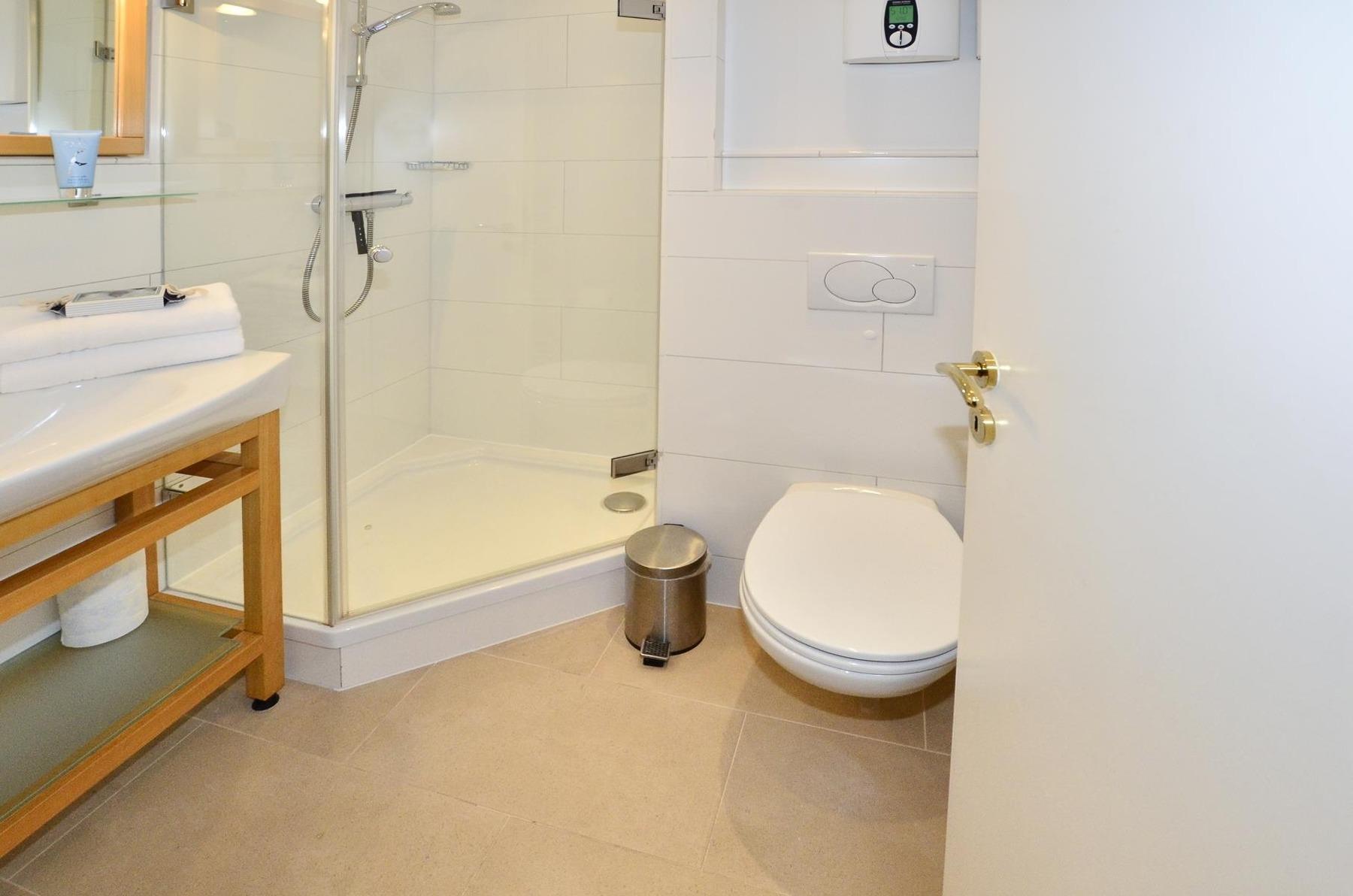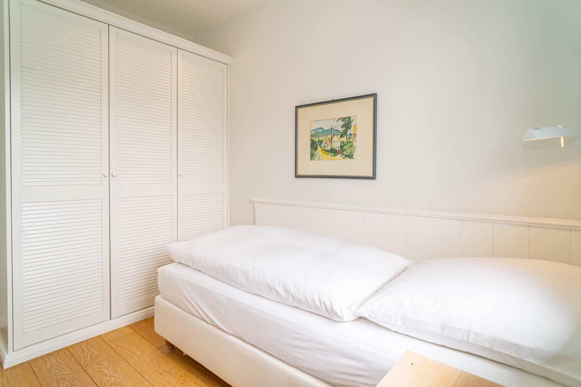 Im separaten Schlafzimmer mit hellem Eichenholzboden stehen zwei bequeme Einzelbetten (jeweils 0,90 x 2,00 m), die für erholsamen Schlaf sorgen. Das moderne Badezimmer ist mit einer Dusche, einem Waschtisch, einem Handtuchtrockner und einem WC ausgestattet.